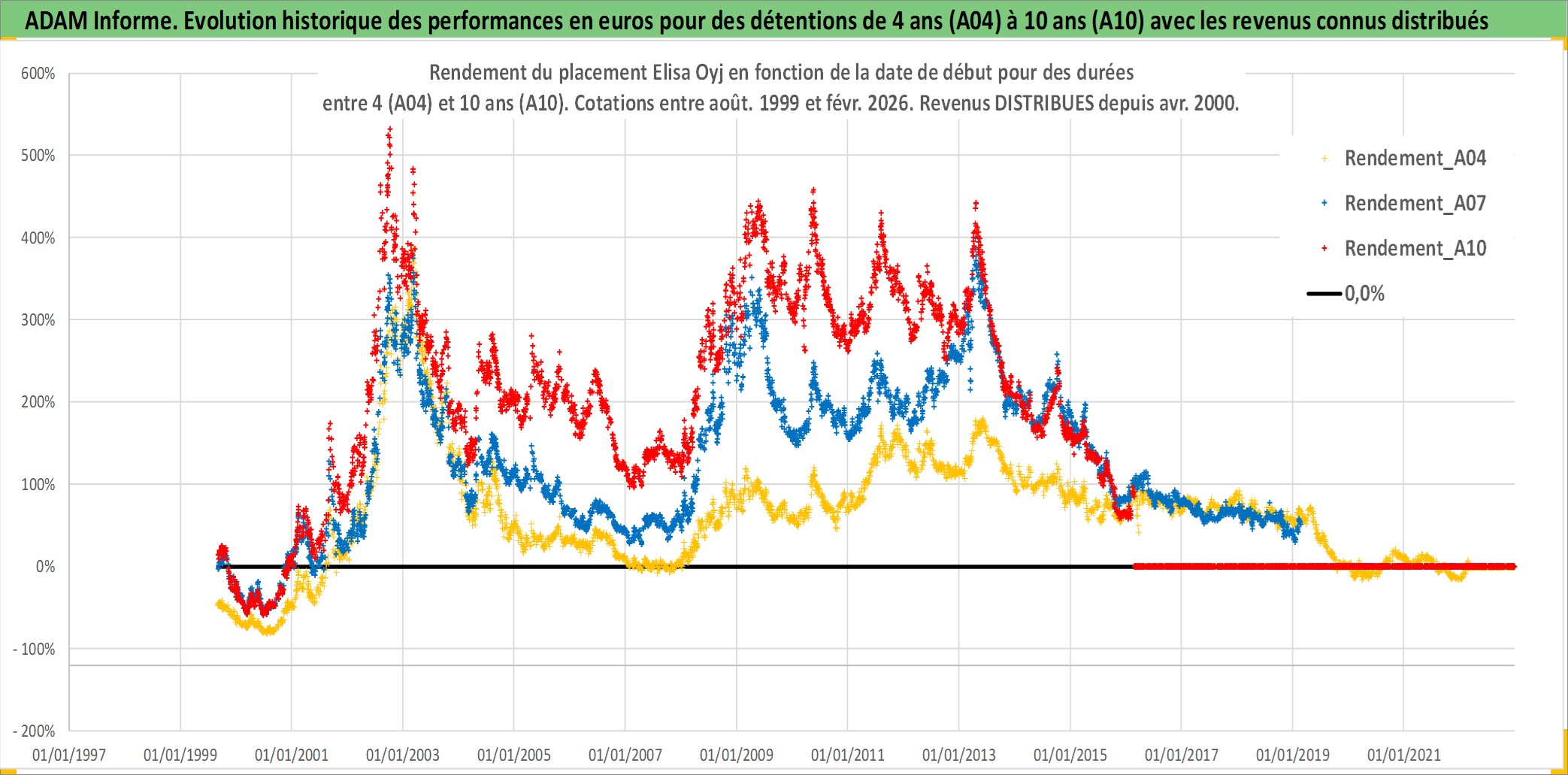 Site dédié aux investisseursPage dédiée sur site financeAnalyse des valorisations hebdomadaires de l'action Elisa Oyj. Cet actif est cote en EUR. Les valorisations couvrent les semaines 1999W32 a 2026W09. Les revenus de cet actif financier sont pris en compte depuis la semaine 2000W15. La note globale ESG de cet actif est estimee a 11.0 (apres rebasage entre 0 et 20).