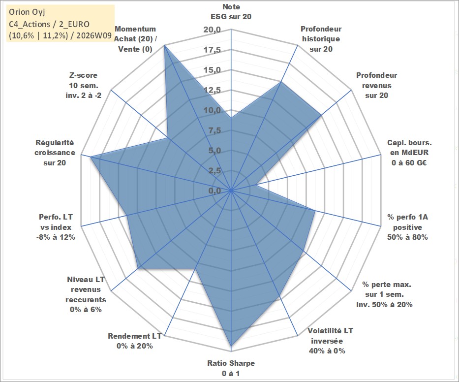 Site dédié aux investisseursPage dédiée sur site financeAnalyse des valorisations hebdomadaires de l'action Orion Oyj. Cet actif est cote en EUR. Les valorisations couvrent les semaines 2004W41 a 2026W09. Les revenus de cet actif financier sont pris en compte depuis la semaine 2005W12. La note globale ESG de cet actif est estimee a 9.0 (apres rebasage entre 0 et 20).