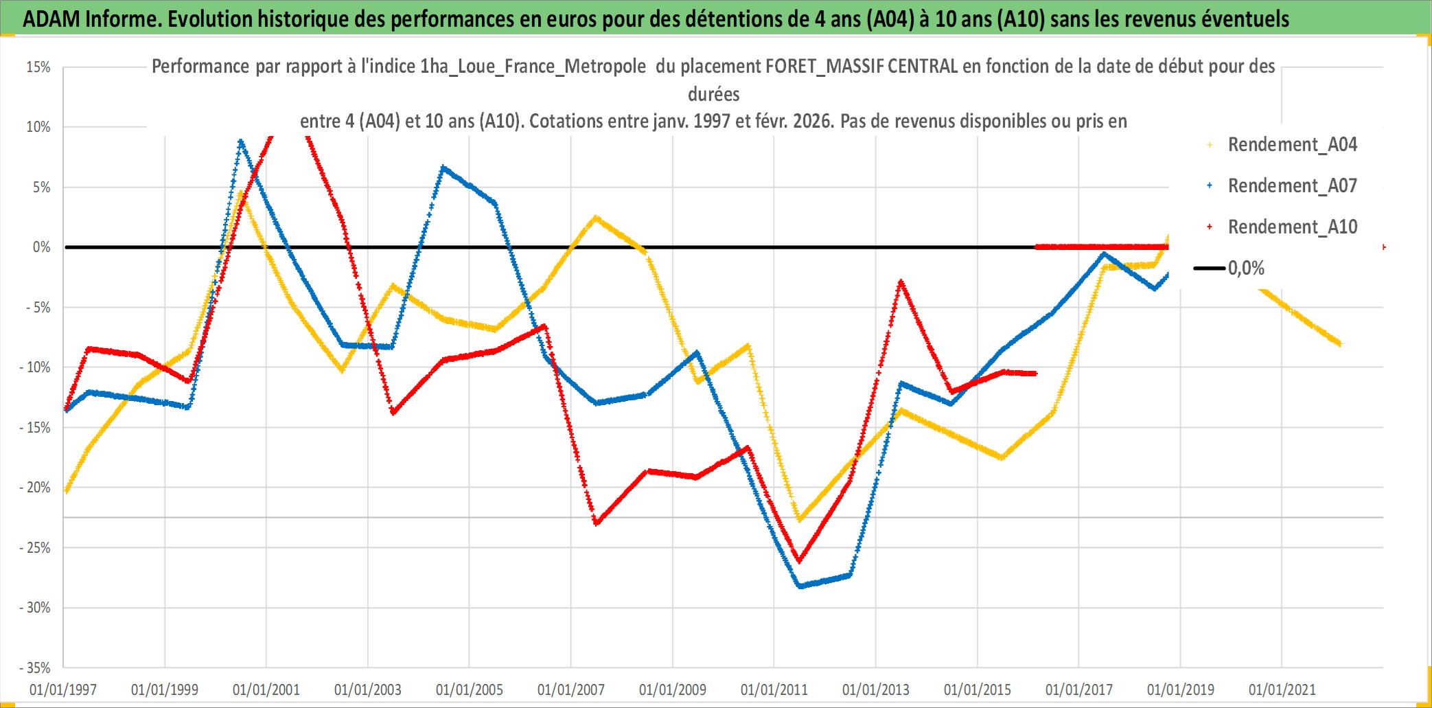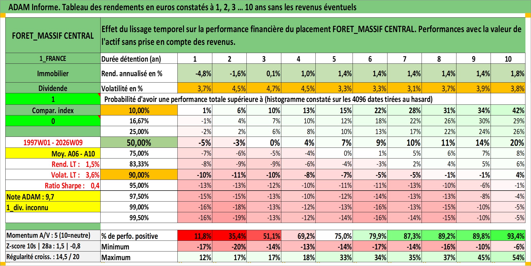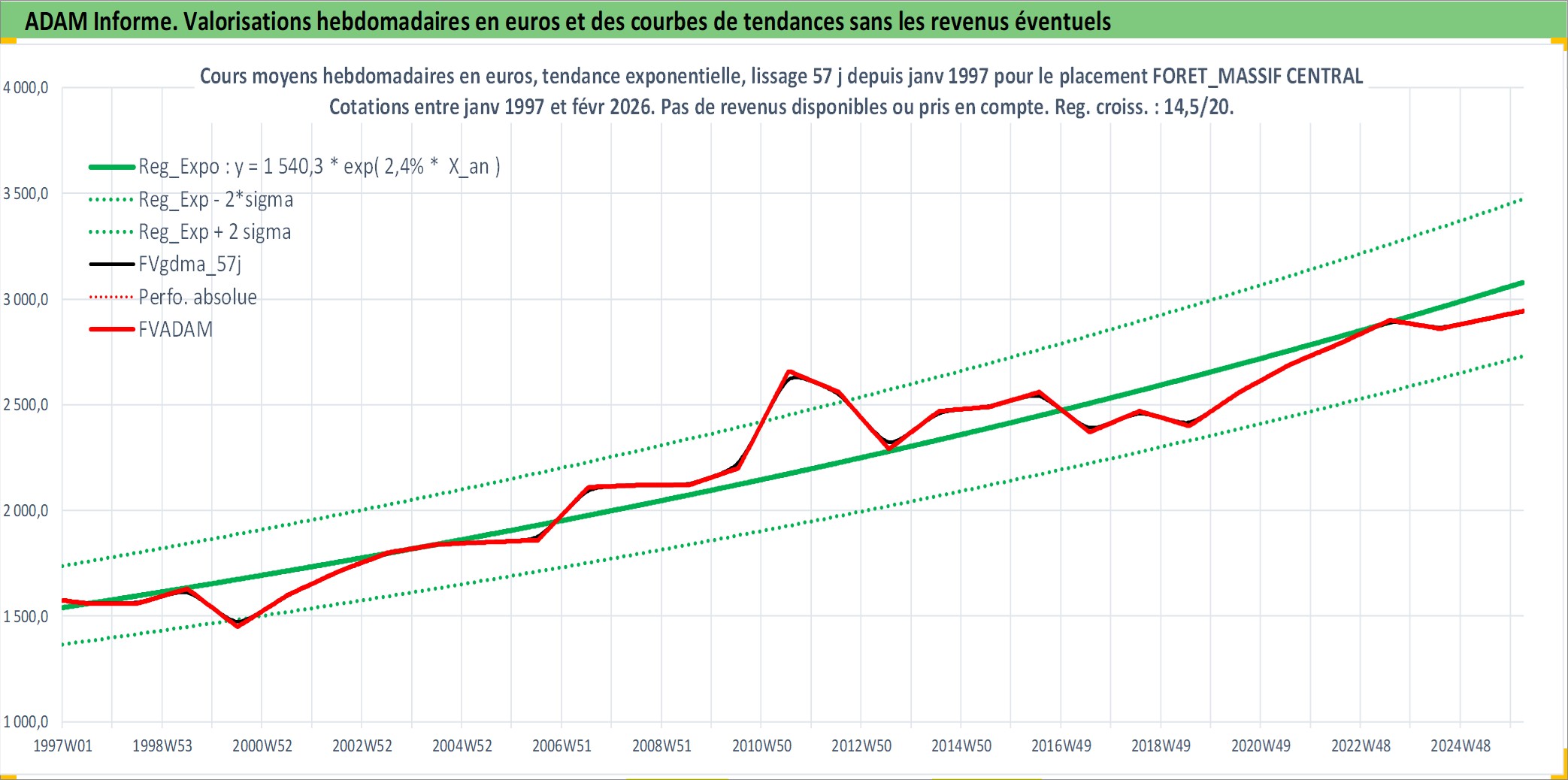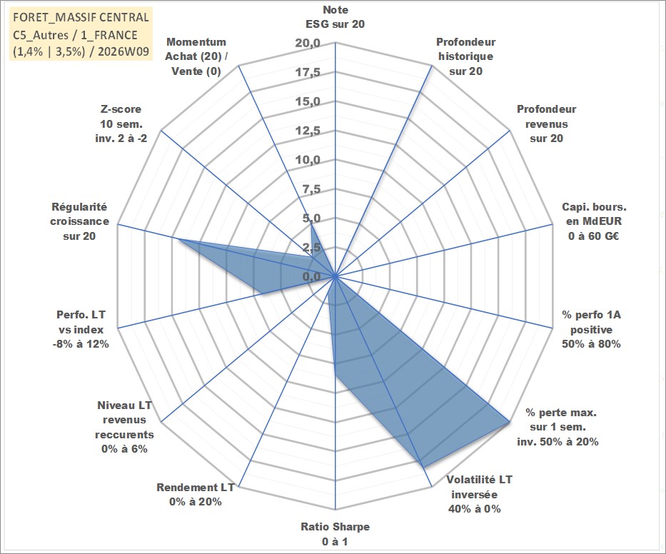 Site dédié aux investisseursPage dédiée sur site financeAnalyse des valorisations hebdomadaires de l'actif FORET_MASSIF CENTRAL. Cet actif est cote en EUR. Les valorisations couvrent les semaines 1997W01 a 2026W09. Les fermages de ce bien foncier sont pris egaux a 2,5% annuels de la valeur venale du bien.