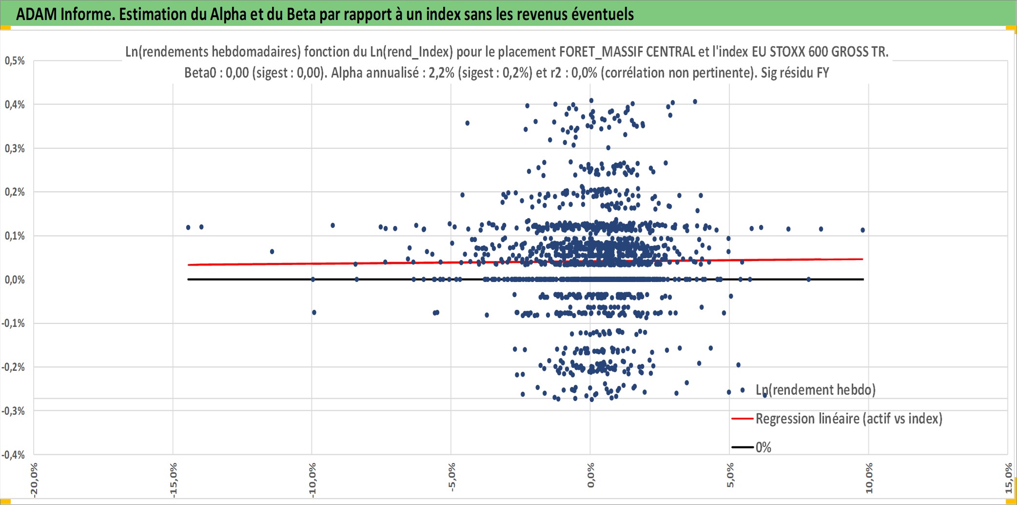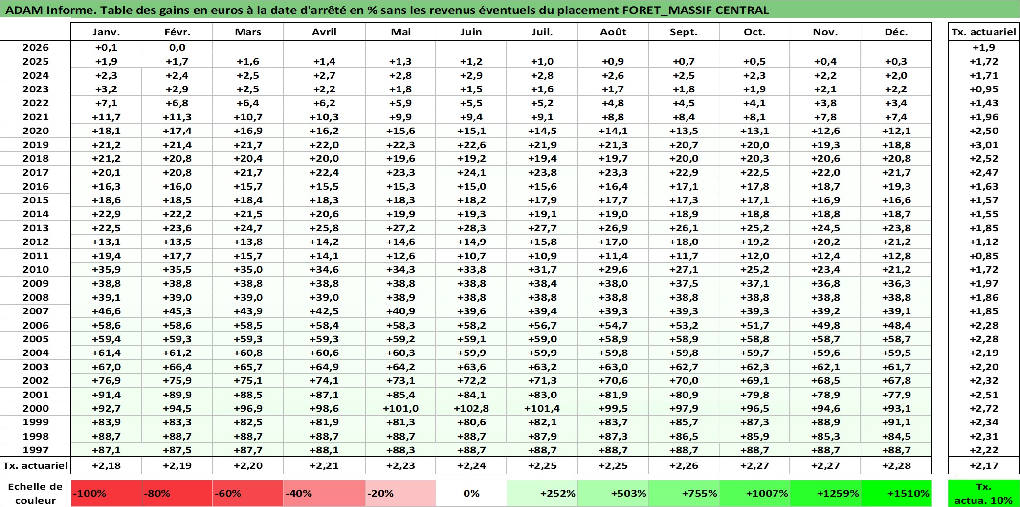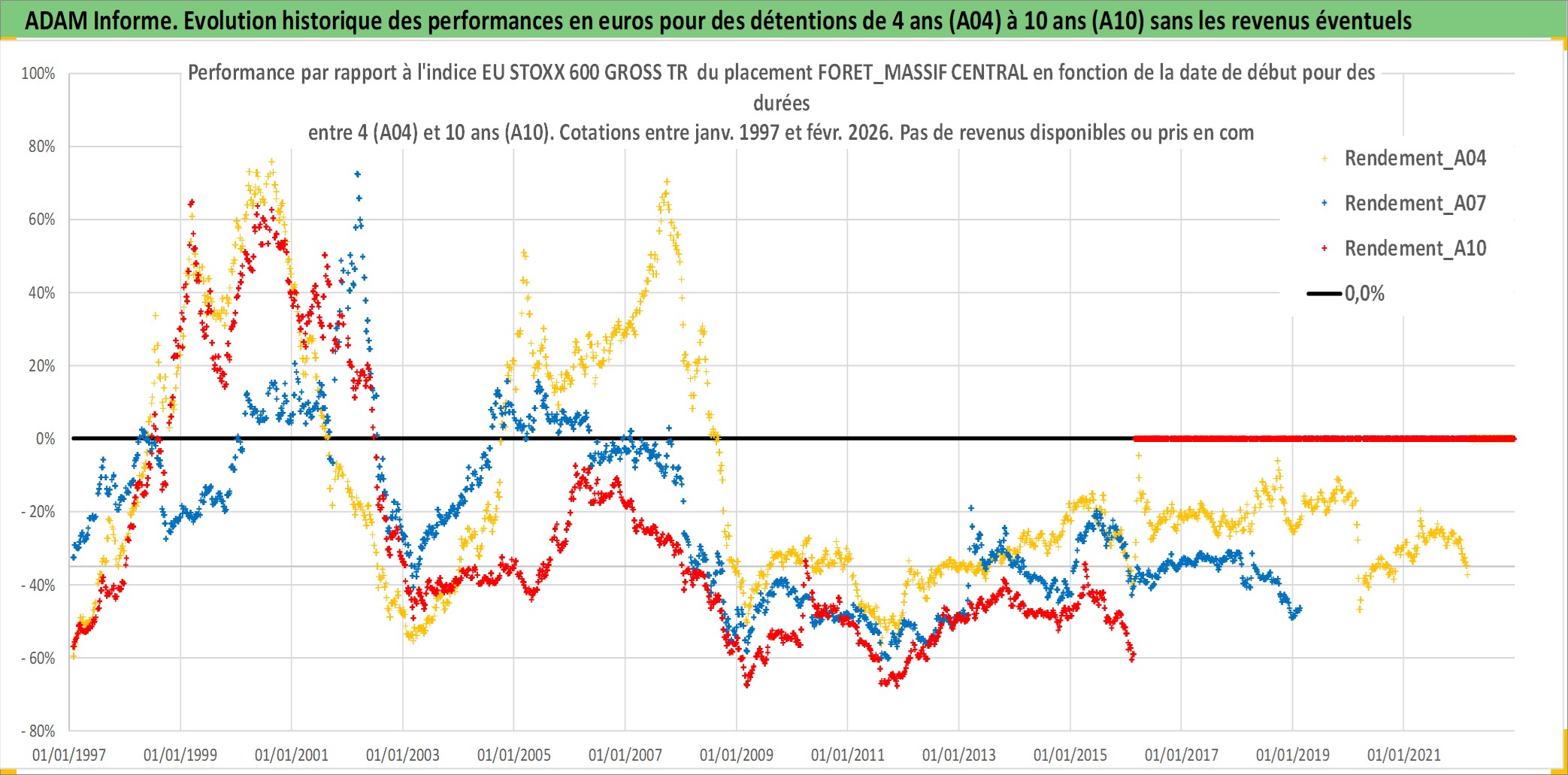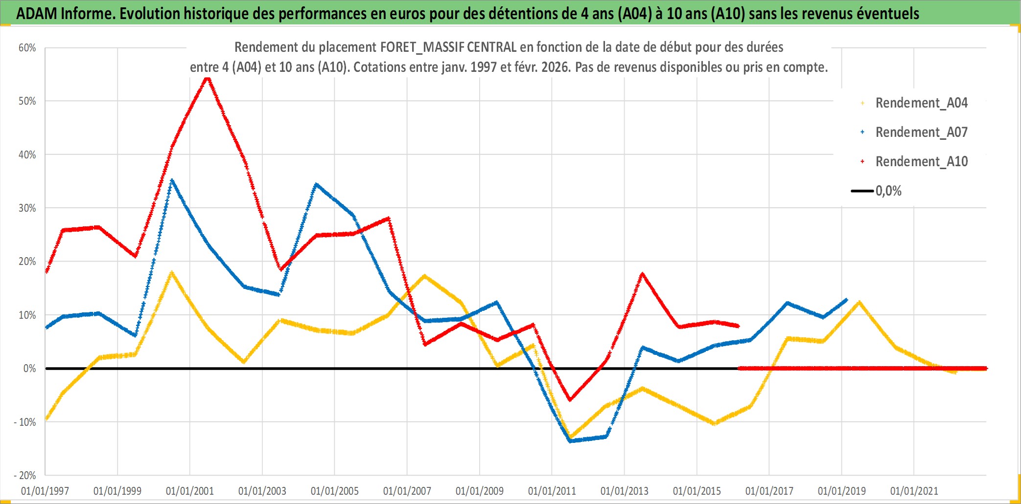 Site dédié aux investisseursPage dédiée sur site financeAnalyse des valorisations hebdomadaires de l'actif FORET_MASSIF CENTRAL. Cet actif est cote en EUR. Les valorisations couvrent les semaines 1997W01 a 2026W09. Les fermages de ce bien foncier sont pris egaux a 2,5% annuels de la valeur venale du bien.