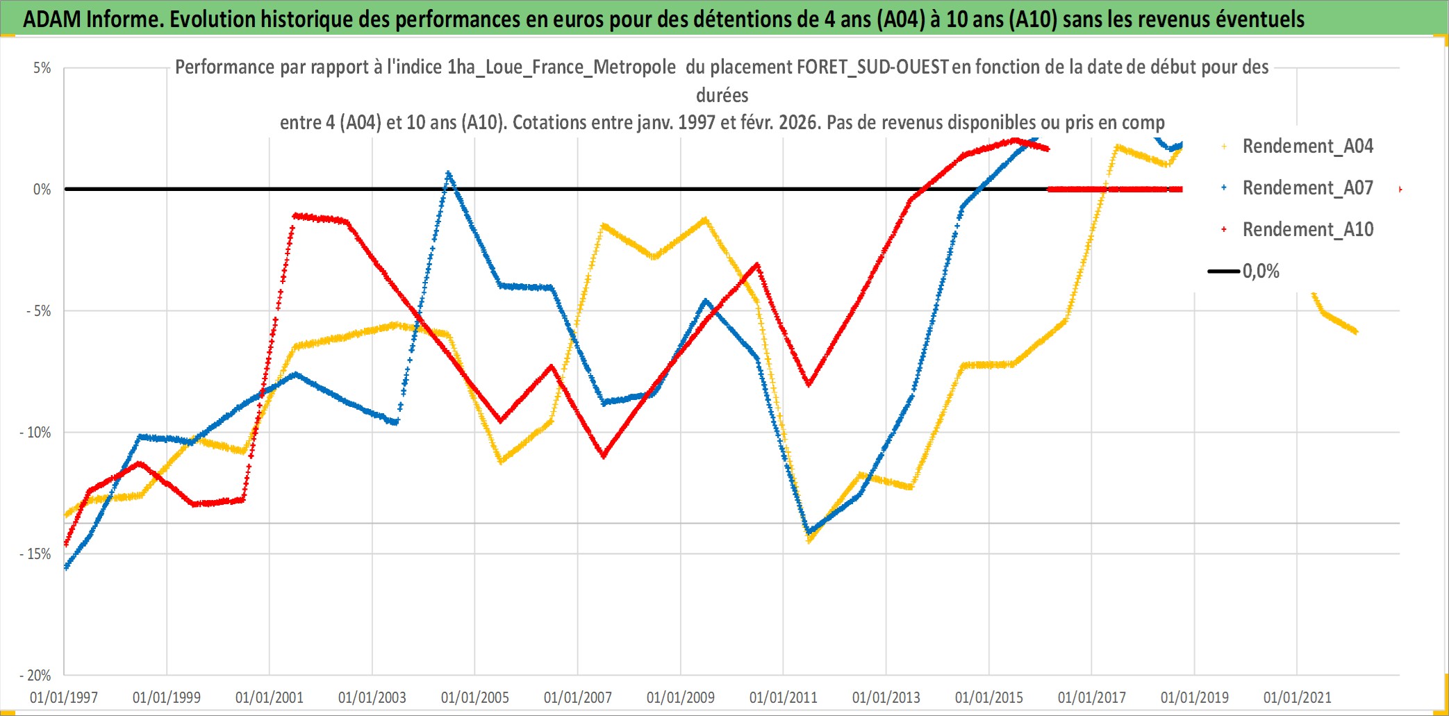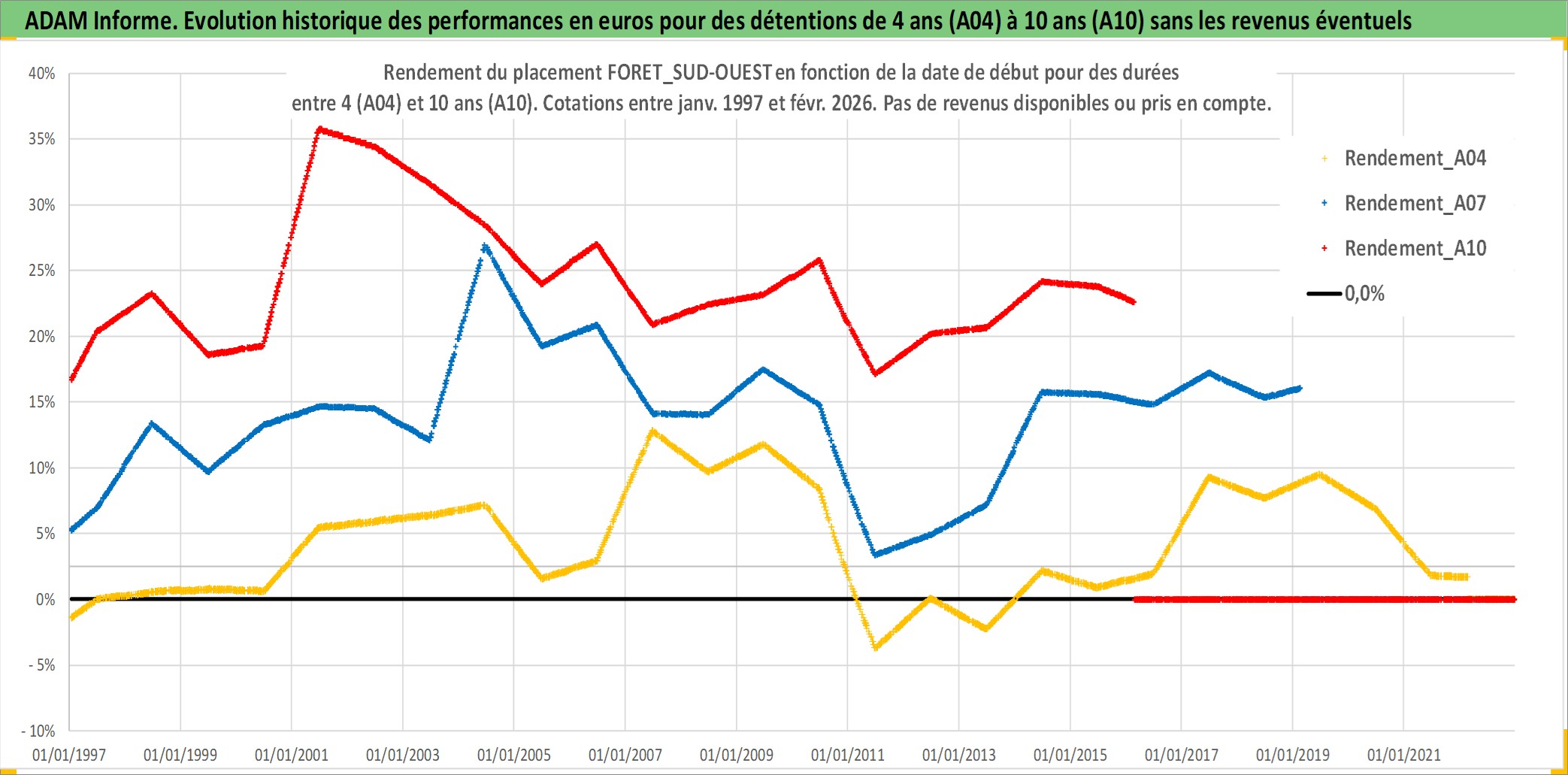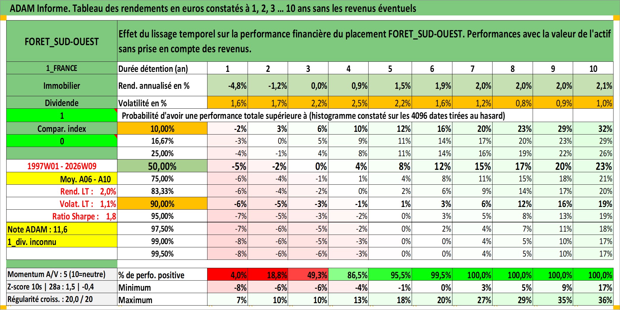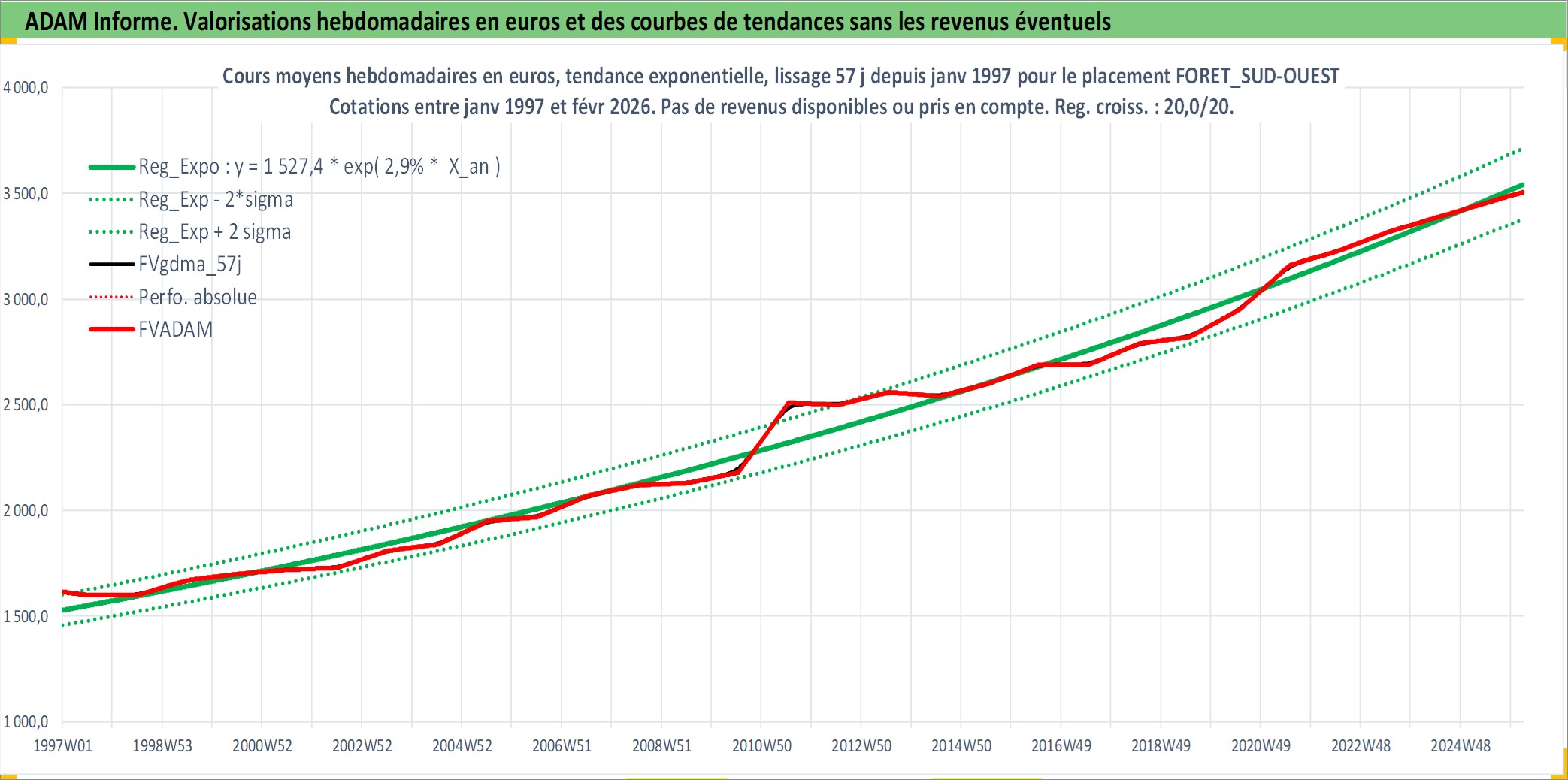 Site dédié aux investisseursPage dédiée sur site financeAnalyse des valorisations hebdomadaires de l'actif FORET_SUD-OUEST. Cet actif est cote en EUR. Les valorisations couvrent les semaines 1997W01 a 2026W09. Les fermages de ce bien foncier sont pris egaux a 2,5% annuels de la valeur venale du bien.