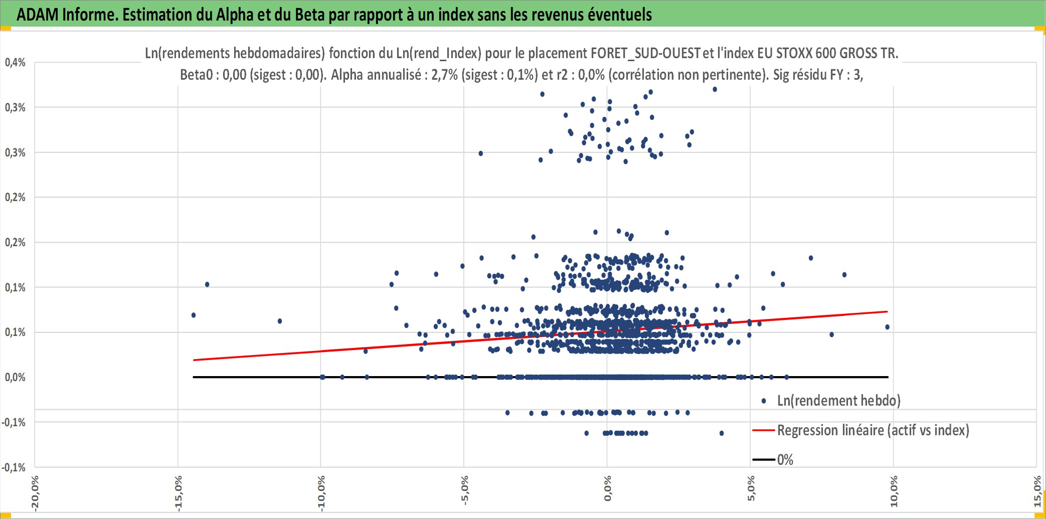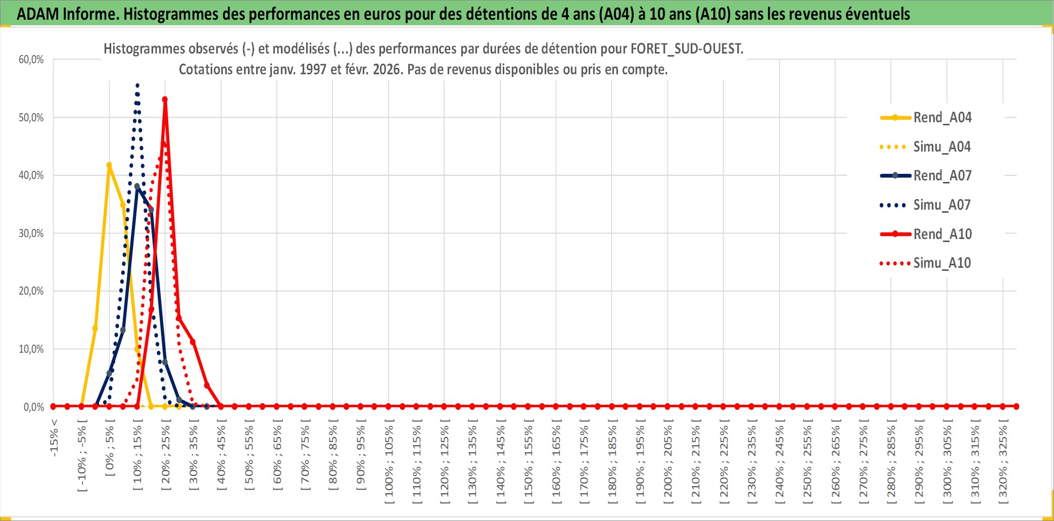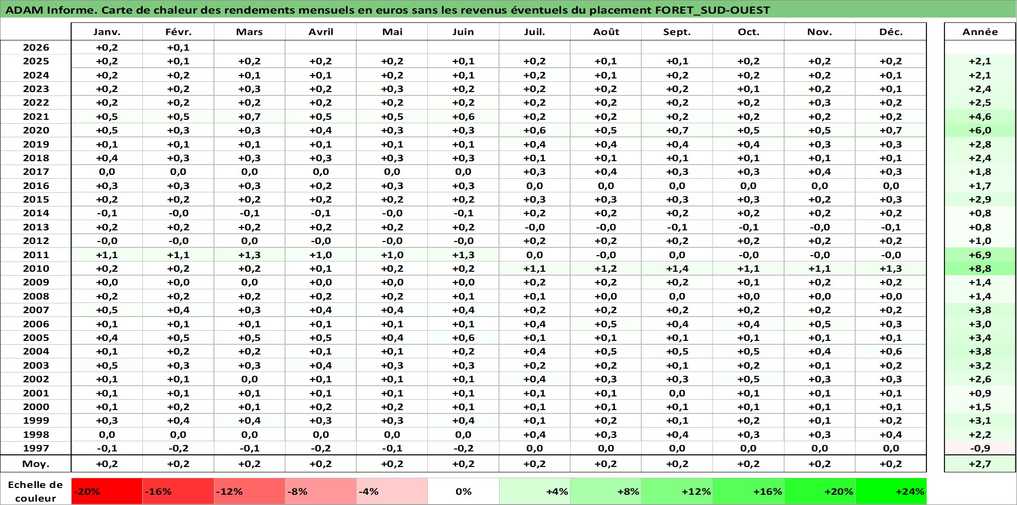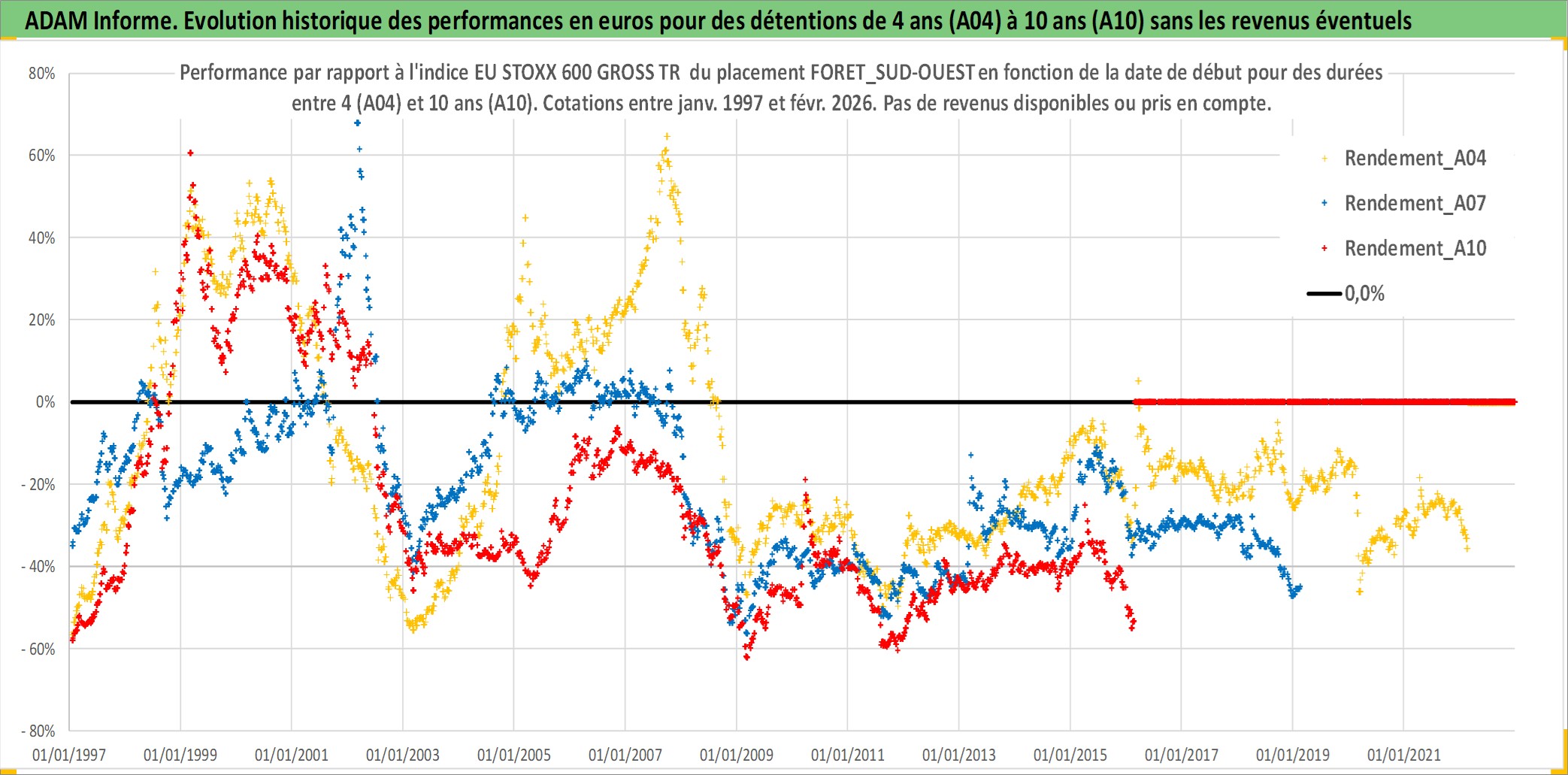 Site dédié aux investisseursPage dédiée sur site financeAnalyse des valorisations hebdomadaires de l'actif FORET_SUD-OUEST. Cet actif est cote en EUR. Les valorisations couvrent les semaines 1997W01 a 2026W09. Les fermages de ce bien foncier sont pris egaux a 2,5% annuels de la valeur venale du bien.