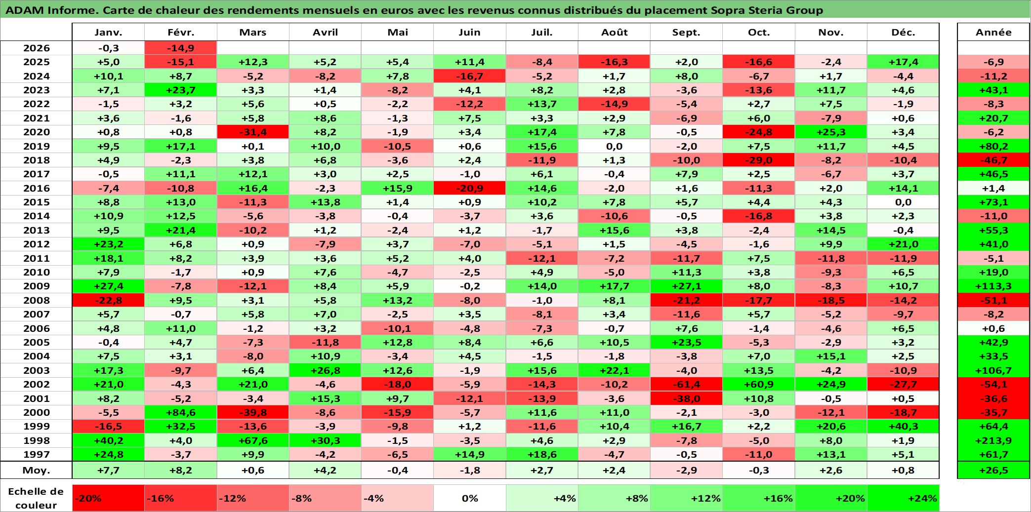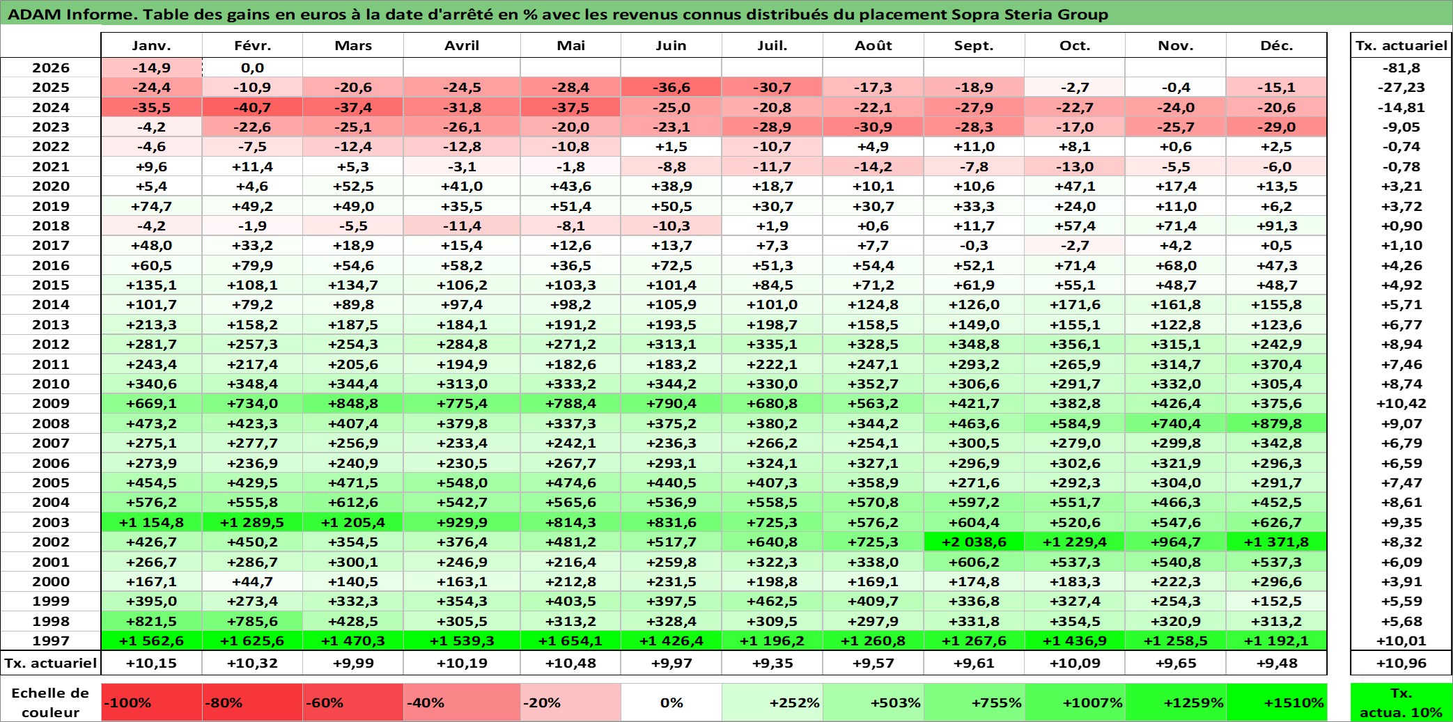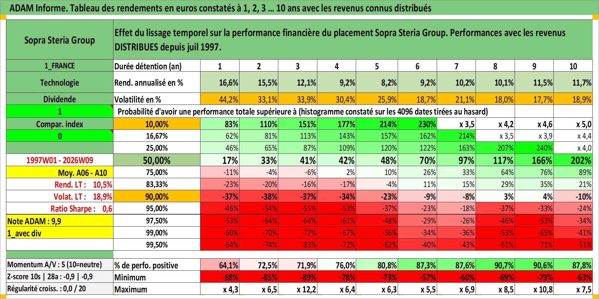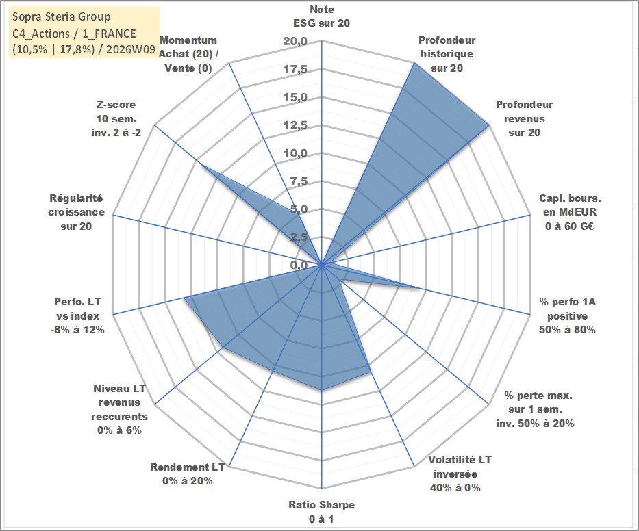 Site dédié aux investisseursPage dédiée sur site financeAnalyse des valorisations hebdomadaires de l'action Sopra Steria Group. Cet actif est cote en EUR. Les valorisations couvrent les semaines 1997W01 a 2026W09. Les revenus de cet actif financier sont pris en compte depuis la semaine 1997W29. La note ESG de cet actif n'est pas connue.