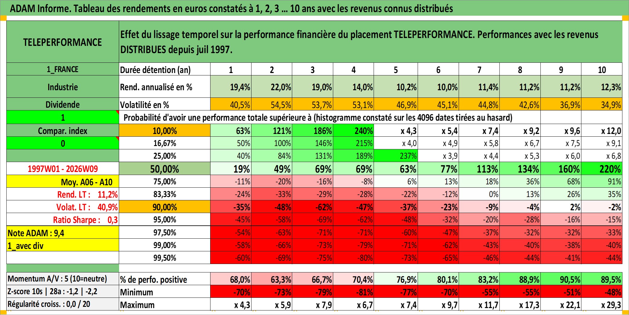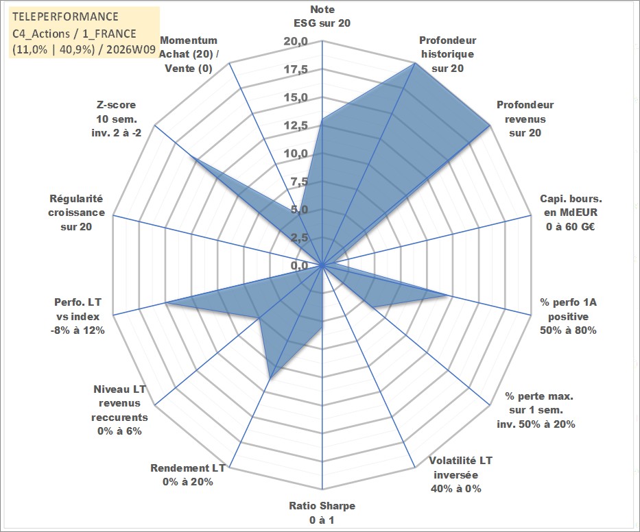 Site dédié aux investisseursPage dédiée sur site financeAnalyse des valorisations hebdomadaires de l'action TELEPERFORMANCE. Cet actif est cote en EUR. Les valorisations couvrent les semaines 1997W01 a 2026W09. Les revenus de cet actif financier sont pris en compte depuis la semaine 1997W29. La note globale ESG de cet actif est estimee a 13.0 (apres rebasage entre 0 et 20).