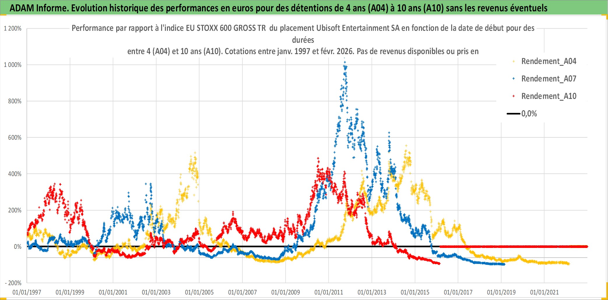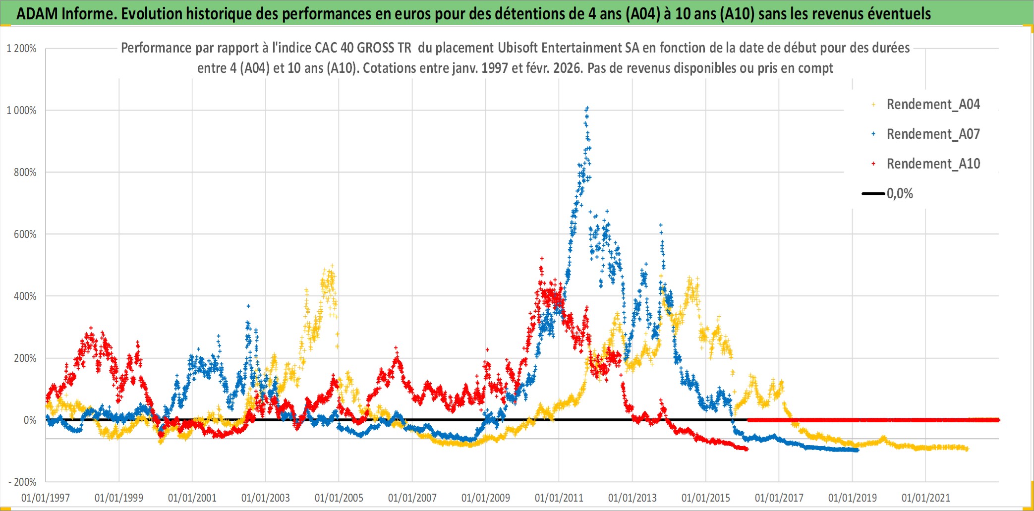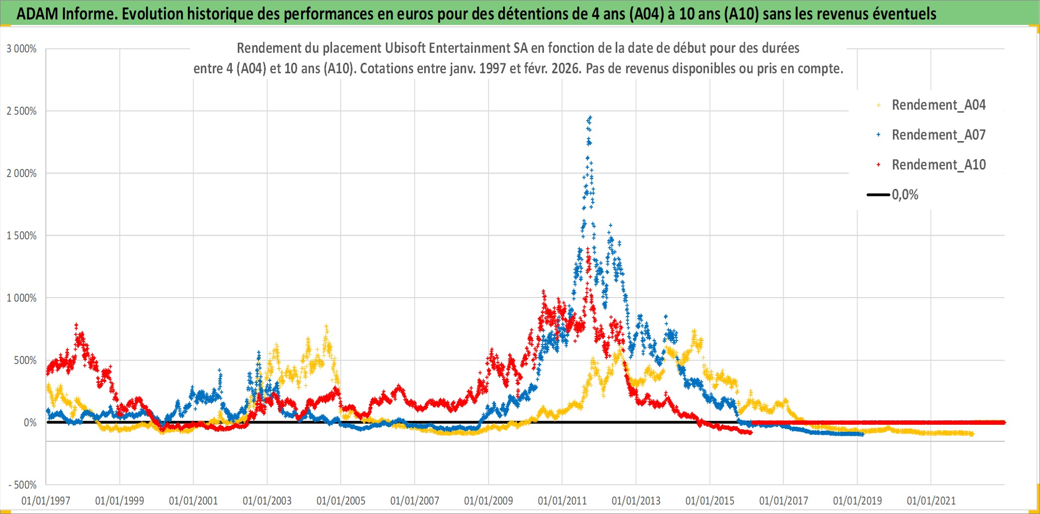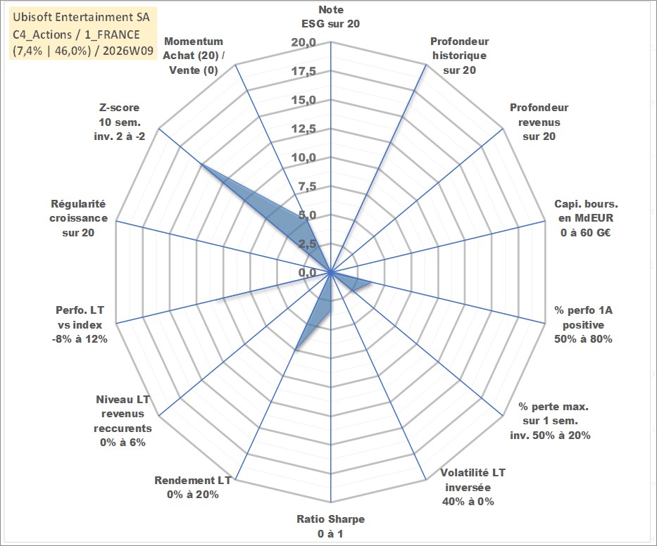 Site dédié aux investisseursPage dédiée sur site financeAnalyse des valorisations hebdomadaires de l'action Ubisoft Entertainment SA. Cet actif est cote en EUR. Les valorisations couvrent les semaines 1997W01 a 2026W09. Les revenus de cet actif financier ne sont pas connus car non existants ou non disponibles sur le site Yahoo Finance. La note ESG de cet actif n'est pas connue.