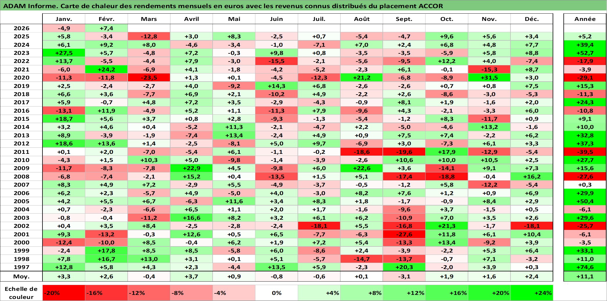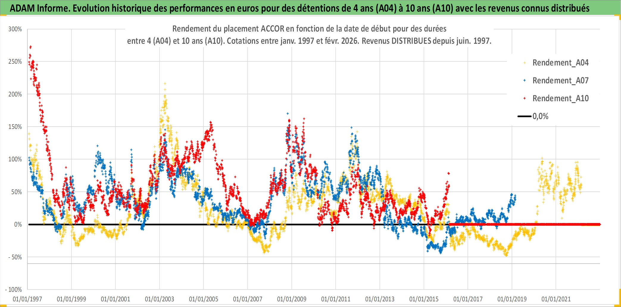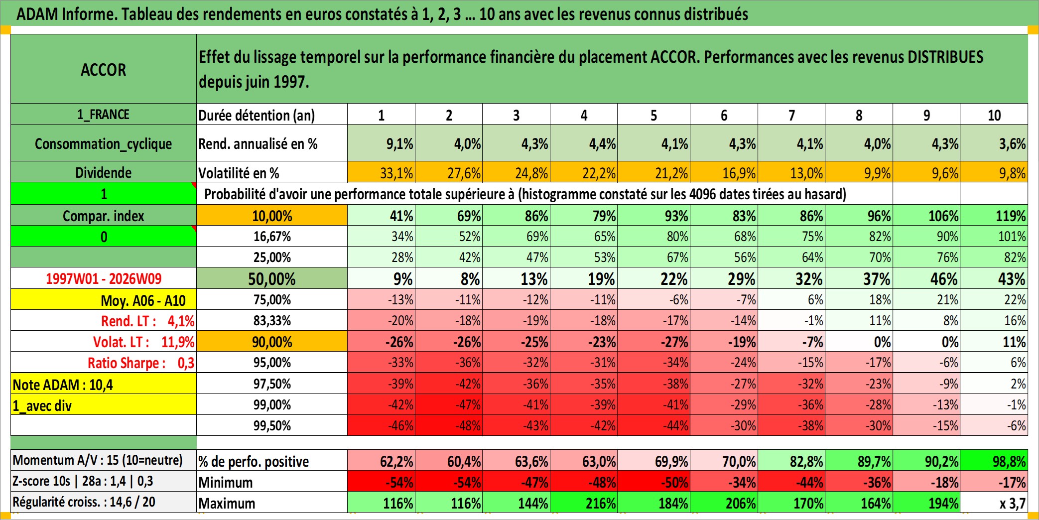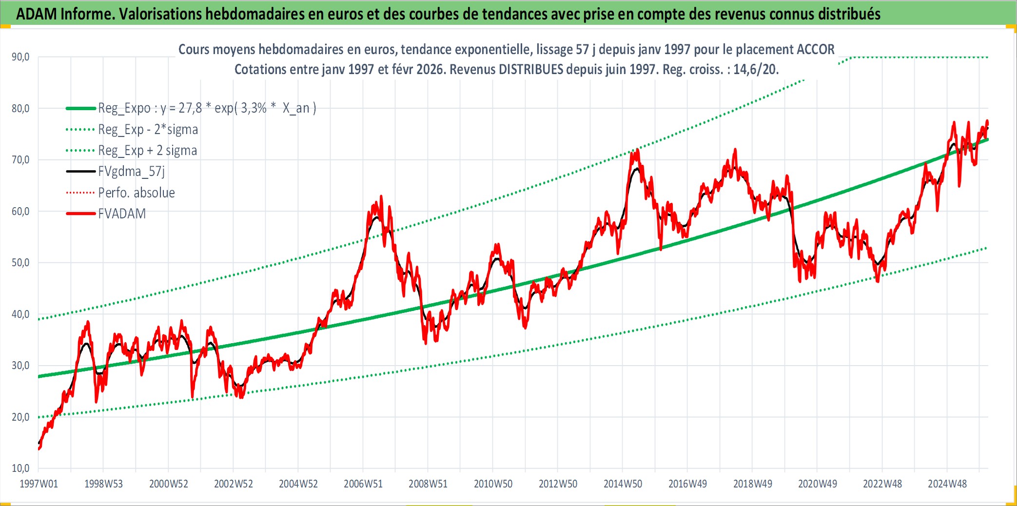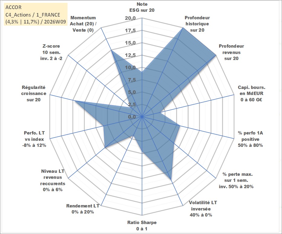 Site dédié aux investisseursPage dédiée sur site financeAnalyse des valorisations hebdomadaires de l'action ACCOR. Cet actif est cote en EUR. Les valorisations couvrent les semaines 1997W01 a 2026W09. Les revenus de cet actif financier sont pris en compte depuis la semaine 1997W24. La note globale ESG de cet actif est estimee a 9.0 (apres rebasage entre 0 et 20).