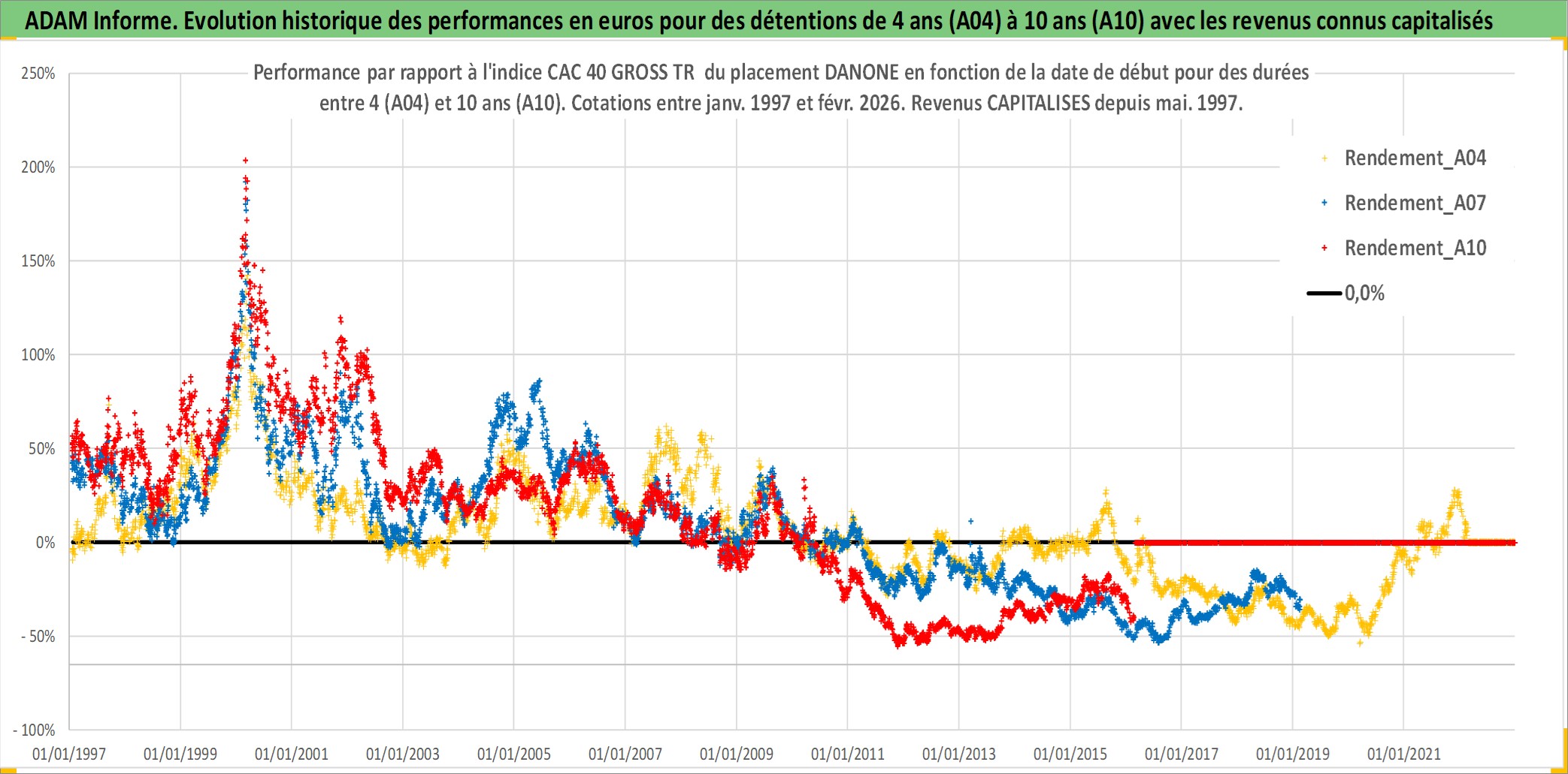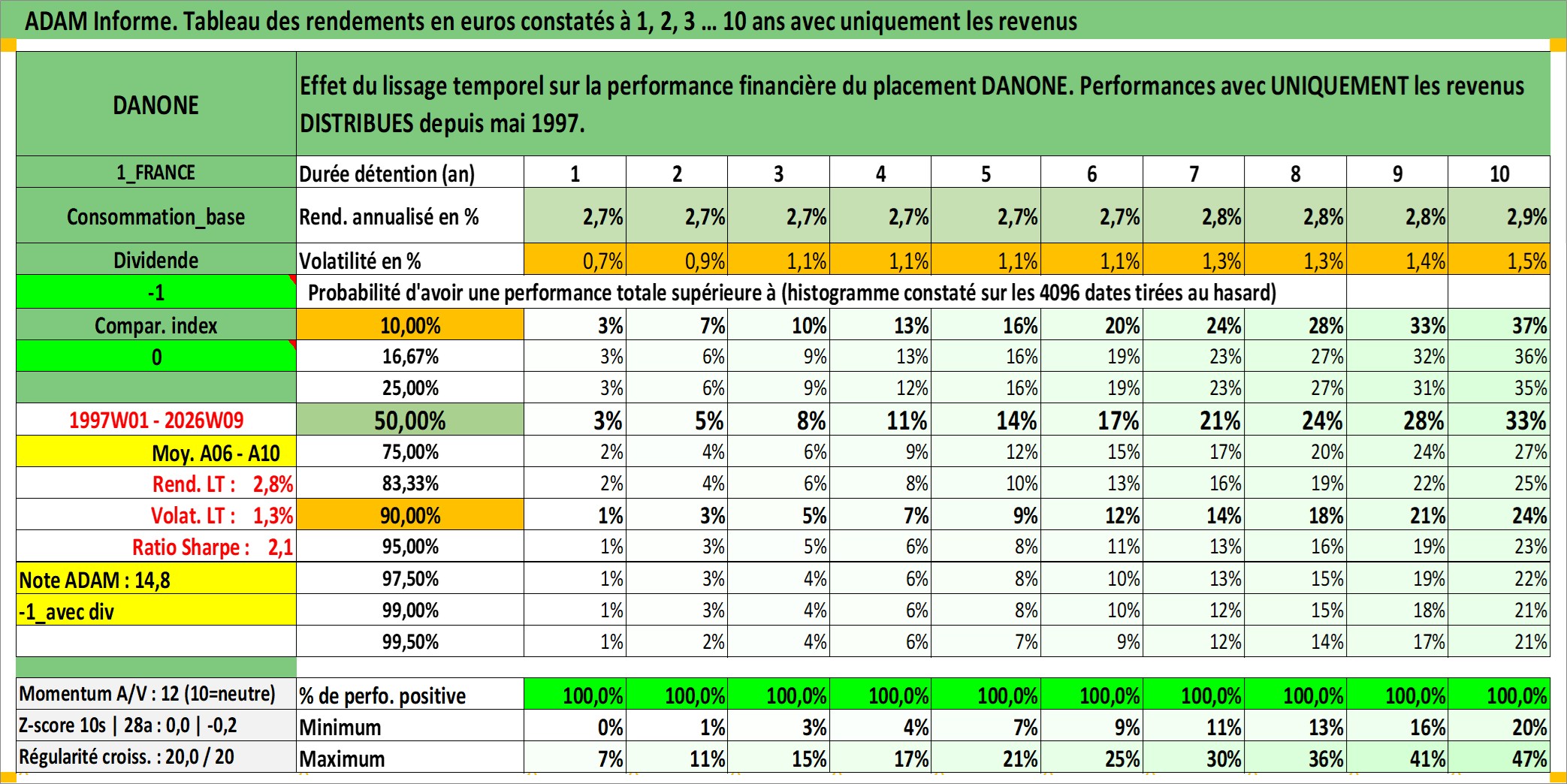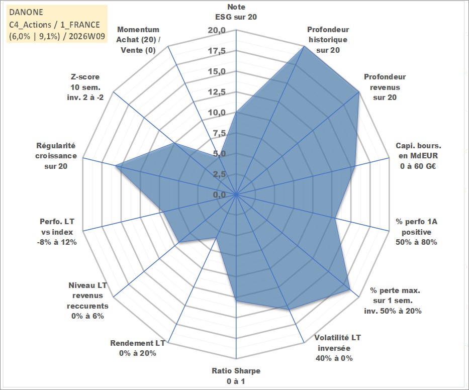 Site dédié aux investisseursPage dédiée sur site financeAnalyse des valorisations hebdomadaires de l'action DANONE. Cet actif est cote en EUR. Les valorisations couvrent les semaines 1997W01 a 2026W09. Les revenus de cet actif financier sont pris en compte depuis la semaine 1997W21. La note globale ESG de cet actif est estimee a 10.0 (apres rebasage entre 0 et 20).