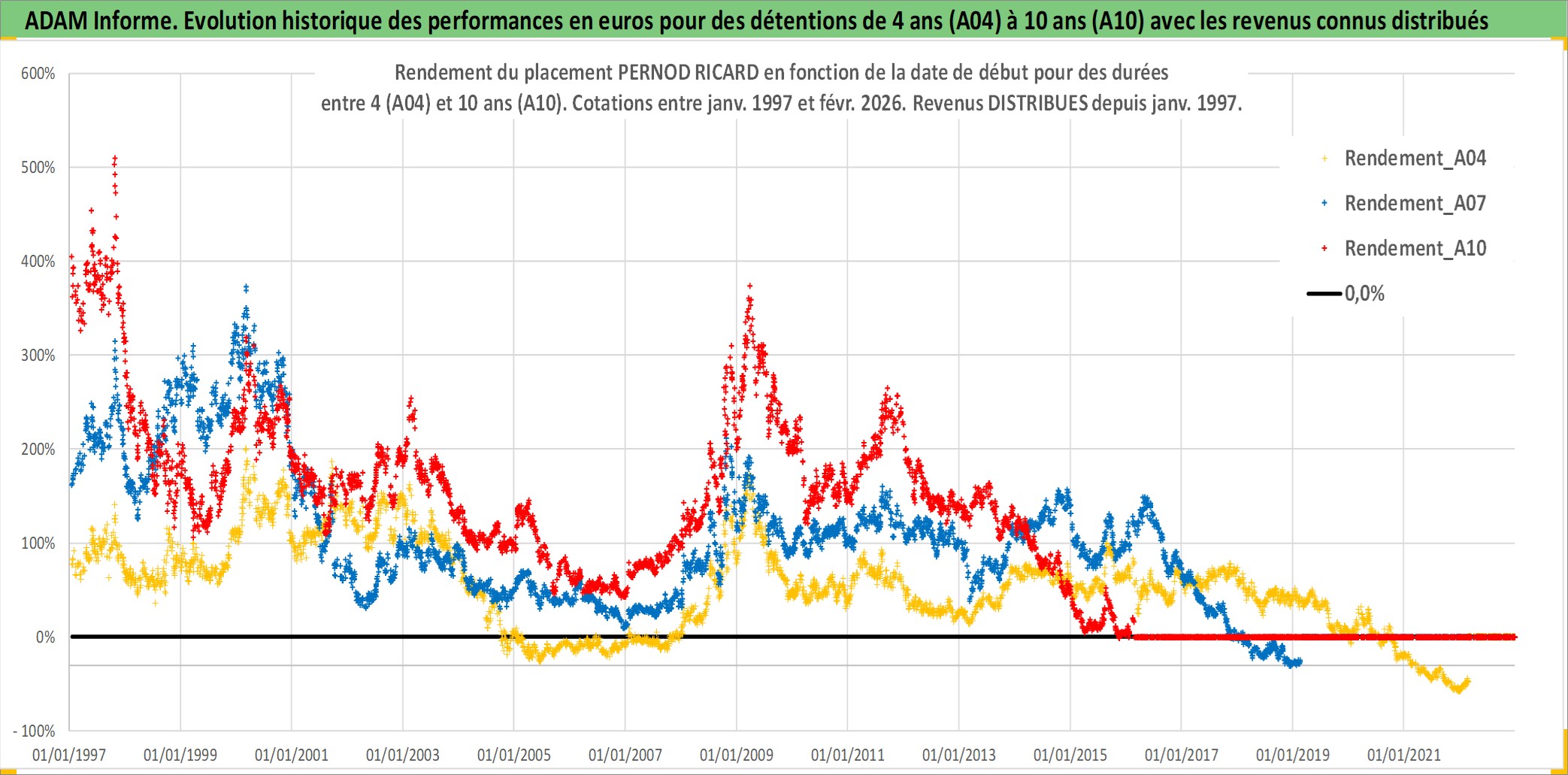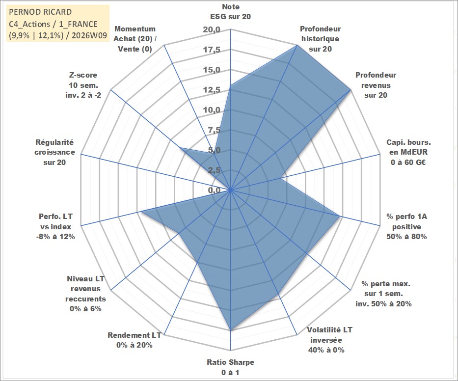 Site dédié aux investisseursPage dédiée sur site financeAnalyse des valorisations hebdomadaires de l'action PERNOD RICARD. Cet actif est cote en EUR. Les valorisations couvrent les semaines 1997W01 a 2026W09. Les revenus de cet actif financier sont pris en compte depuis la semaine 1997W03. La note globale ESG de cet actif est estimee a 13.0 (apres rebasage entre 0 et 20).