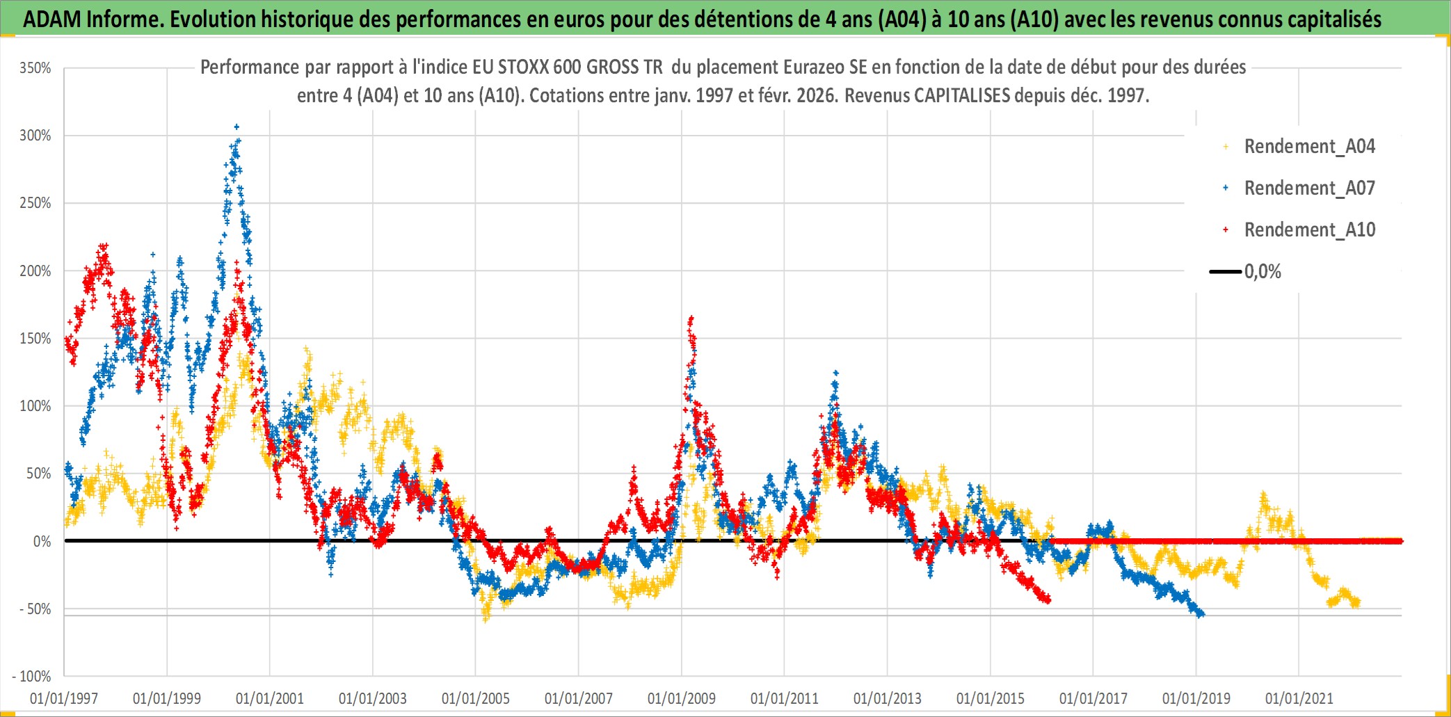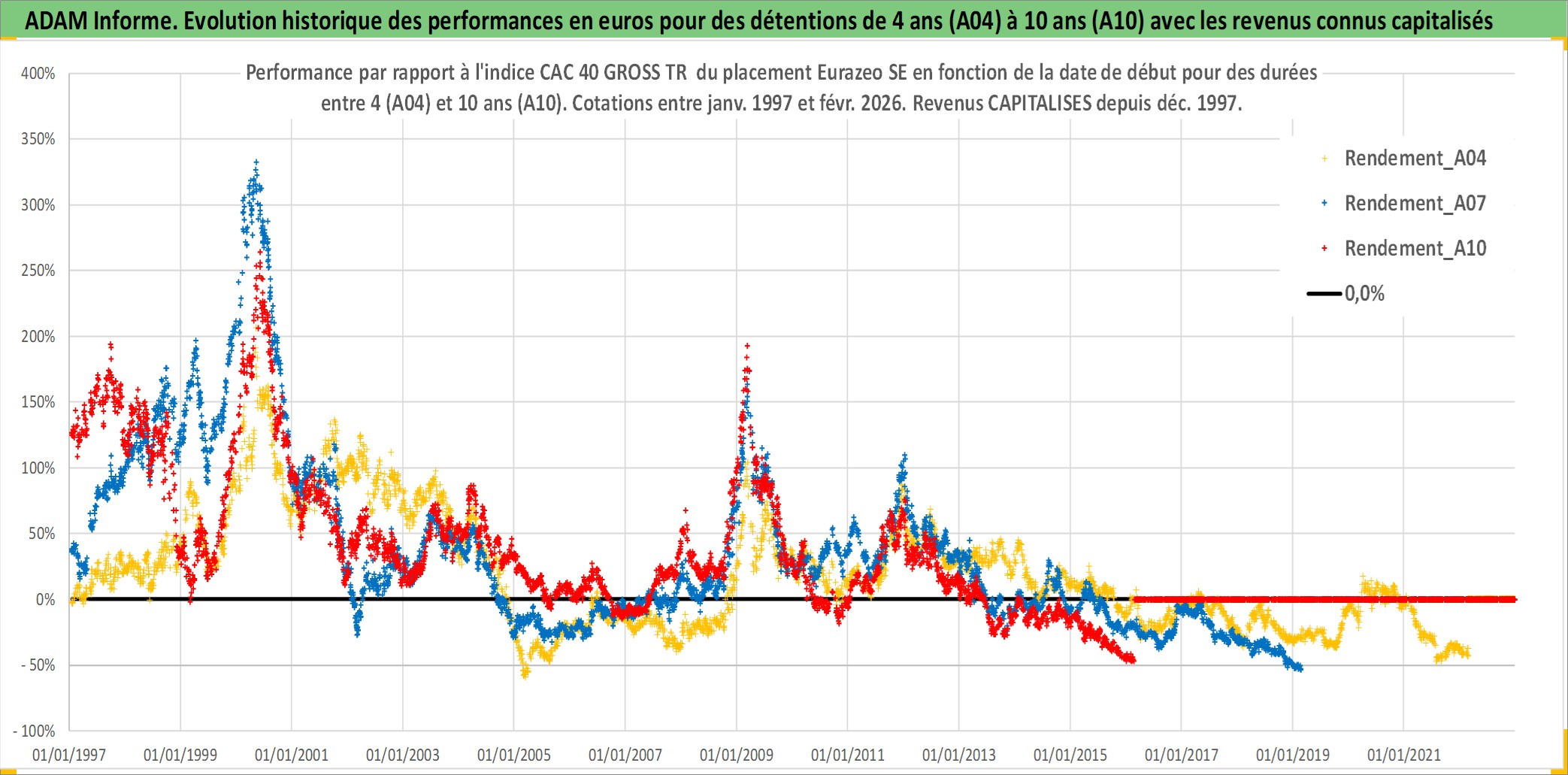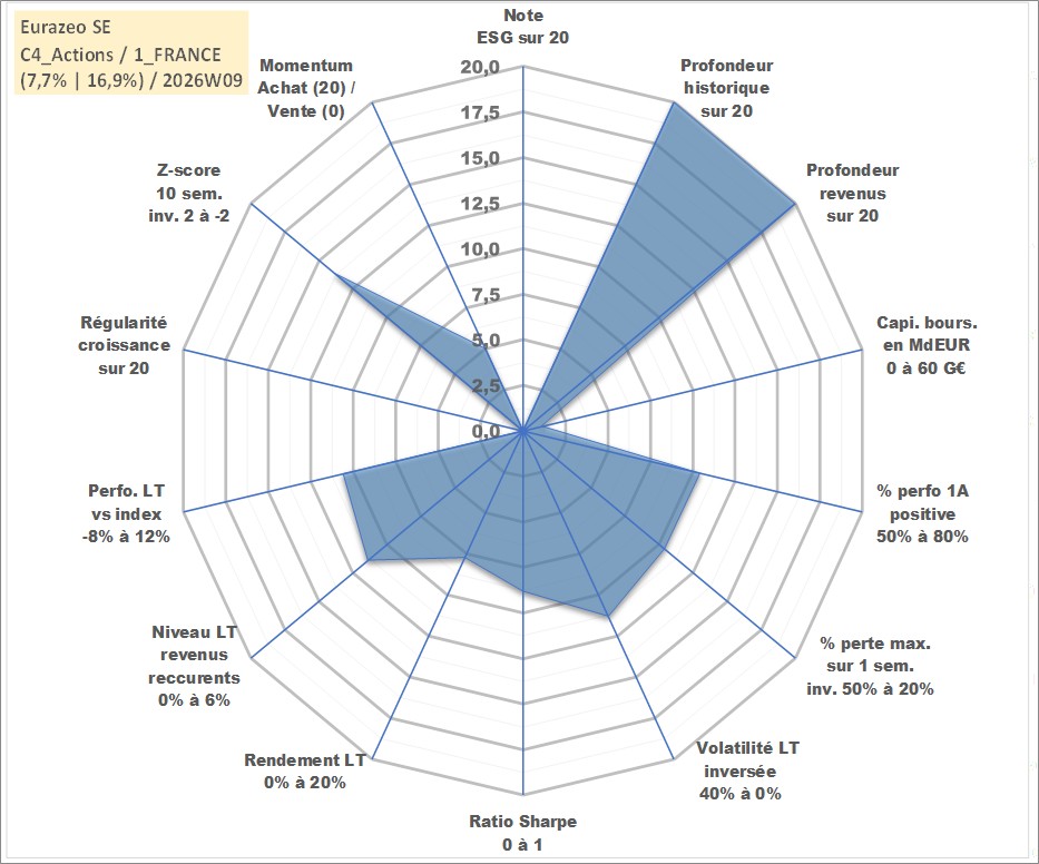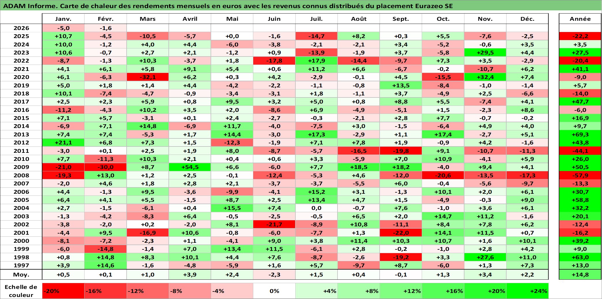 Site dédié aux investisseursPage dédiée sur site financeAnalyse des valorisations hebdomadaires de l'action Eurazeo SE. Cet actif est cote en EUR. Les valorisations couvrent les semaines 1997W01 a 2026W09. Les revenus de cet actif financier sont pris en compte depuis la semaine 1997W51. La note ESG de cet actif n'est pas connue.