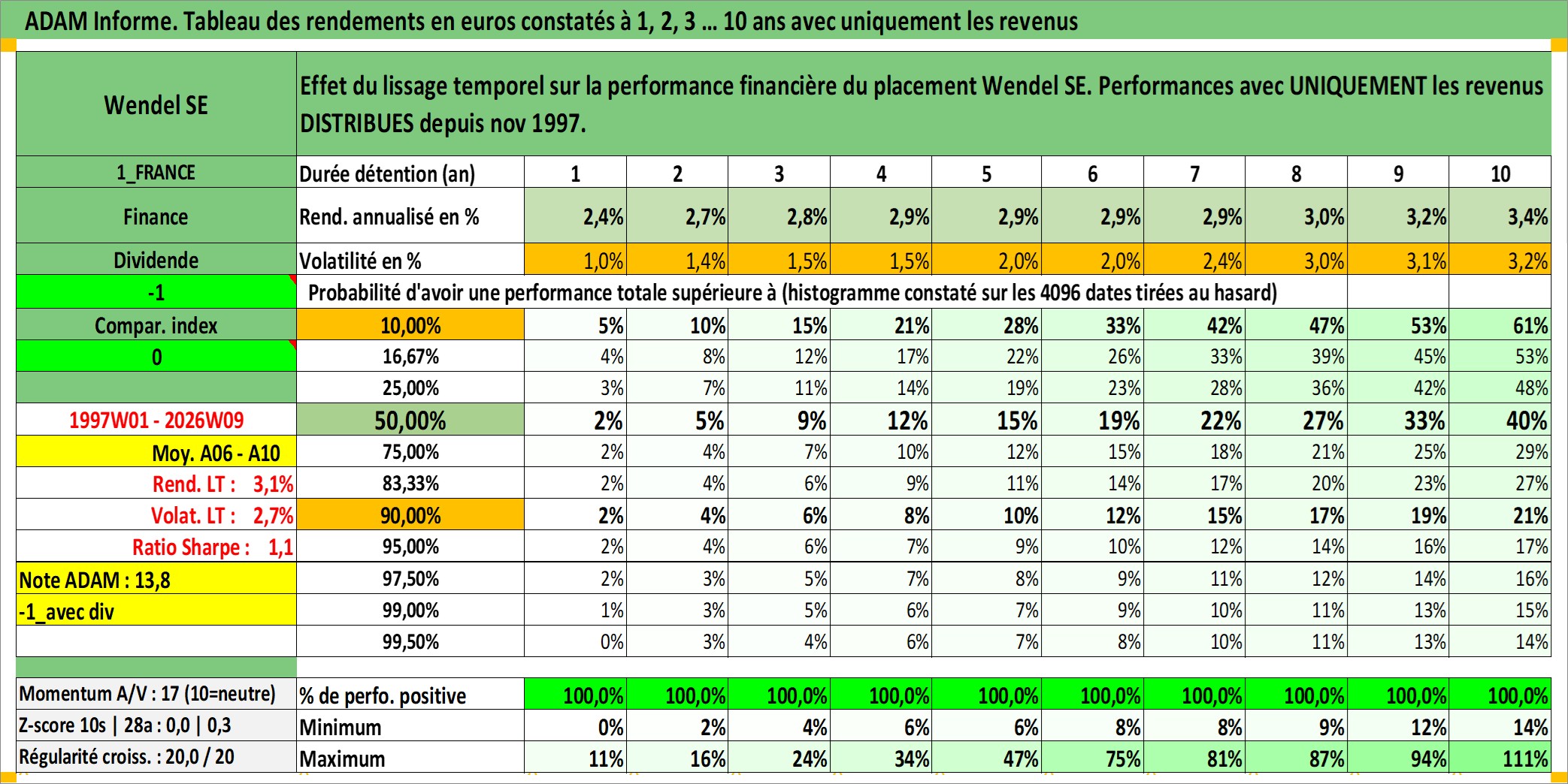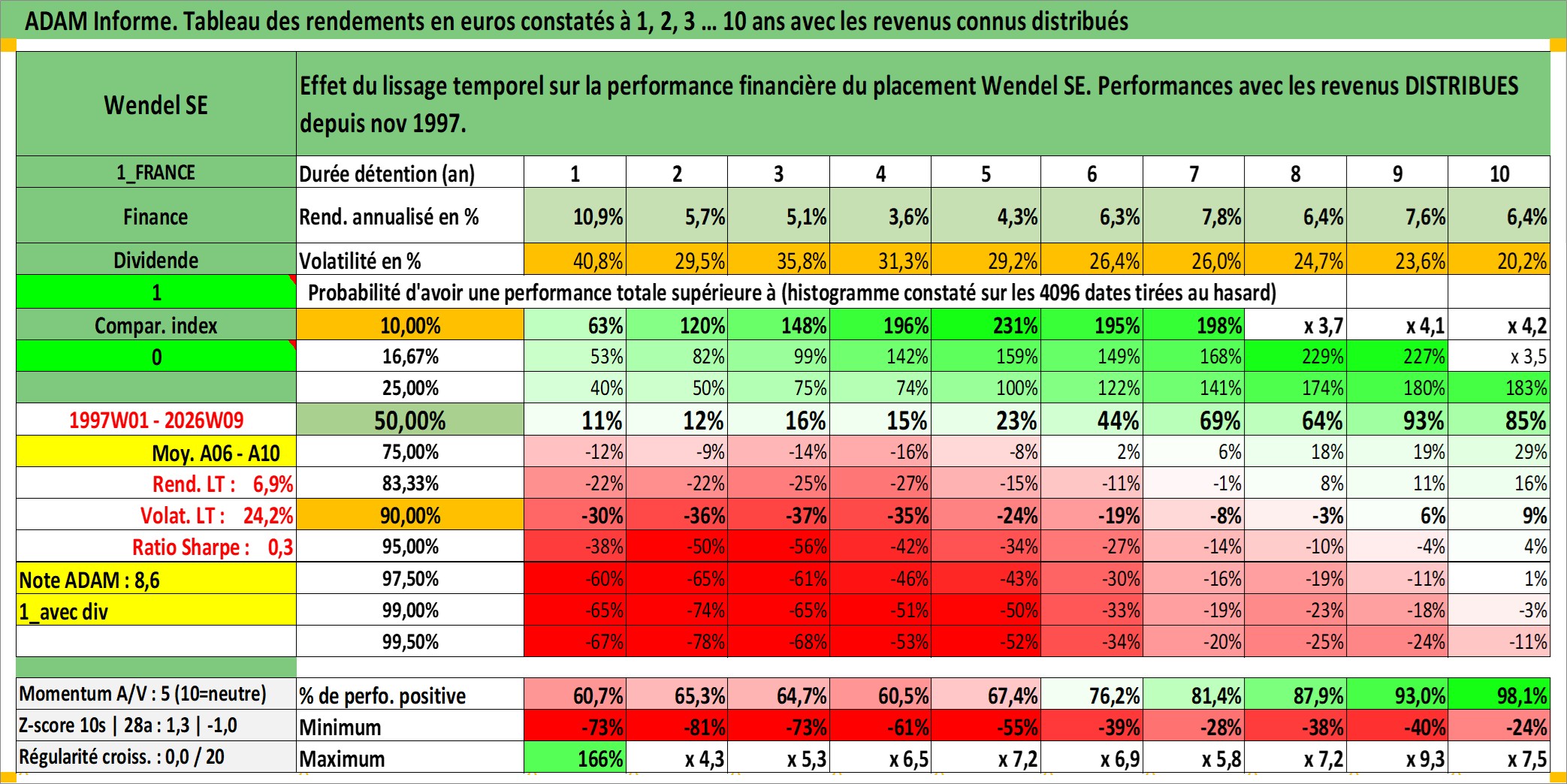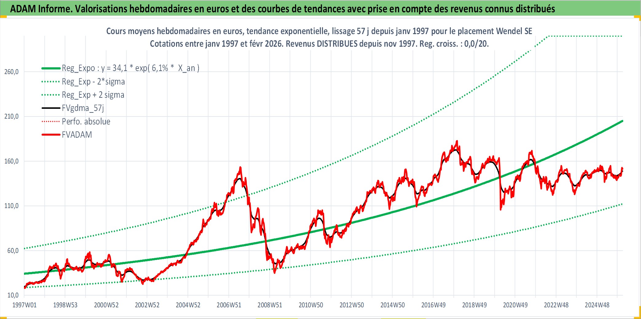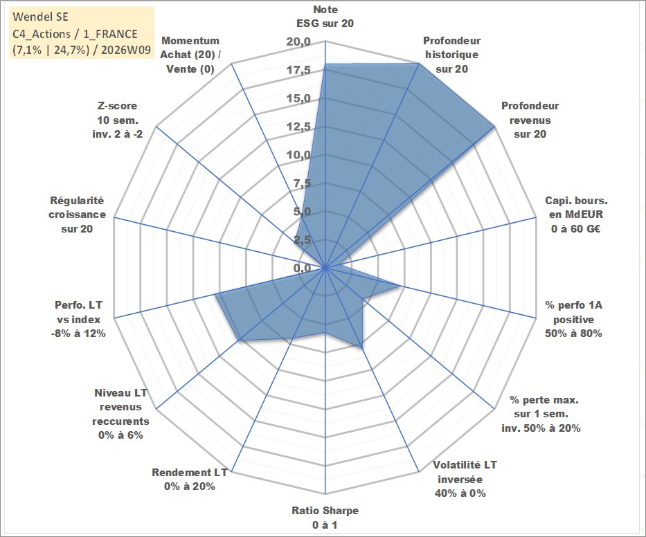 Site dédié aux investisseursPage dédiée sur site financeAnalyse des valorisations hebdomadaires de l'action Wendel SE. Cet actif est cote en EUR. Les valorisations couvrent les semaines 1997W01 a 2026W09. Les revenus de cet actif financier sont pris en compte depuis la semaine 1997W48. La note globale ESG de cet actif est estimee a 18.0 (apres rebasage entre 0 et 20).
