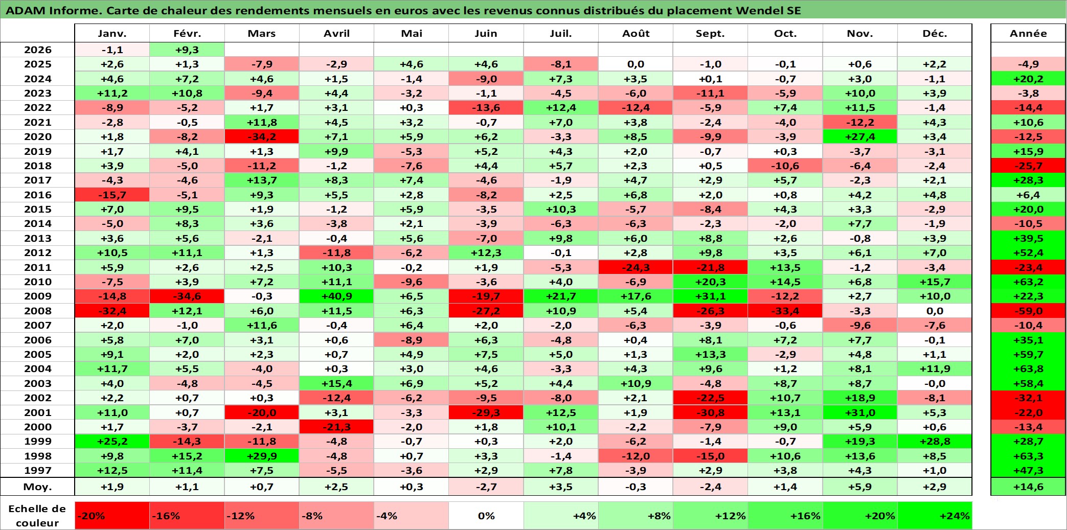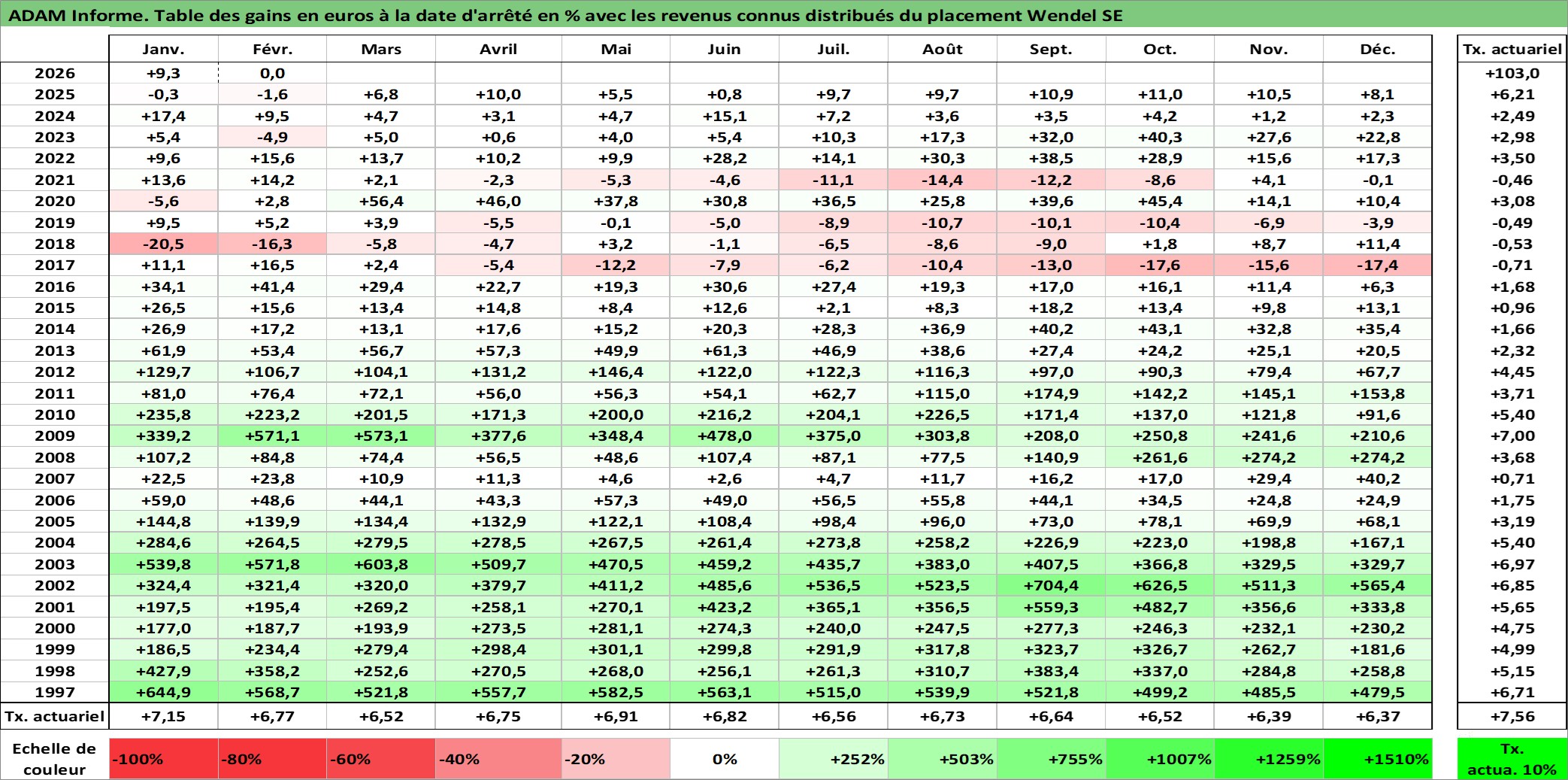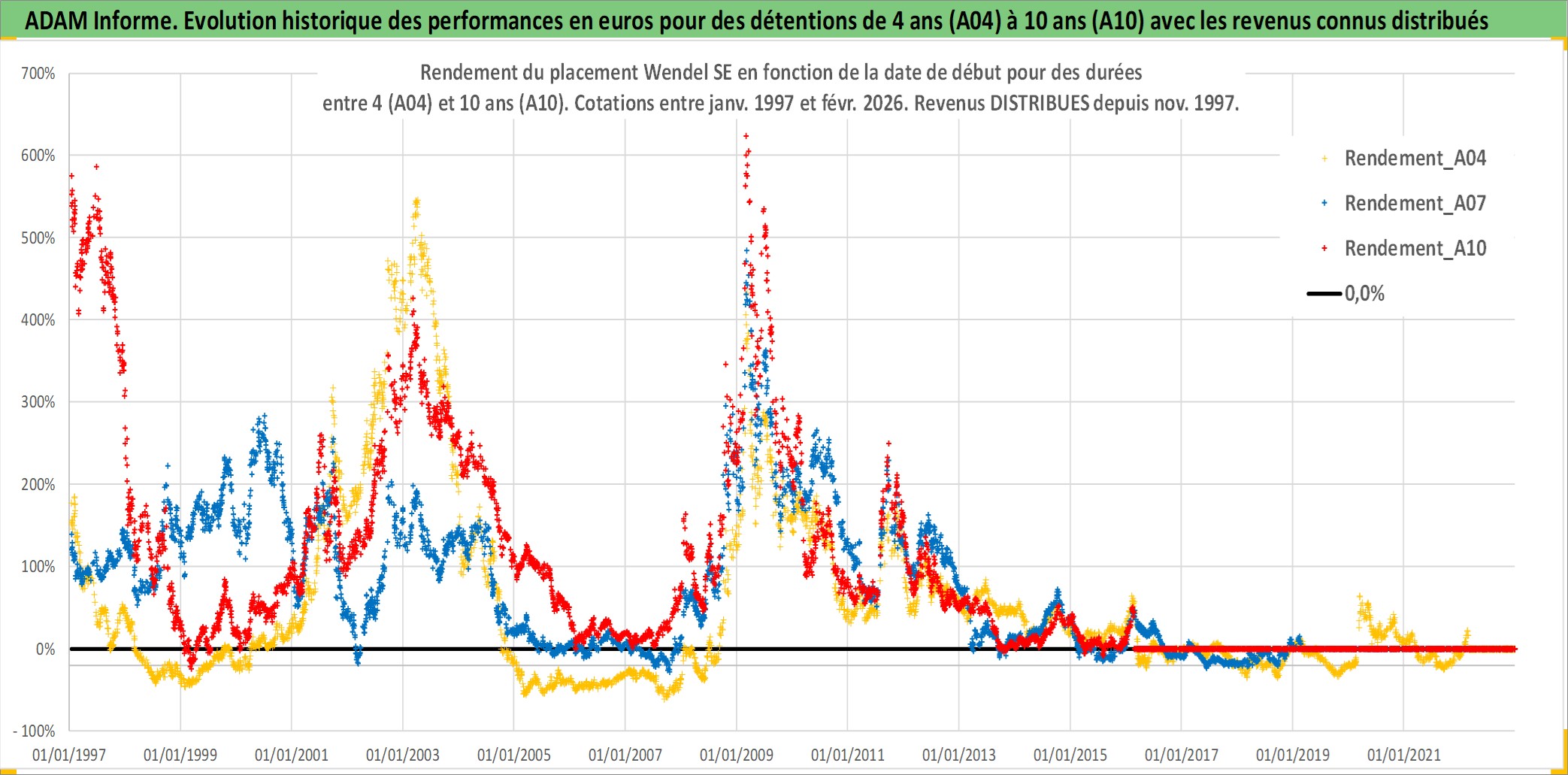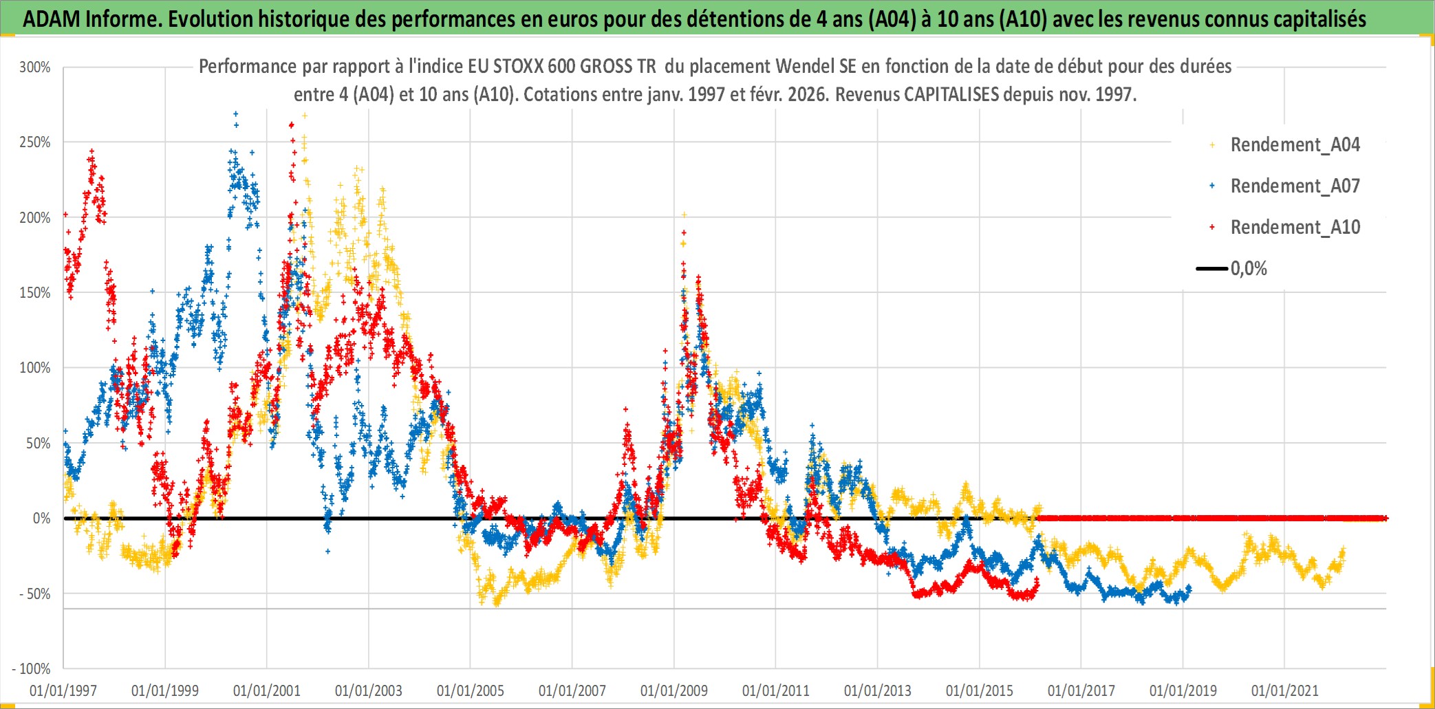Site dédié aux investisseursPage dédiée sur site financeAnalyse des valorisations hebdomadaires de l'action Wendel SE. Cet actif est cote en EUR. Les valorisations couvrent les semaines 1997W01 a 2026W09. Les revenus de cet actif financier sont pris en compte depuis la semaine 1997W48. La note globale ESG de cet actif est estimee a 18.0 (apres rebasage entre 0 et 20).
