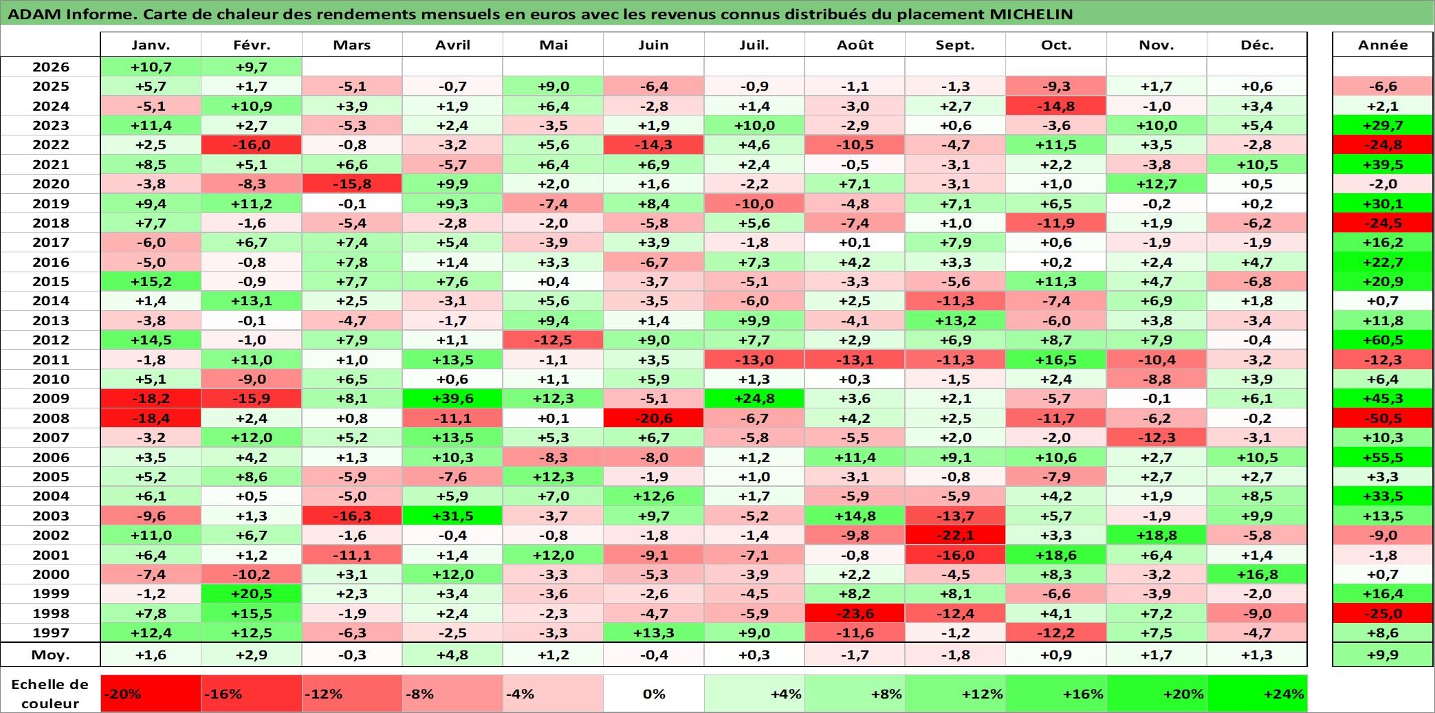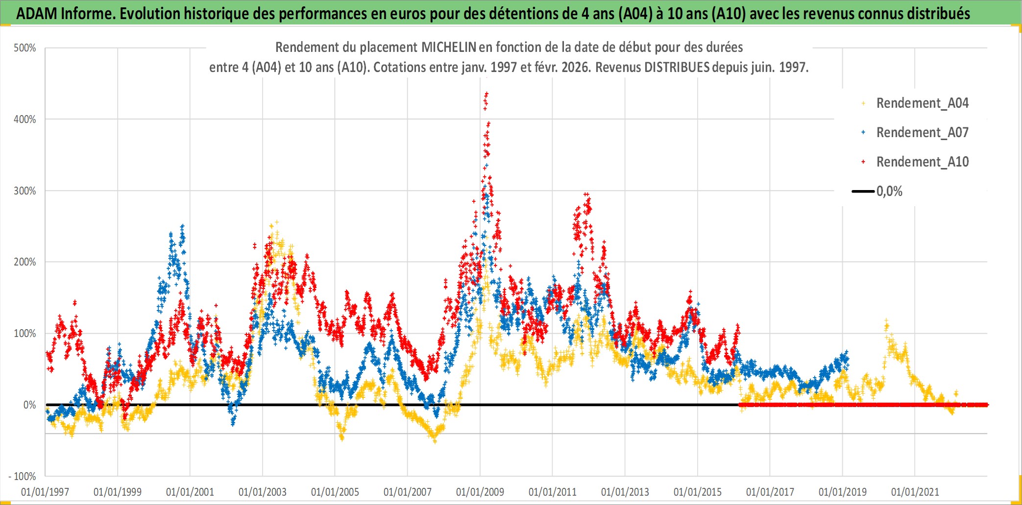 Site dédié aux investisseursPage dédiée sur site financeAnalyse des valorisations hebdomadaires de l'action MICHELIN. Cet actif est cote en EUR. Les valorisations couvrent les semaines 1997W01 a 2026W09. Les revenus de cet actif financier sont pris en compte depuis la semaine 1997W25. La note globale ESG de cet actif est estimee a 15.0 (apres rebasage entre 0 et 20).