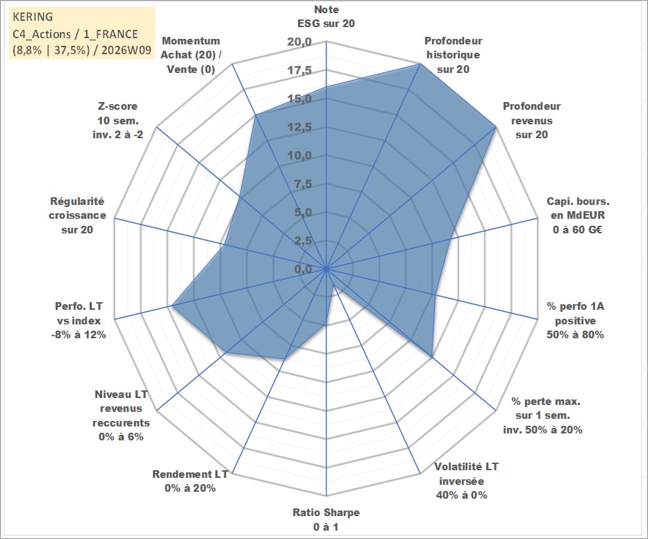 Site dédié aux investisseursPage dédiée sur site financeAnalyse des valorisations hebdomadaires de l'action KERING. Cet actif est cote en EUR. Les valorisations couvrent les semaines 1997W01 a 2026W09. Les revenus de cet actif financier sont pris en compte depuis la semaine 1997W27. La note globale ESG de cet actif est estimee a 16.0 (apres rebasage entre 0 et 20).