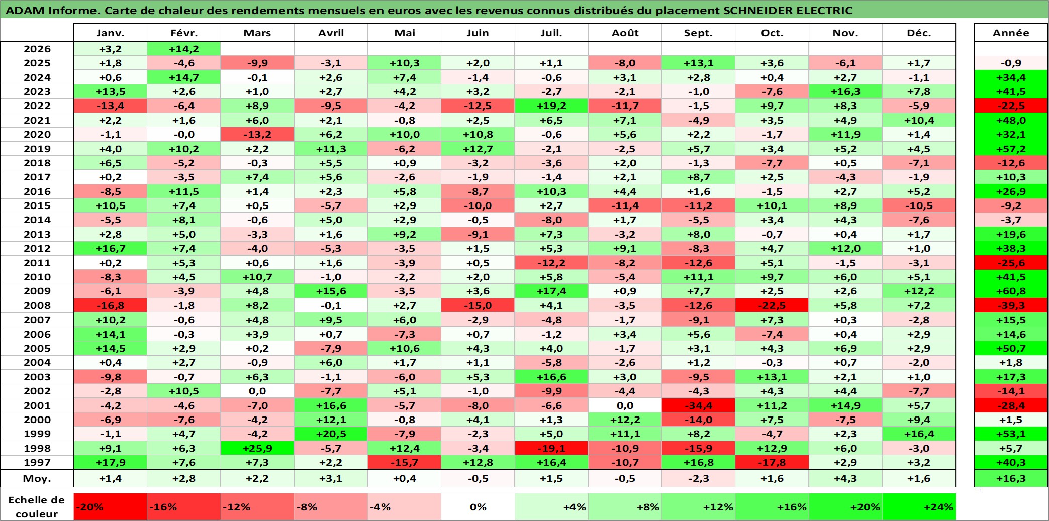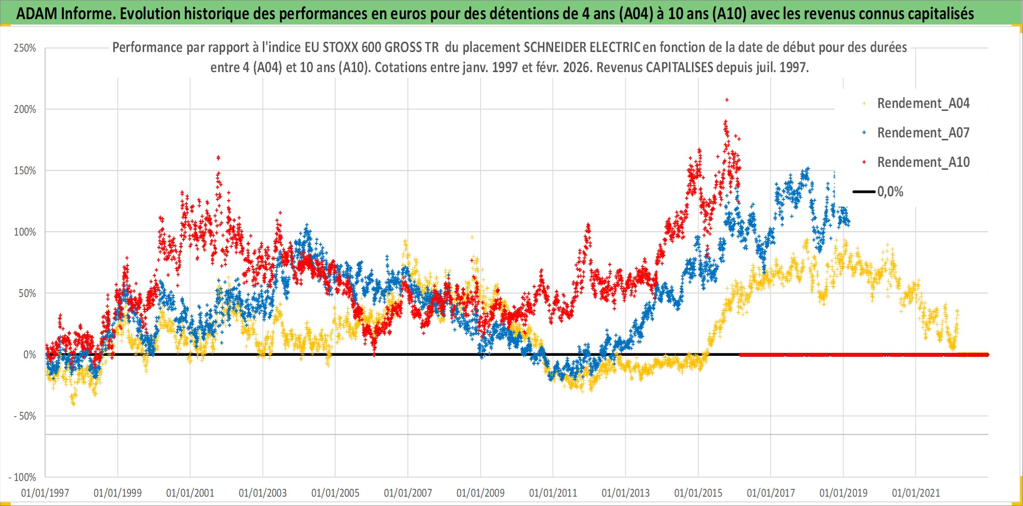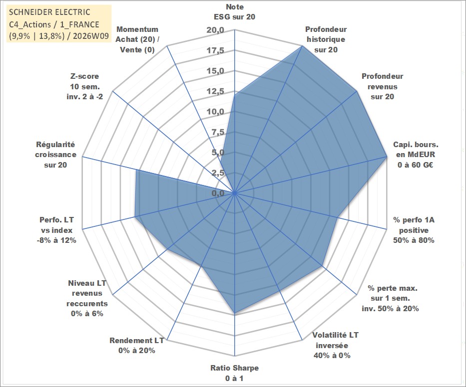 Site dédié aux investisseursPage dédiée sur site financeAnalyse des valorisations hebdomadaires de l'action SCHNEIDER ELECTRIC. Cet actif est cote en EUR. Les valorisations couvrent les semaines 1997W01 a 2026W09. Les revenus de cet actif financier sont pris en compte depuis la semaine 1997W27. La note globale ESG de cet actif est estimee a 12.0 (apres rebasage entre 0 et 20).