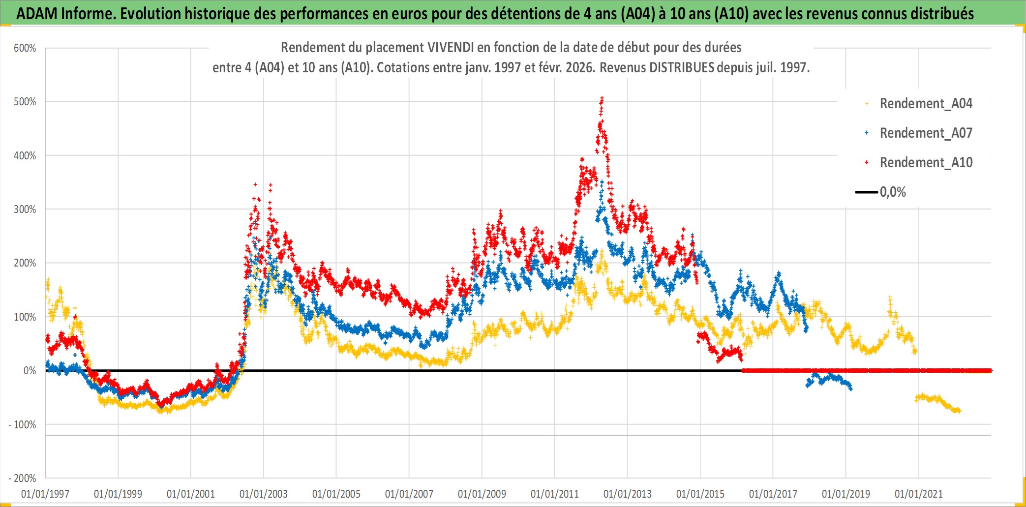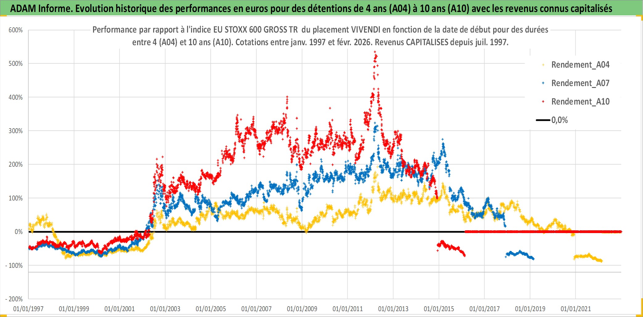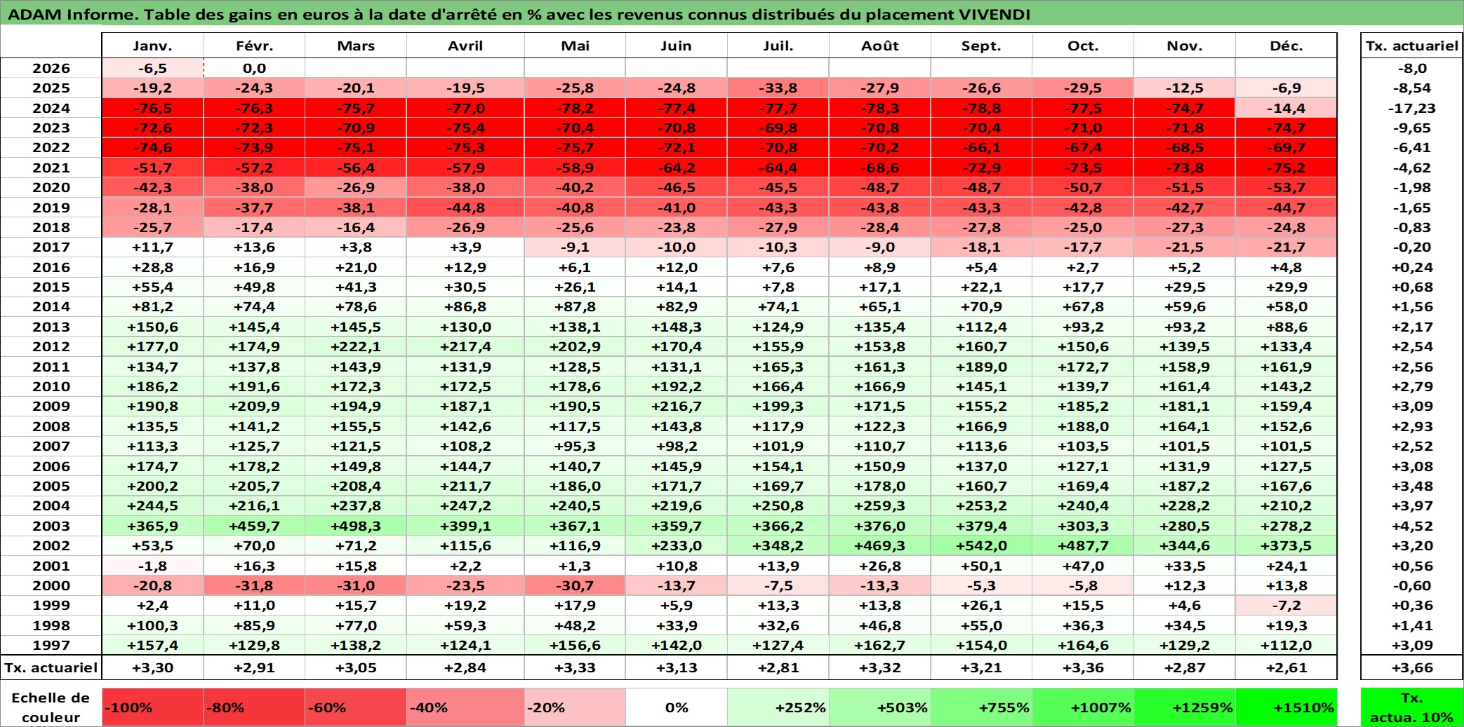 Site dédié aux investisseursPage dédiée sur site financeAnalyse des valorisations hebdomadaires de l'action VIVENDI. Cet actif est cote en EUR. Les valorisations couvrent les semaines 1997W01 a 2026W09. Les revenus de cet actif financier sont pris en compte depuis la semaine 1997W27. La note globale ESG de cet actif est estimee a 16.0 (apres rebasage entre 0 et 20).