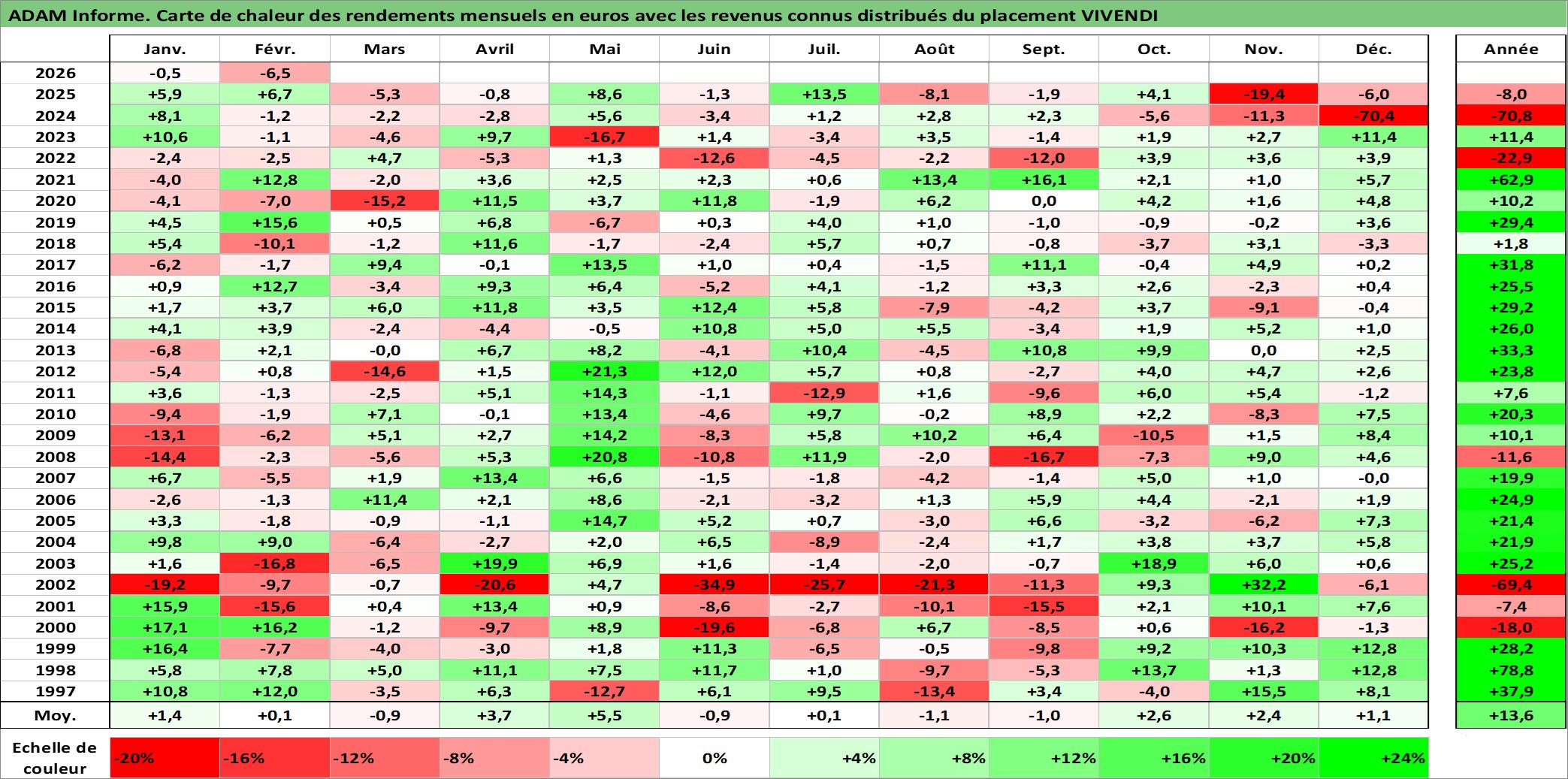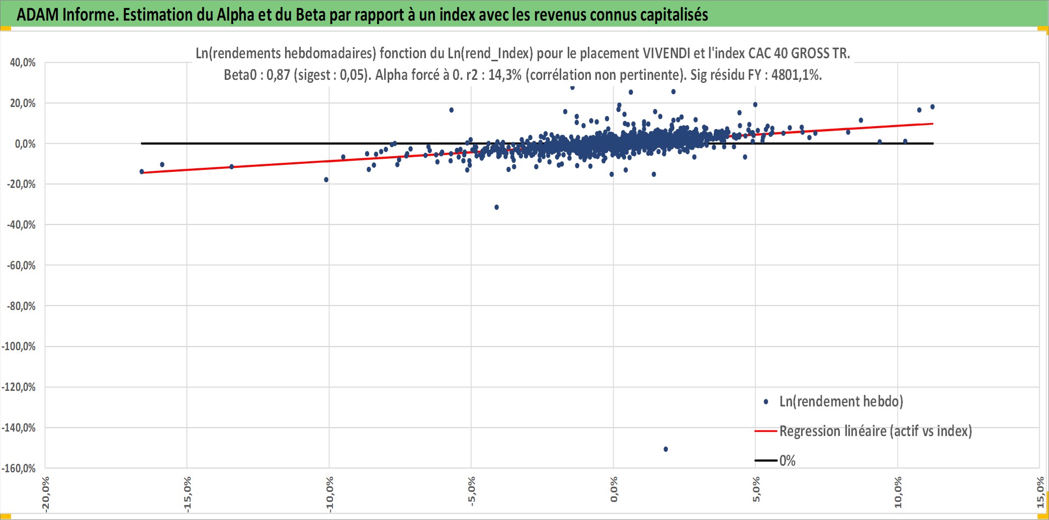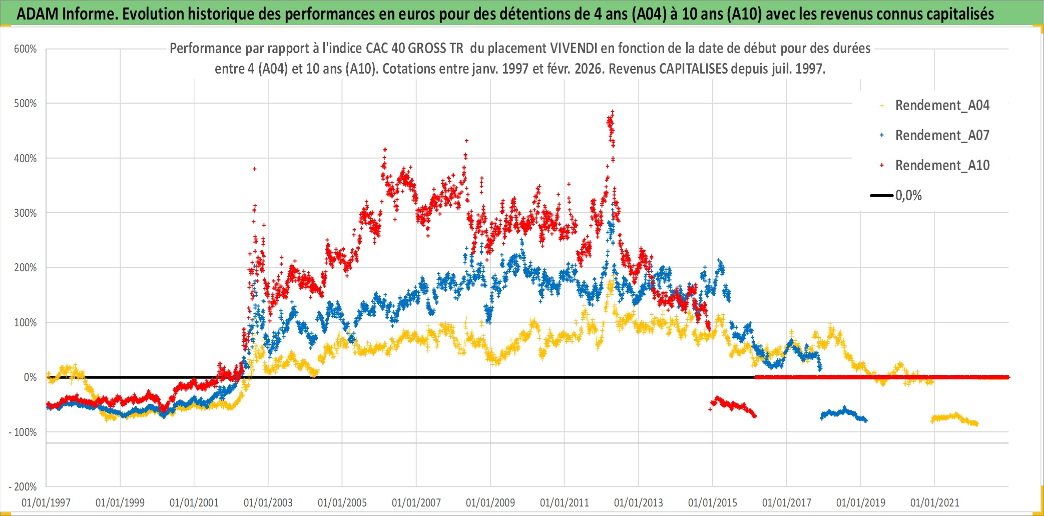 Site dédié aux investisseursPage dédiée sur site financeAnalyse des valorisations hebdomadaires de l'action VIVENDI. Cet actif est cote en EUR. Les valorisations couvrent les semaines 1997W01 a 2026W09. Les revenus de cet actif financier sont pris en compte depuis la semaine 1997W27. La note globale ESG de cet actif est estimee a 16.0 (apres rebasage entre 0 et 20).