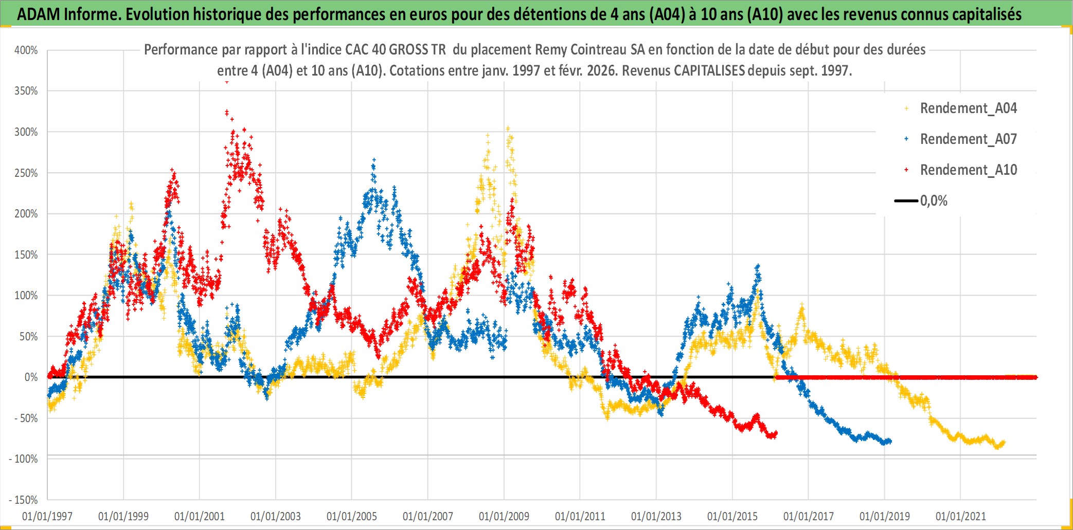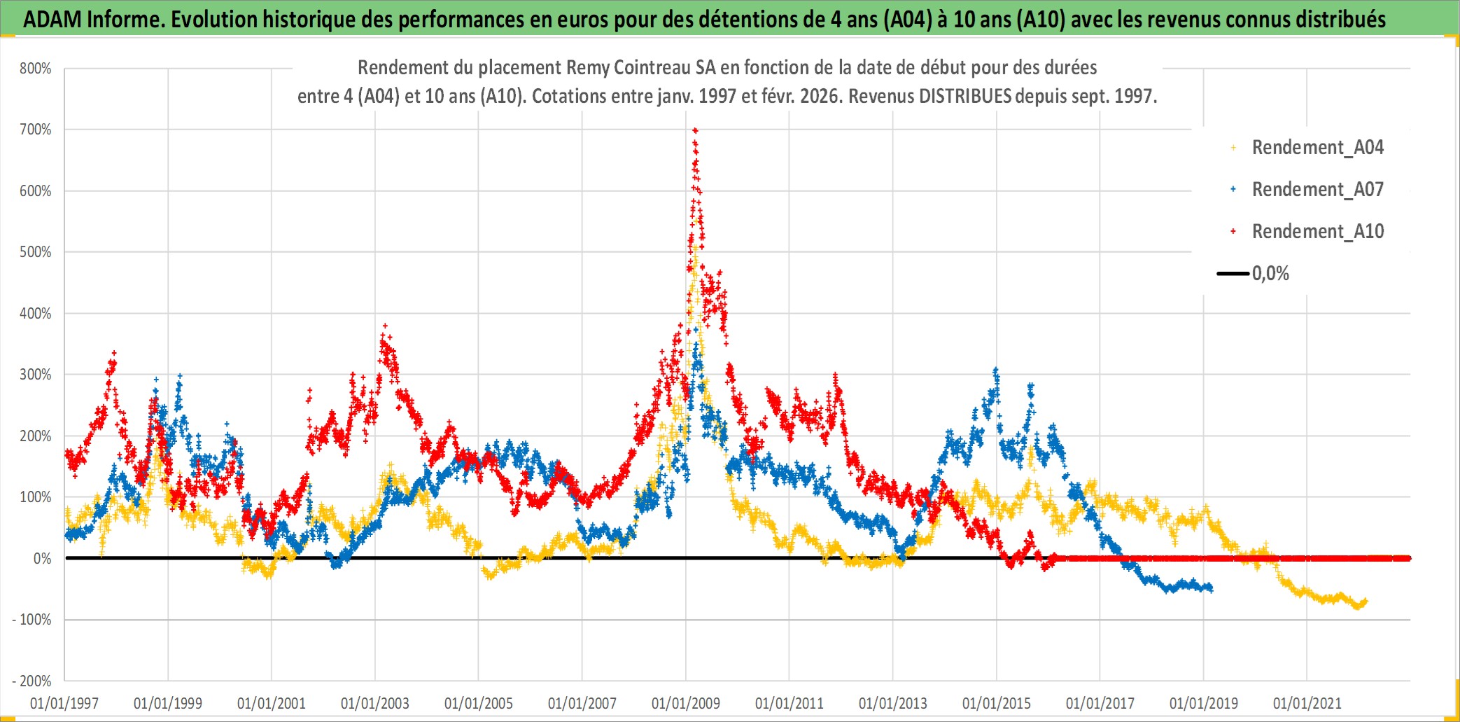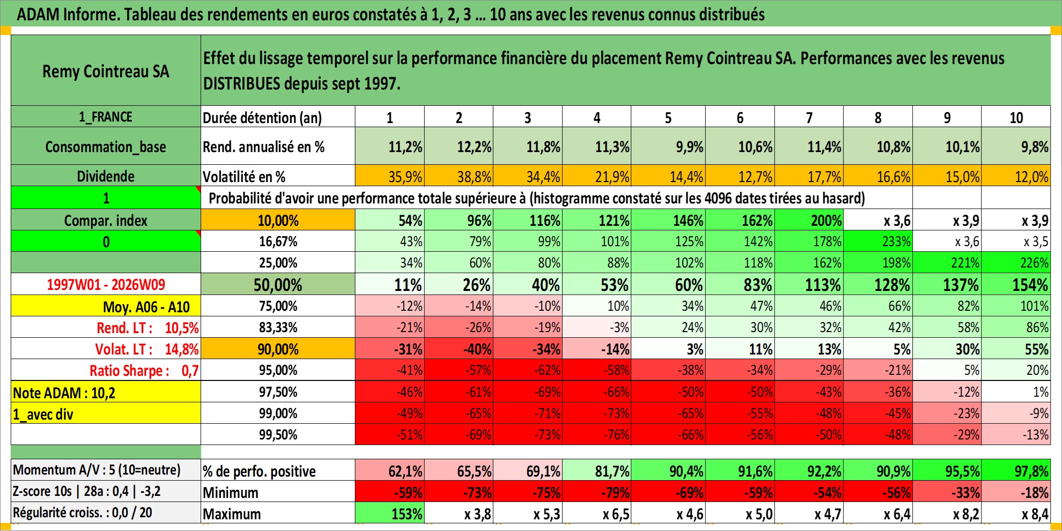 Site dédié aux investisseursPage dédiée sur site financeAnalyse des valorisations hebdomadaires de l'action Remy Cointreau SA. Cet actif est cote en EUR. Les valorisations couvrent les semaines 1997W01 a 2026W09. Les revenus de cet actif financier sont pris en compte depuis la semaine 1997W38. La note ESG de cet actif n'est pas connue.