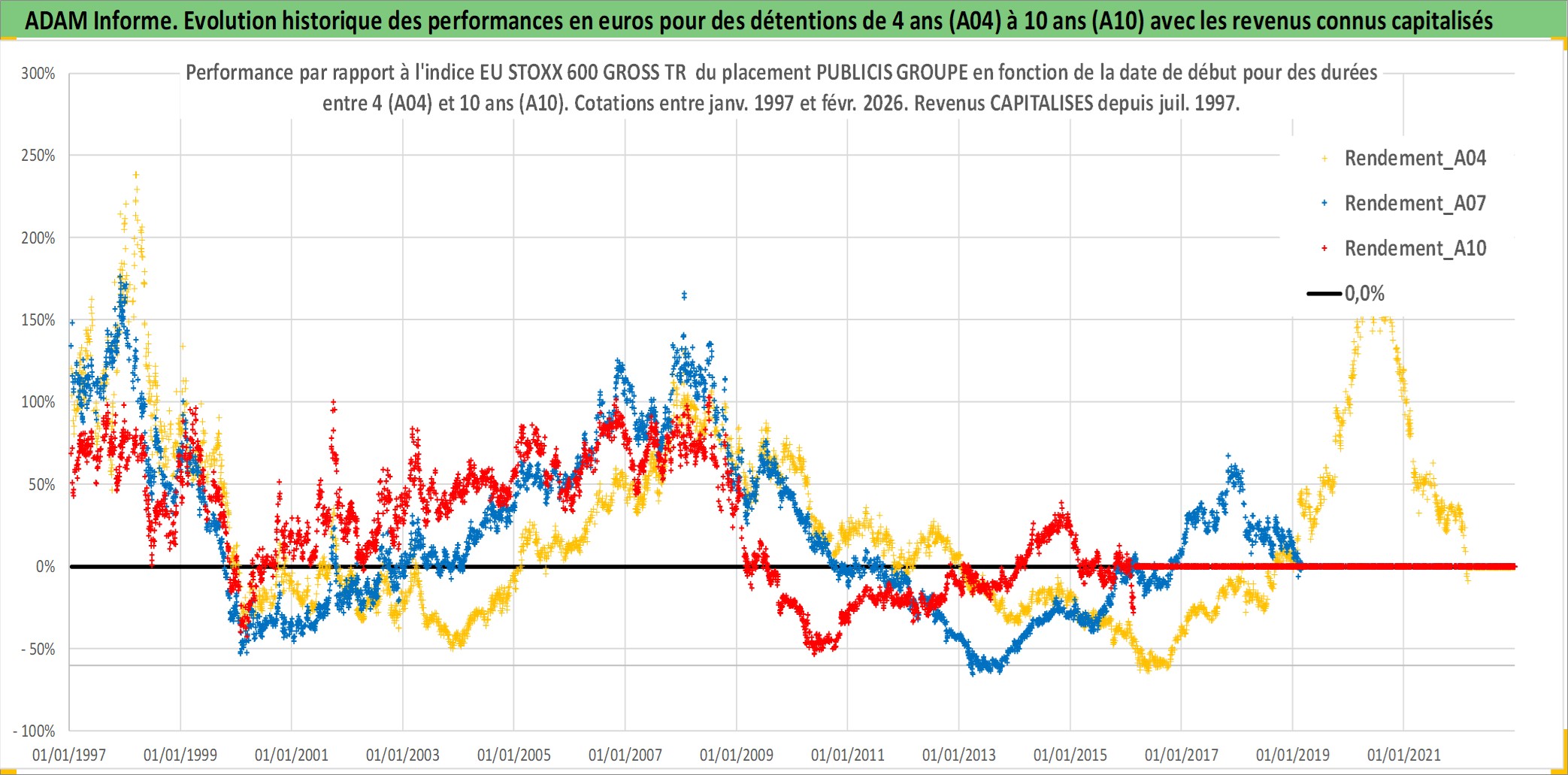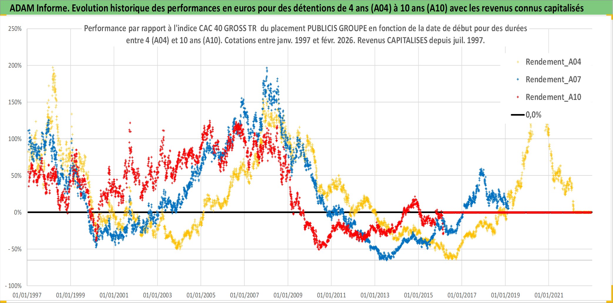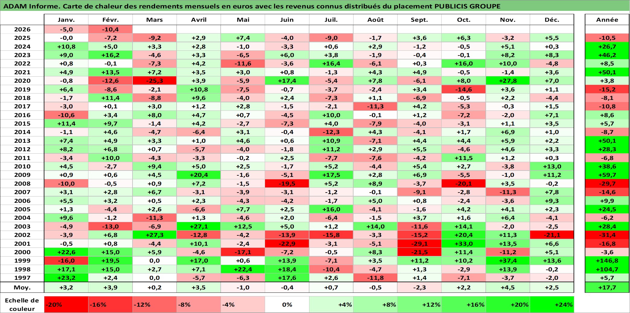 Site dédié aux investisseursPage dédiée sur site financeAnalyse des valorisations hebdomadaires de l'action PUBLICIS GROUPE. Cet actif est cote en EUR. Les valorisations couvrent les semaines 1997W01 a 2026W09. Les revenus de cet actif financier sont pris en compte depuis la semaine 1997W28. La note globale ESG de cet actif est estimee a 16.0 (apres rebasage entre 0 et 20).