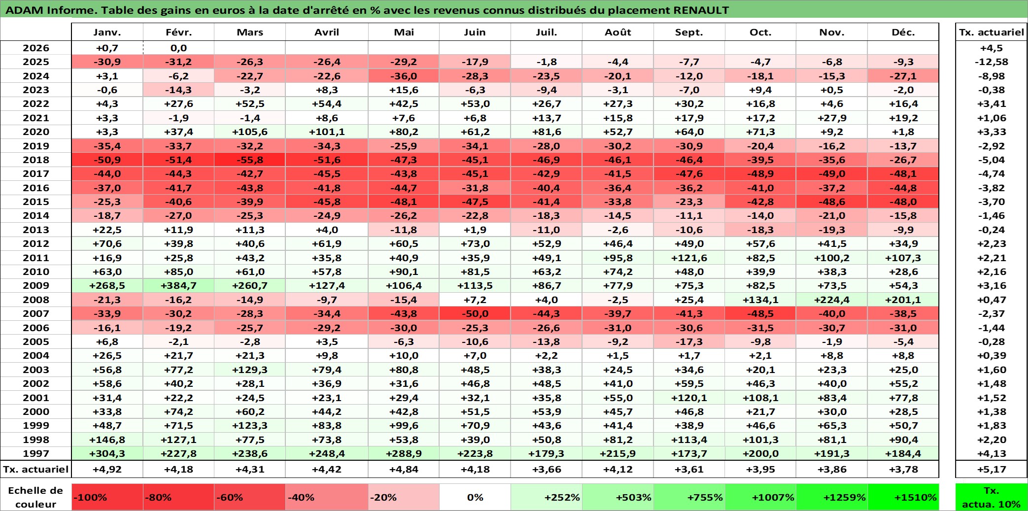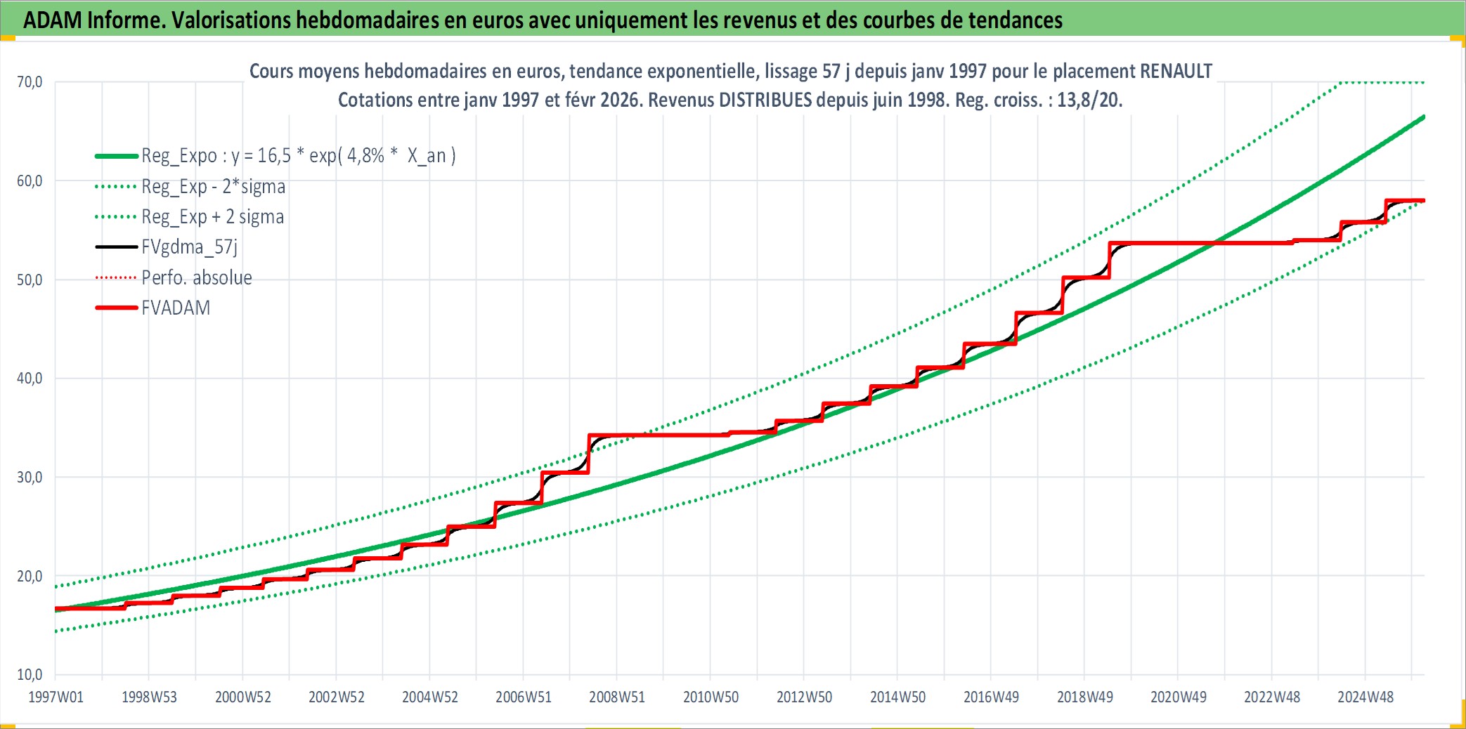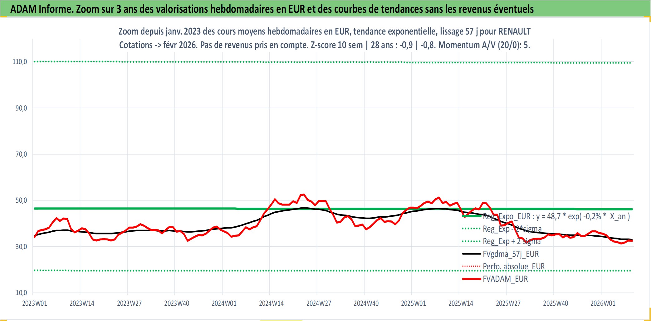 Site dédié aux investisseursPage dédiée sur site financeAnalyse des valorisations hebdomadaires de l'action RENAULT. Cet actif est cote en EUR. Les valorisations couvrent les semaines 1997W01 a 2026W09. Les revenus de cet actif financier sont pris en compte depuis la semaine 1998W27. La note globale ESG de cet actif est estimee a 9.0 (apres rebasage entre 0 et 20).