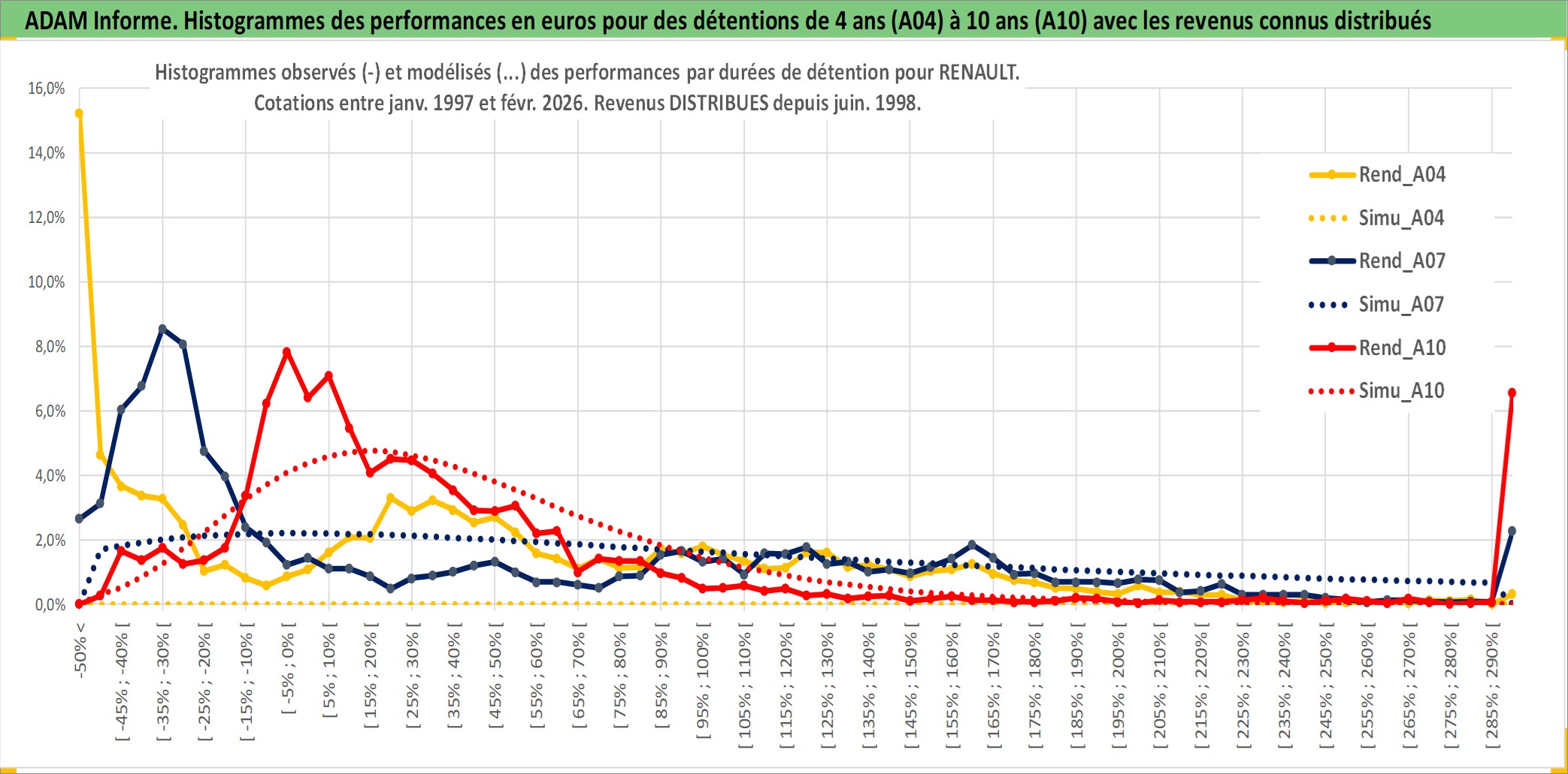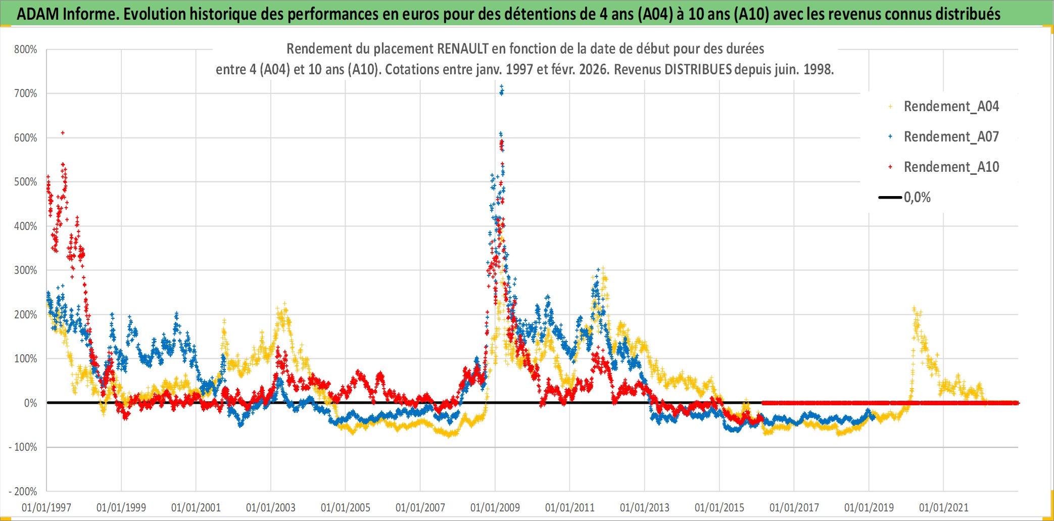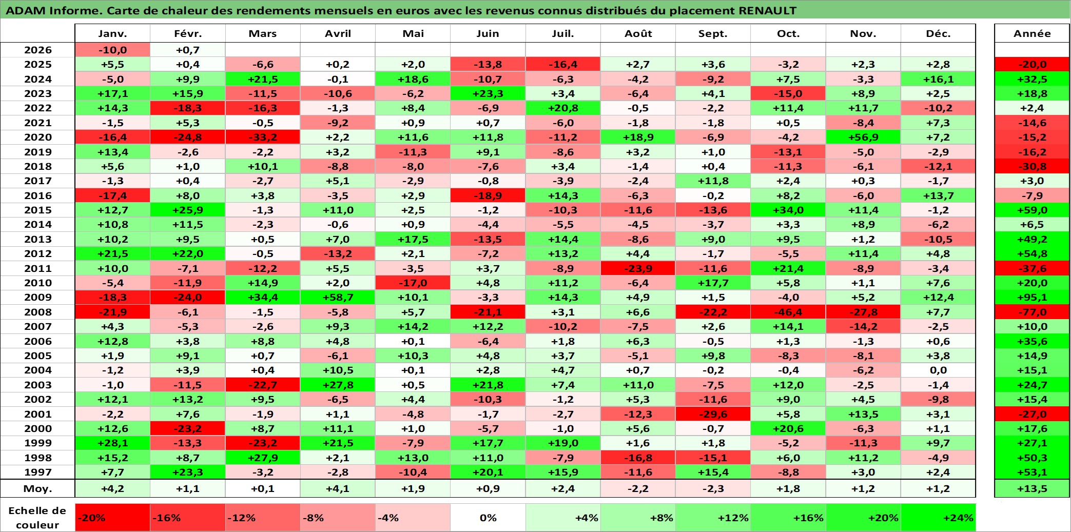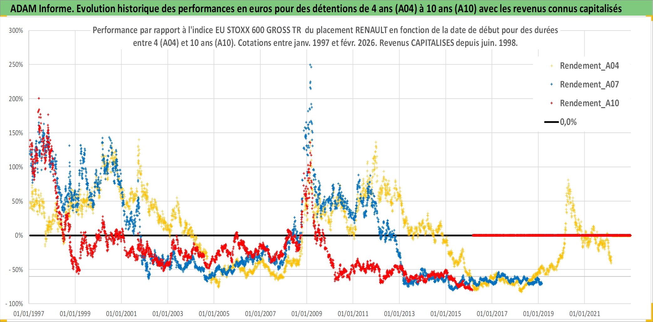 Site dédié aux investisseursPage dédiée sur site financeAnalyse des valorisations hebdomadaires de l'action RENAULT. Cet actif est cote en EUR. Les valorisations couvrent les semaines 1997W01 a 2026W09. Les revenus de cet actif financier sont pris en compte depuis la semaine 1998W27. La note globale ESG de cet actif est estimee a 9.0 (apres rebasage entre 0 et 20).