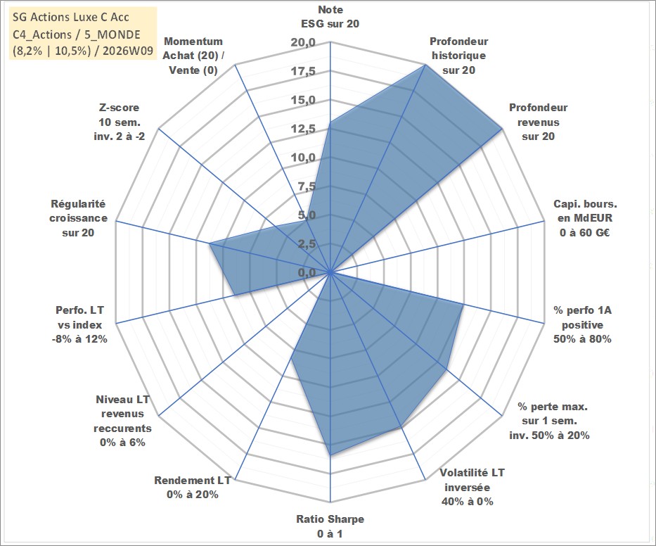 Site dédié aux investisseursPage dédiée sur site financeAnalyse des valorisations hebdomadaires du fonds SG Actions Luxe C Acc. Cet actif est cote en EUR. Les valorisations couvrent les semaines 1997W01 a 2026W09. Les revenus de cet actif financier sont pris en compte depuis la semaine 1997W01. La note globale ESG de cet actif est estimee a 13.0 (apres rebasage entre 0 et 20).
