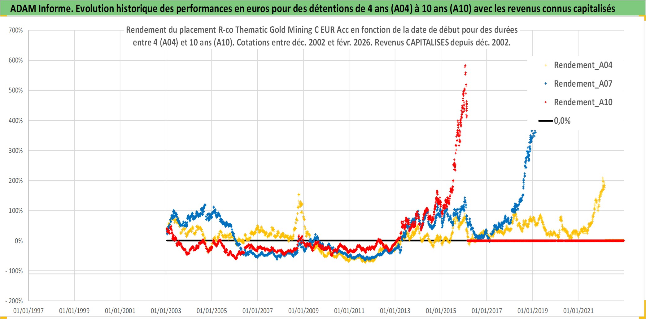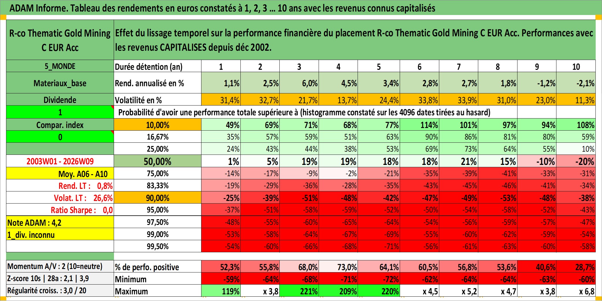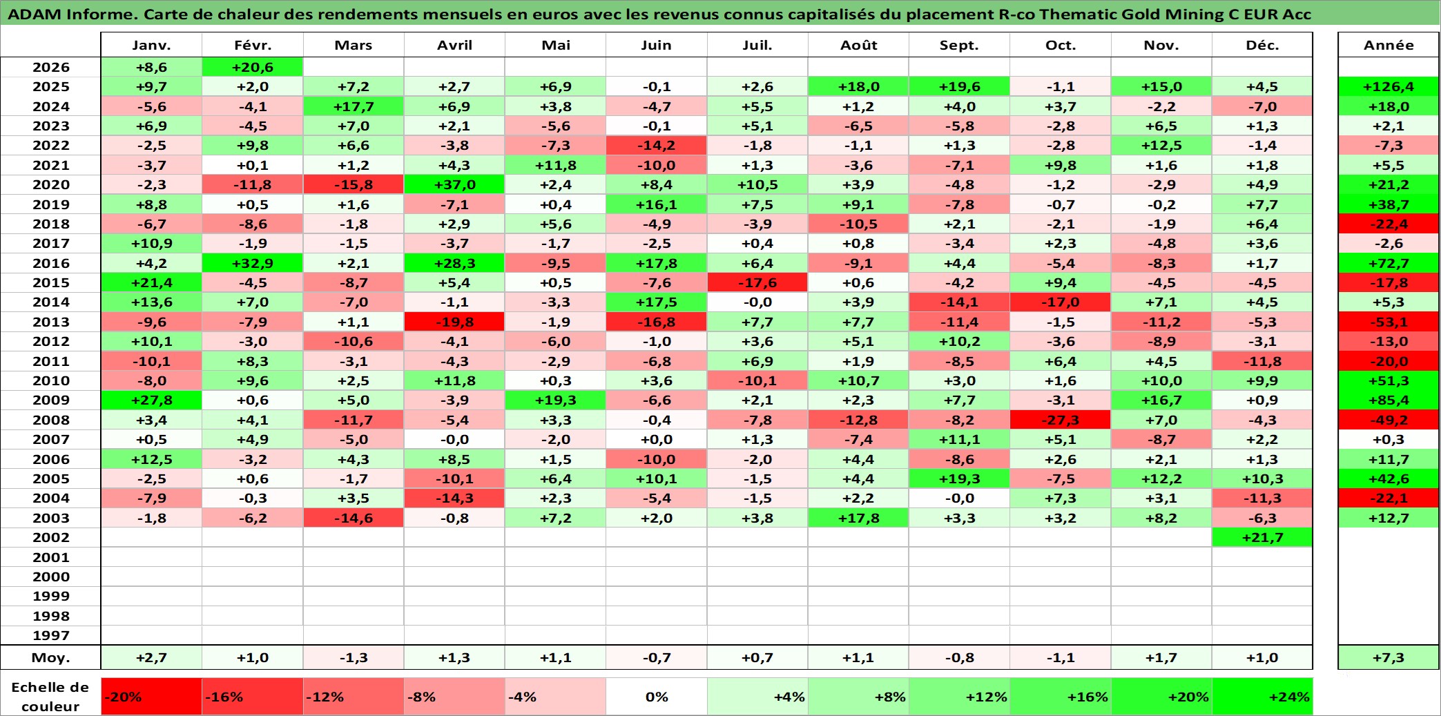 Site dédié aux investisseursPage dédiée sur site financeAnalyse des valorisations hebdomadaires du fonds R-co Thematic Gold Mining C EUR Acc. Cet actif est cote en EUR. Les valorisations couvrent les semaines 2003W01 a 2026W09. Les revenus de cet actif financier sont pris en compte depuis la semaine 2003W01. La note globale ESG de cet actif est estimee a 2.0 (apres rebasage entre 0 et 20).