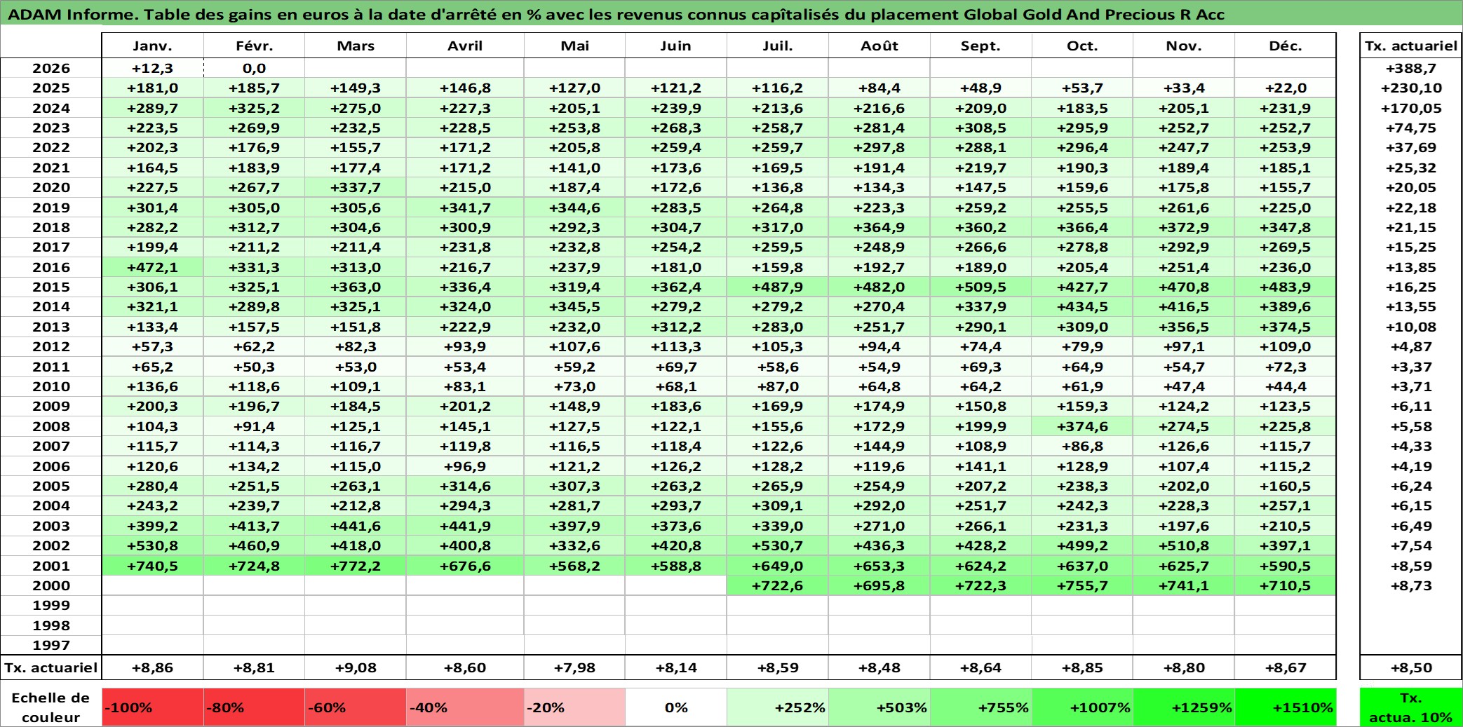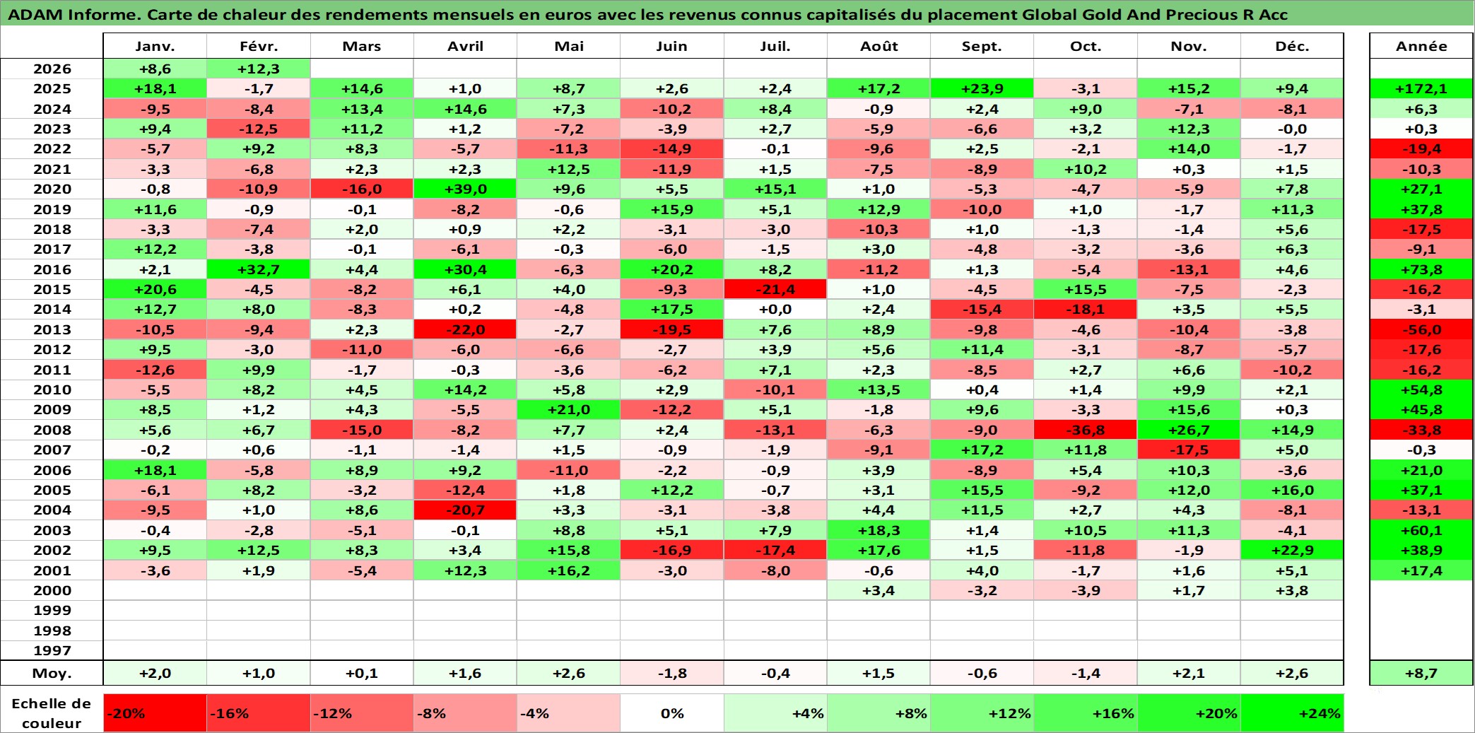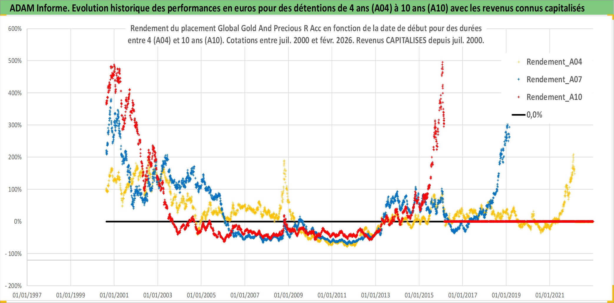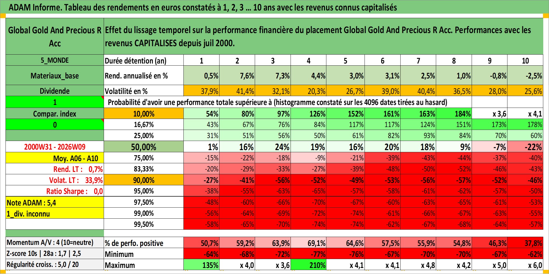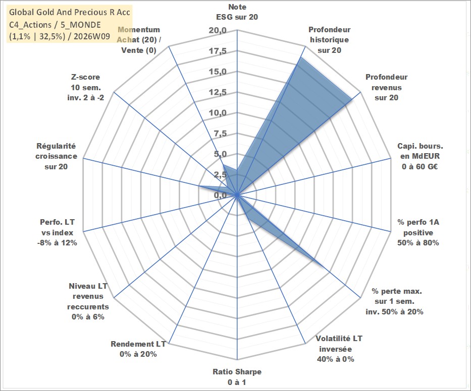 Site dédié aux investisseursPage dédiée sur site financeAnalyse des valorisations hebdomadaires du fonds Global Gold And Precious R Acc. Cet actif est cote en EUR. Les valorisations couvrent les semaines 2000W31 a 2026W09. Les revenus de cet actif financier sont pris en compte depuis la semaine 2000W31. La note globale ESG de cet actif est estimee a 3.0 (apres rebasage entre 0 et 20).