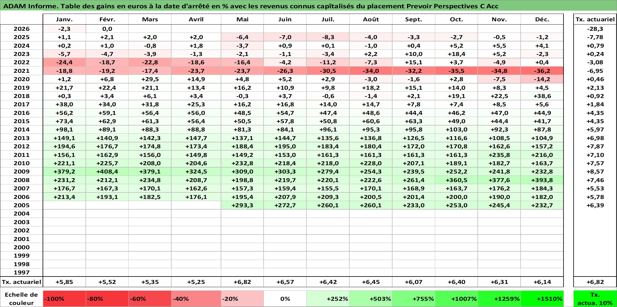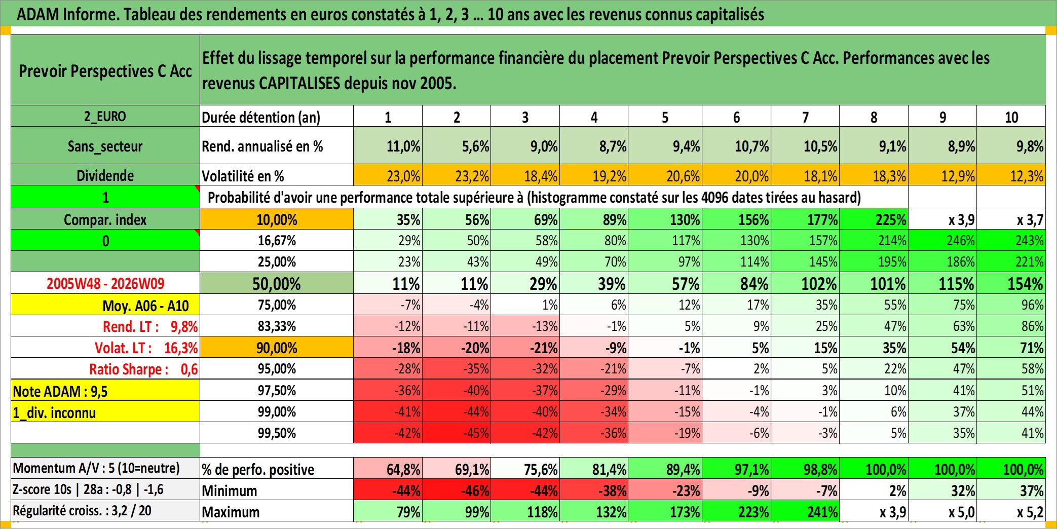 Site dédié aux investisseursPage dédiée sur site financeAnalyse des valorisations hebdomadaires du fonds Prevoir Perspectives C Acc. Cet actif est cote en EUR. Les valorisations couvrent les semaines 2005W48 a 2026W09. Les revenus de cet actif financier sont pris en compte depuis la semaine 2005W48. La note globale ESG de cet actif est estimee a 7.0 (apres rebasage entre 0 et 20).