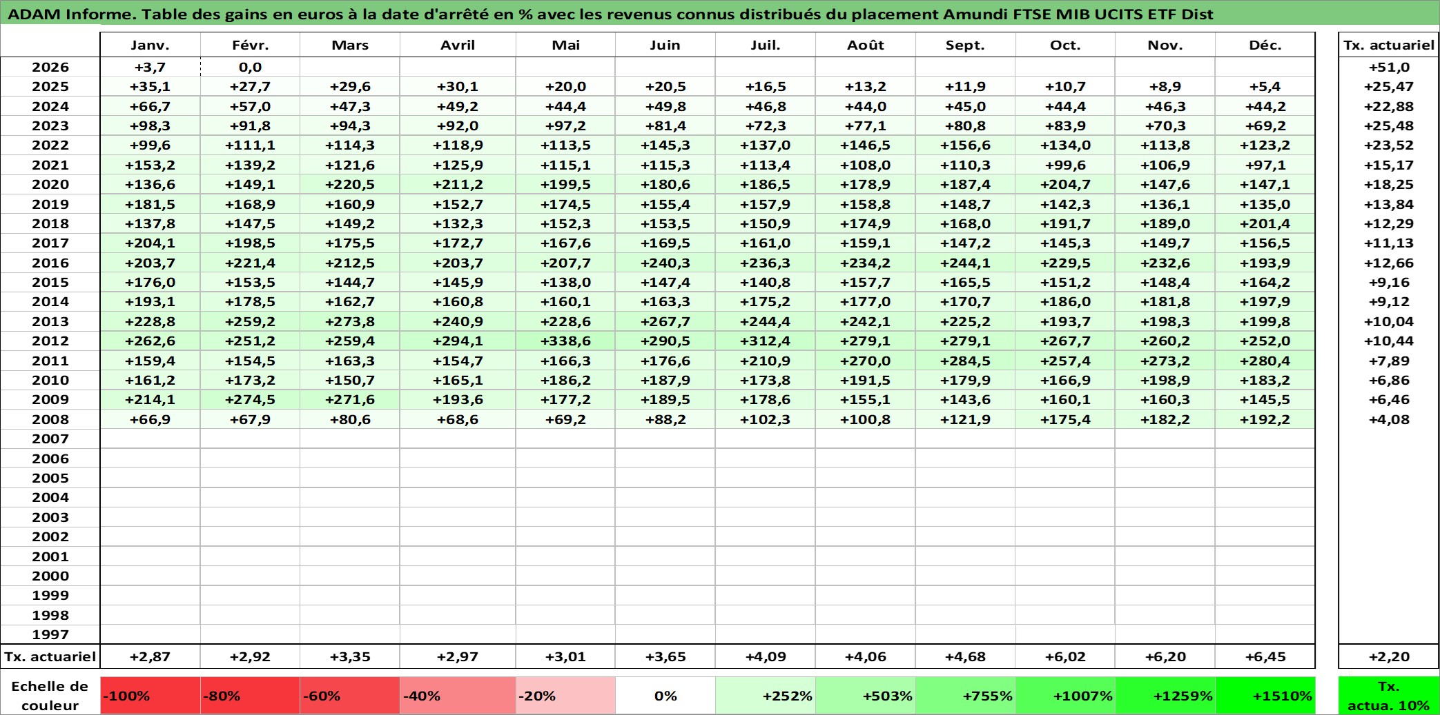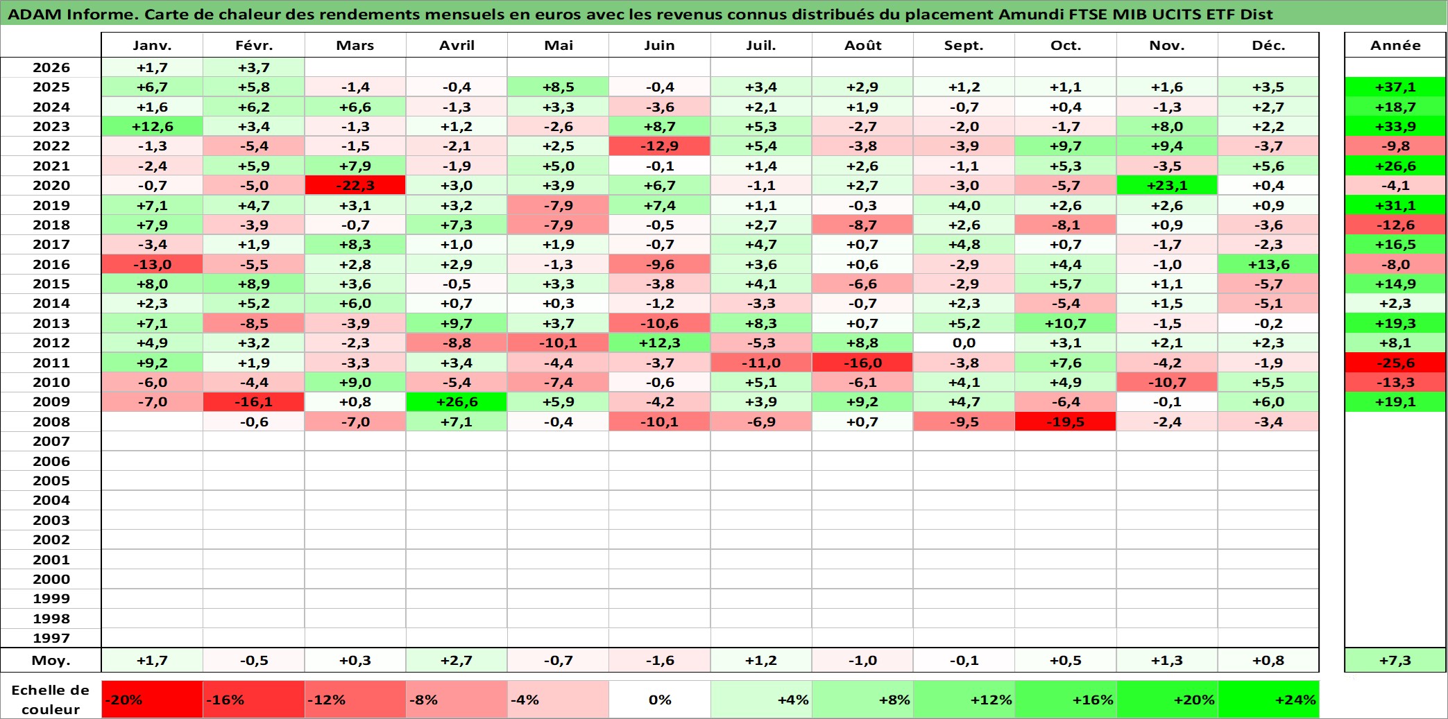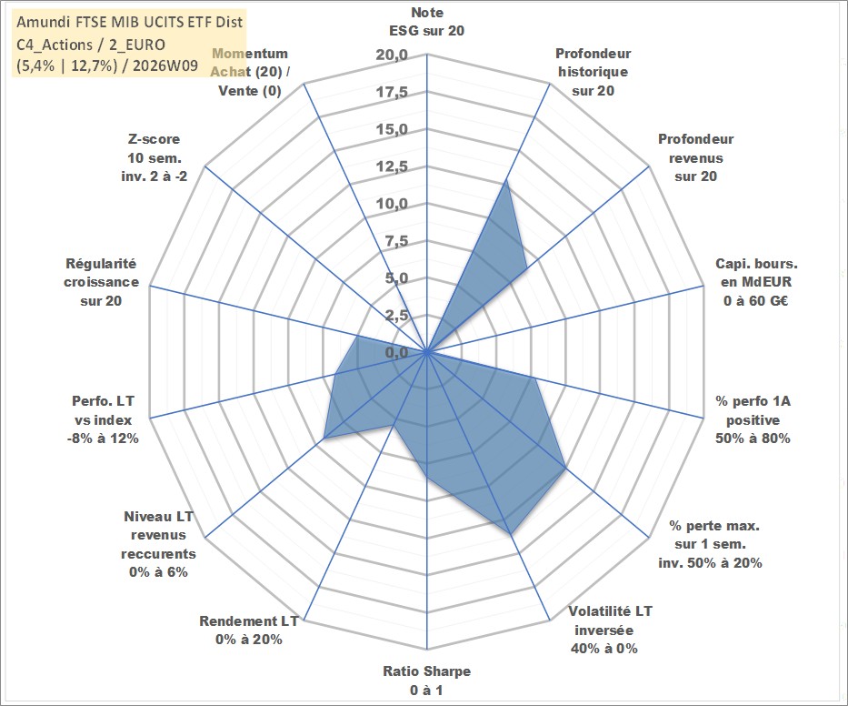 Site dédié aux investisseursPage dédiée sur site financeAnalyse des valorisations hebdomadaires du fonds Amundi FTSE MIB UCITS ETF Dist. Cet actif est cote en EUR. Les valorisations couvrent les semaines 2008W01 a 2026W09. Les revenus de cet actif financier sont pris en compte depuis la semaine 2013W28. La note ESG de cet actif n'est pas connue.