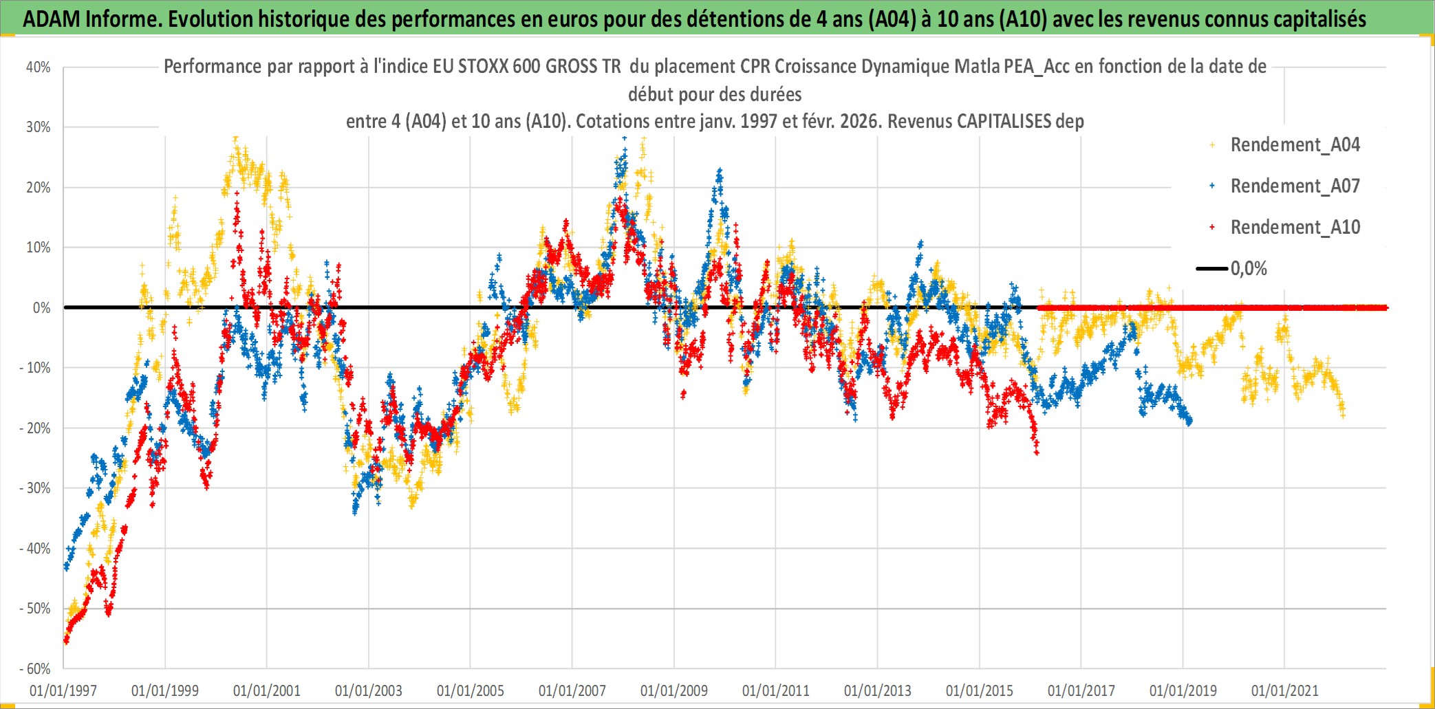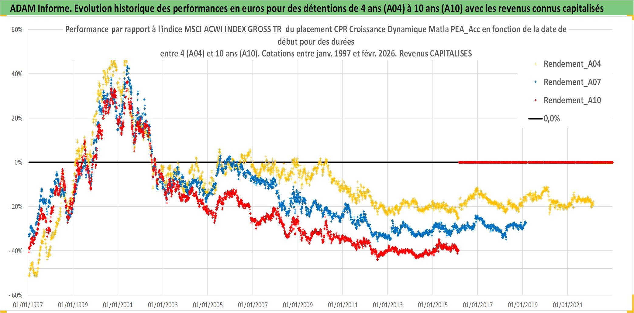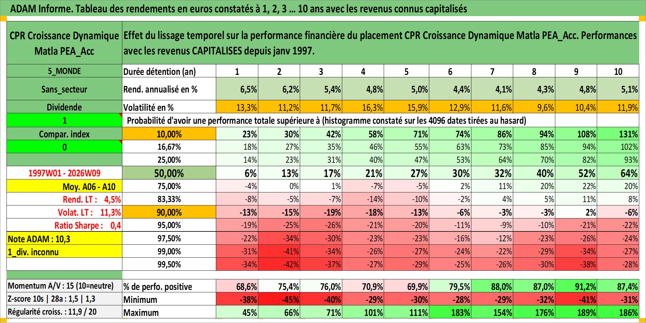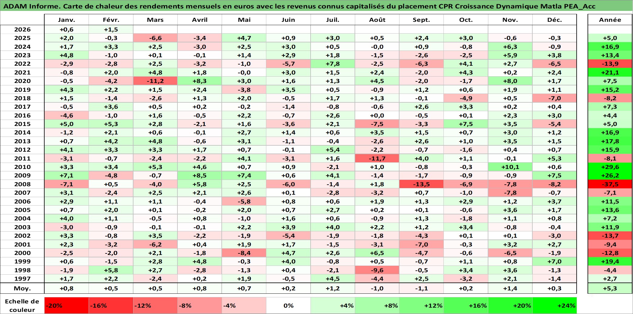 Site dédié aux investisseursPage dédiée sur site financeAnalyse des valorisations hebdomadaires du fonds CPR Croissance Dynamique Matla PEA_Acc. Cet actif est cote en EUR. Les valorisations couvrent les semaines 1997W01 a 2026W09. Les revenus de cet actif financier sont pris en compte depuis la semaine 1997W01. La note ESG de cet actif n'est pas connue.