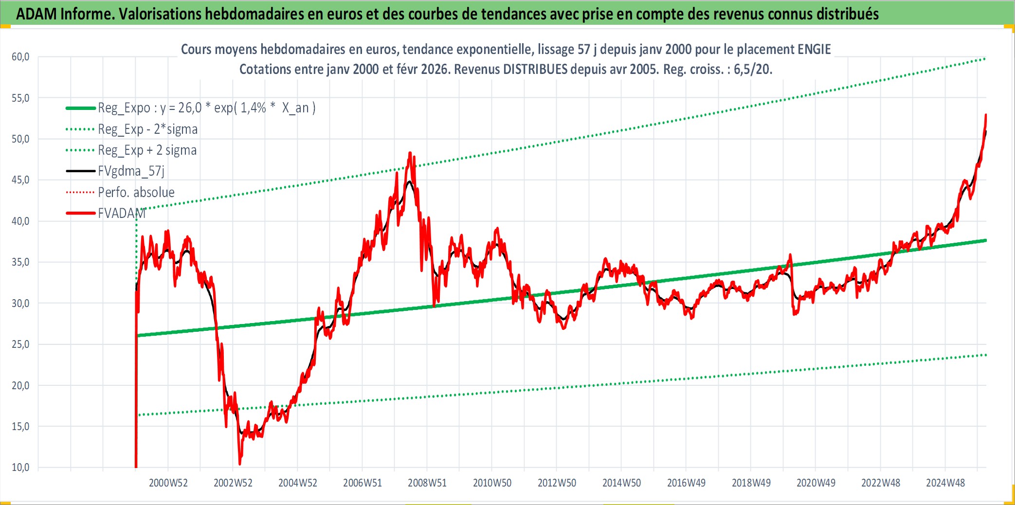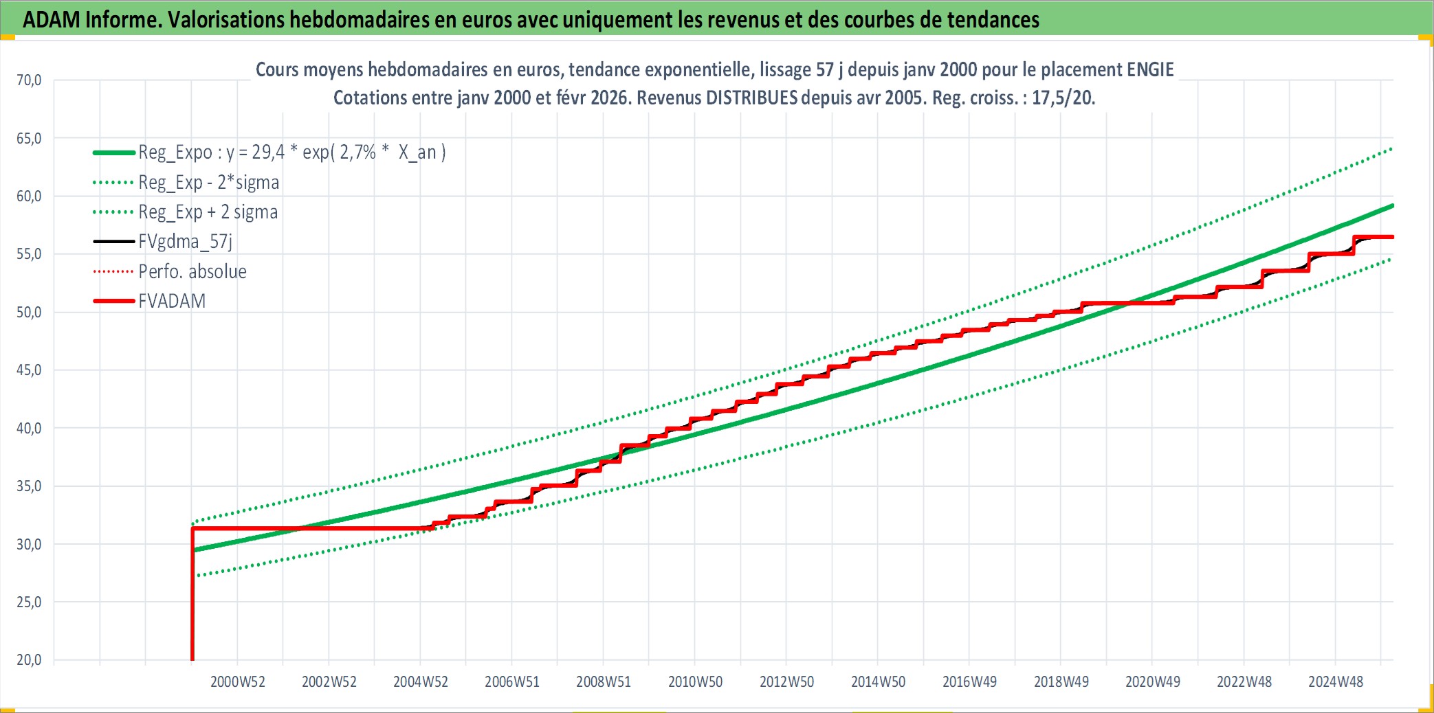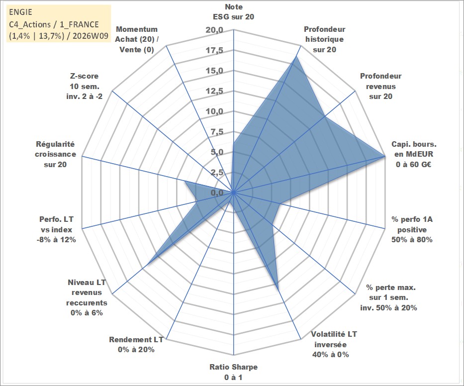 Site dédié aux investisseursPage dédiée sur site financeAnalyse des valorisations hebdomadaires de l'action ENGIE. Cet actif est cote en EUR. Les valorisations couvrent les semaines 2000W01 a 2026W09. Les revenus de cet actif financier sont pris en compte depuis la semaine 2005W14. La note globale ESG de cet actif est estimee a 6.0 (apres rebasage entre 0 et 20).