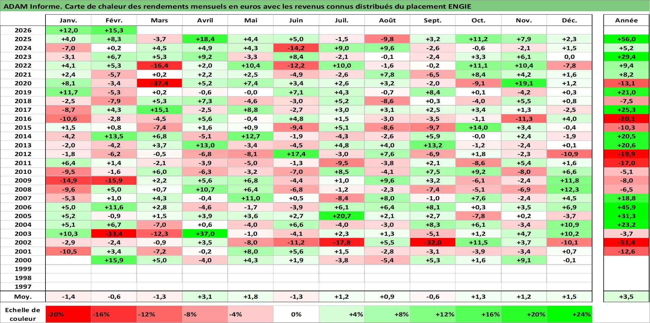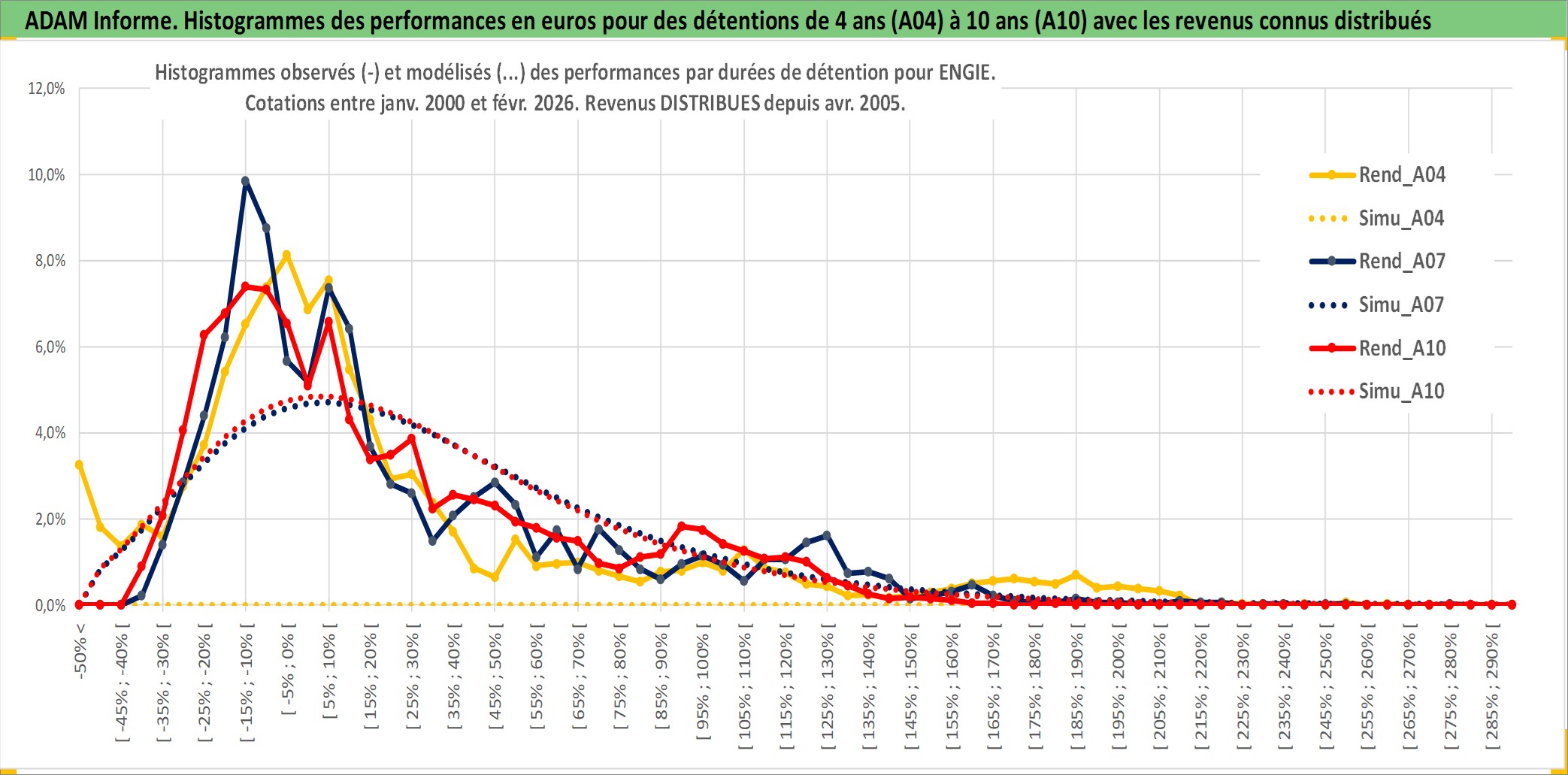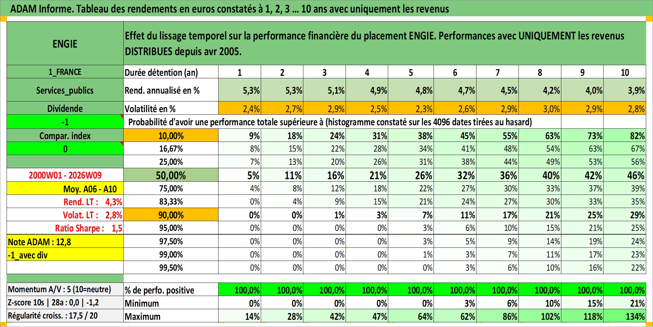 Site dédié aux investisseursPage dédiée sur site financeAnalyse des valorisations hebdomadaires de l'action ENGIE. Cet actif est cote en EUR. Les valorisations couvrent les semaines 2000W01 a 2026W09. Les revenus de cet actif financier sont pris en compte depuis la semaine 2005W14. La note globale ESG de cet actif est estimee a 6.0 (apres rebasage entre 0 et 20).