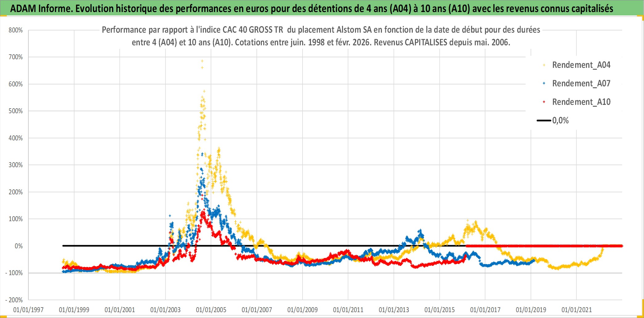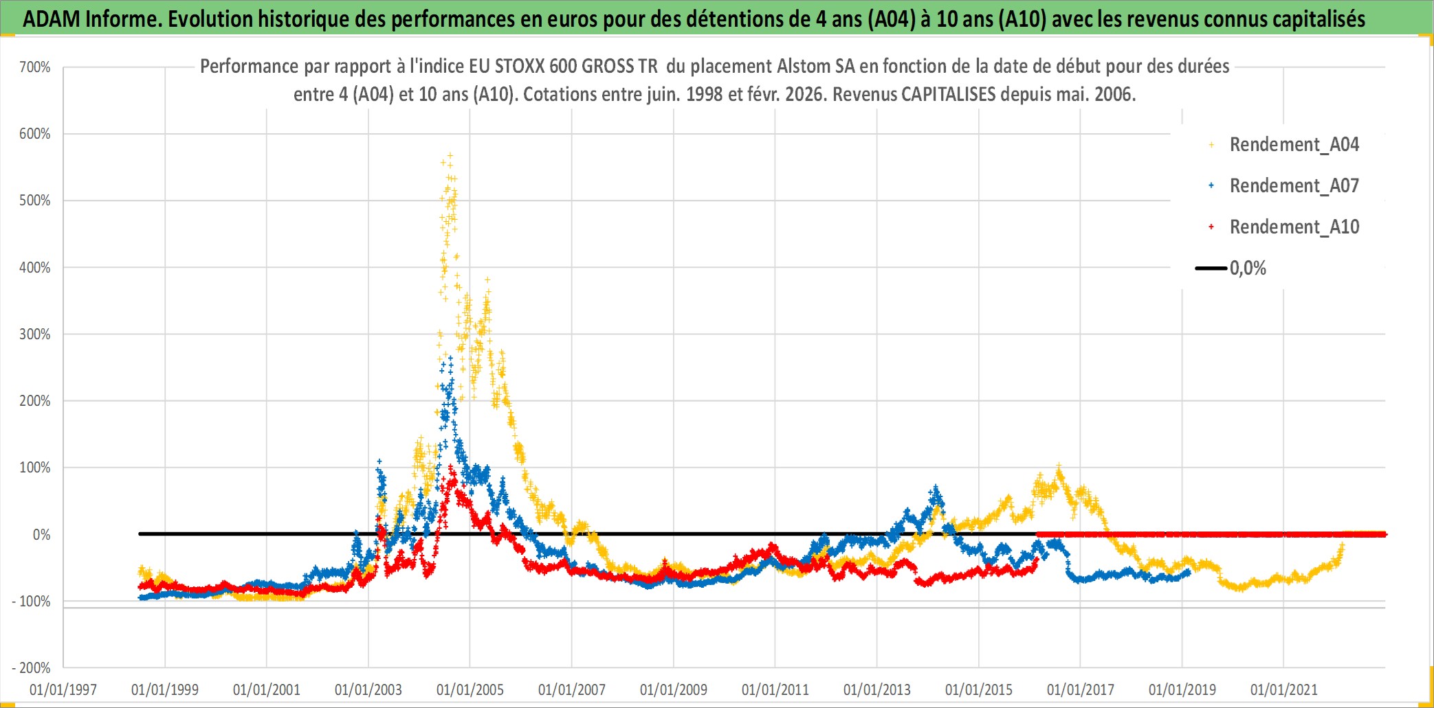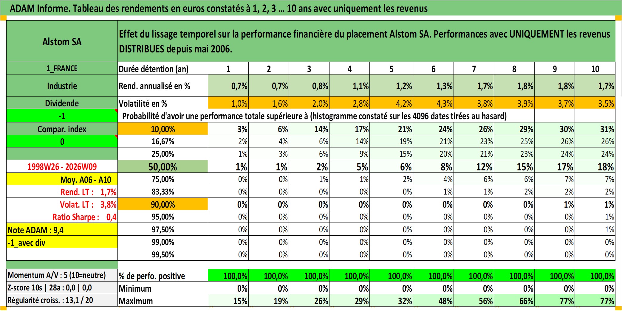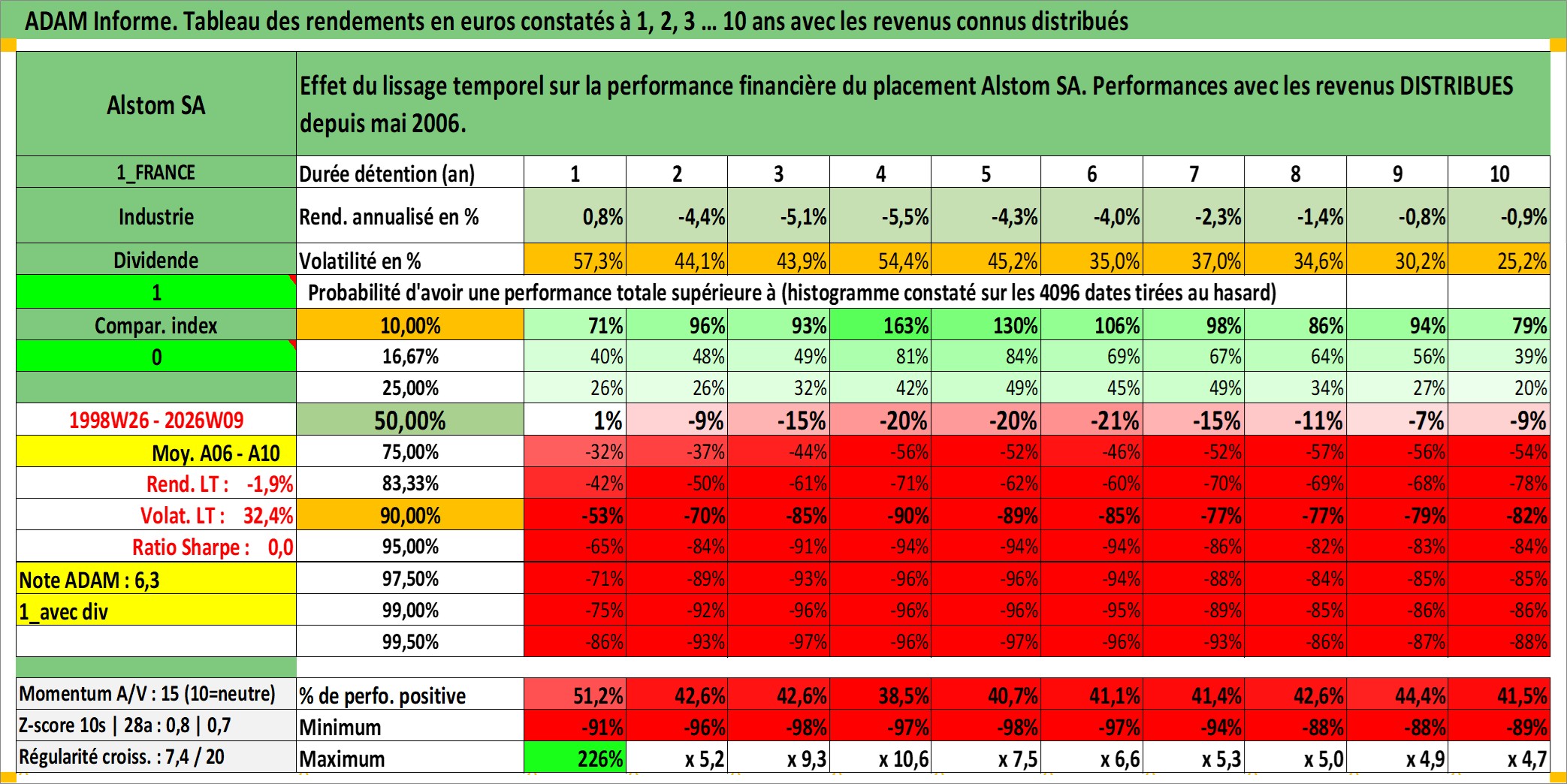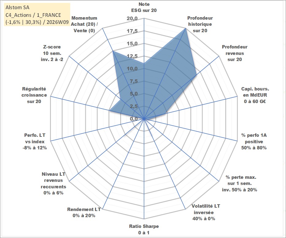 Site dédié aux investisseursPage dédiée sur site financeAnalyse des valorisations hebdomadaires de l'action Alstom SA. Cet actif est cote en EUR. Les valorisations couvrent les semaines 1998W26 a 2026W09. Les revenus de cet actif financier sont pris en compte depuis la semaine 2006W20. La note globale ESG de cet actif est estimee a 11.0 (apres rebasage entre 0 et 20).