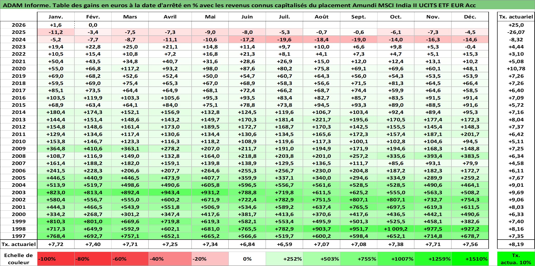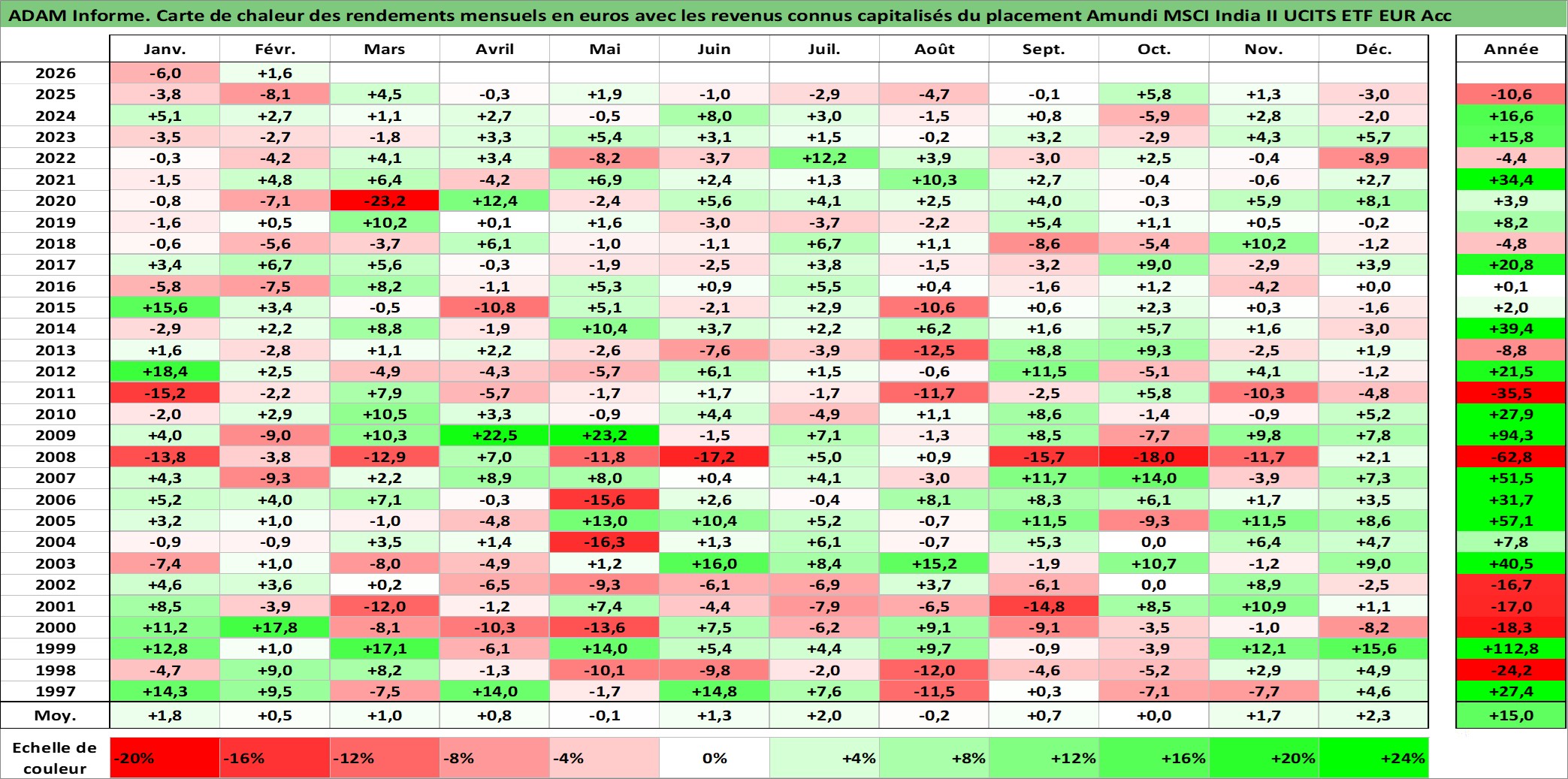 Site dédié aux investisseursPage dédiée sur site financeAnalyse des valorisations hebdomadaires du fonds Amundi MSCI India II UCITS ETF EUR Acc. Cet actif est cote en EUR. Les valorisations couvrent les semaines 1997W01 a 2026W09. Les revenus de cet actif financier sont pris en compte depuis la semaine 1997W01. La note ESG de cet actif n'est pas connue.