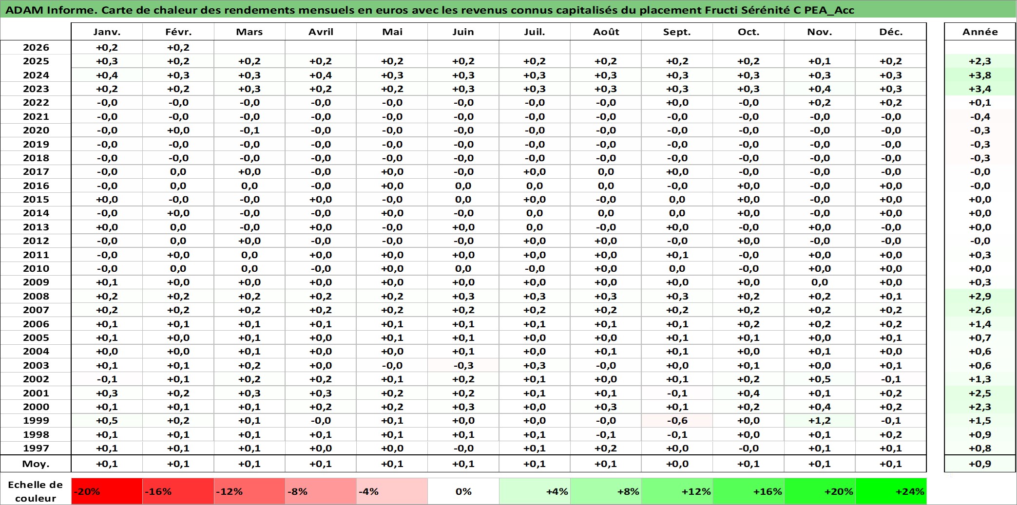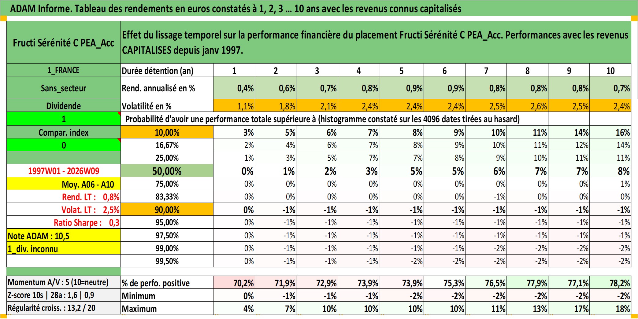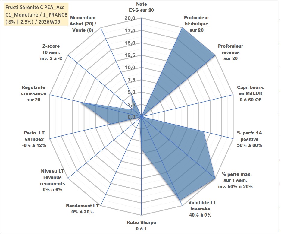 Site dédié aux investisseursPage dédiée sur site financeAnalyse des valorisations hebdomadaires du fonds Fructi Sérénité C PEA_Acc. Cet actif est cote en EUR. Les valorisations couvrent les semaines 1997W01 a 2026W09. Les revenus de cet actif financier sont pris en compte depuis la semaine 1997W01. La note ESG de cet actif n'est pas connue.