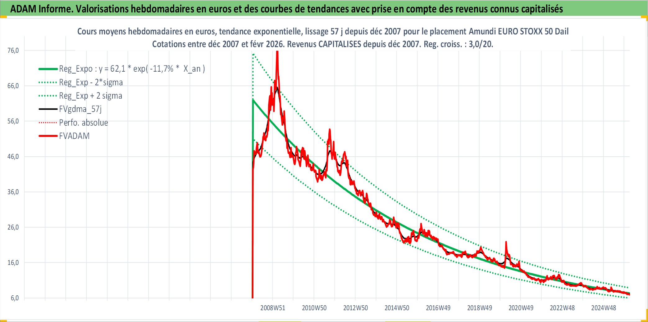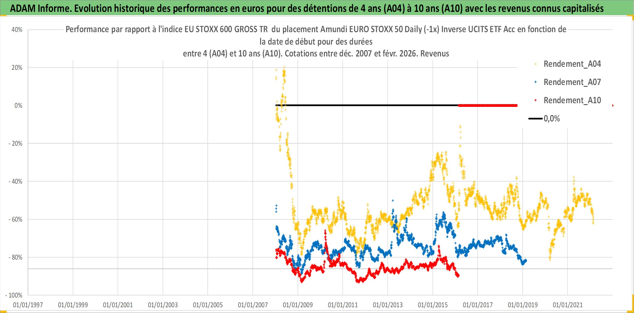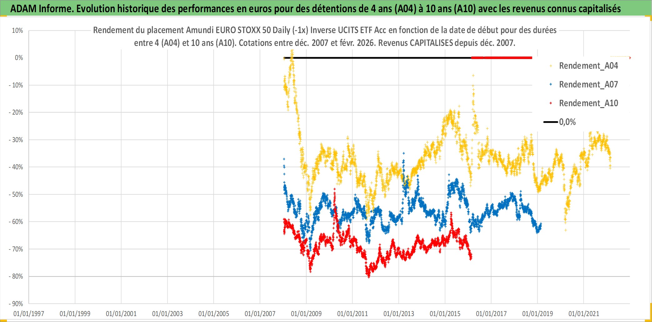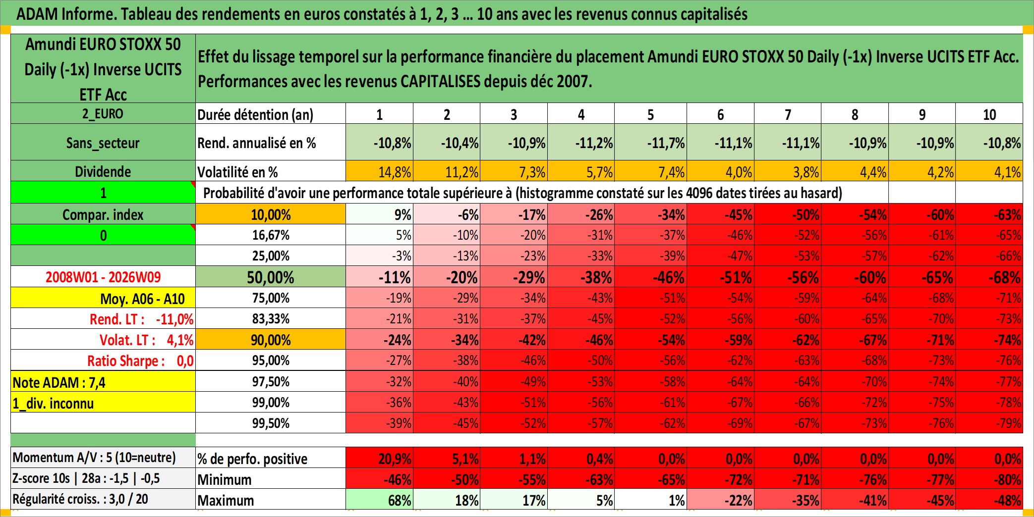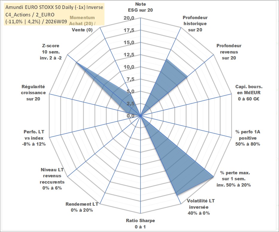 Site dédié aux investisseursPage dédiée sur site financeAnalyse des valorisations hebdomadaires du fonds Amundi EURO STOXX 50 Daily (-1x) Inverse UCITS ETF Acc. Cet actif est cote en EUR. Les valorisations couvrent les semaines 2008W01 a 2026W09. Les revenus de cet actif financier sont pris en compte depuis la semaine 2008W01. La note ESG de cet actif n'est pas connue.