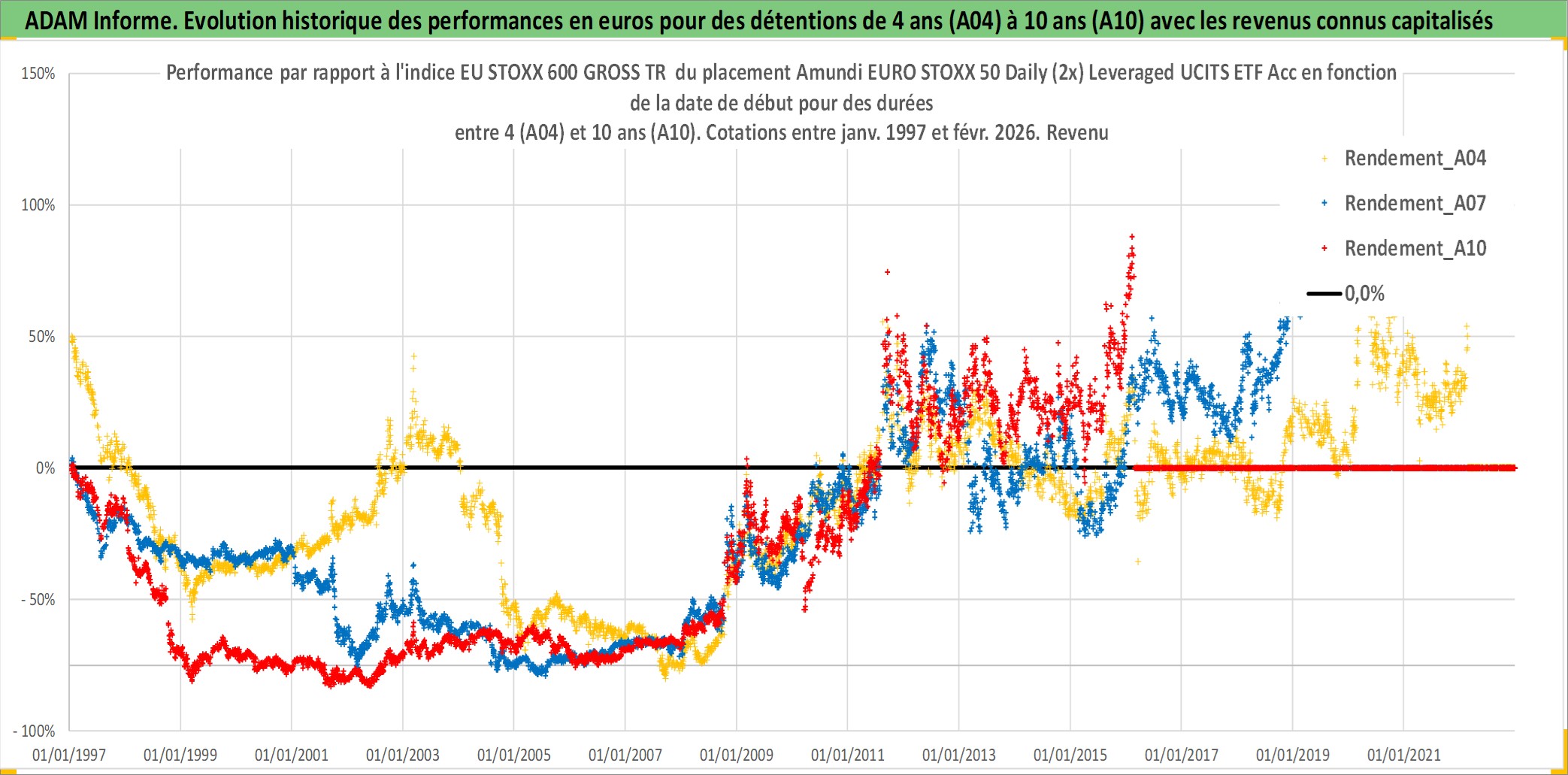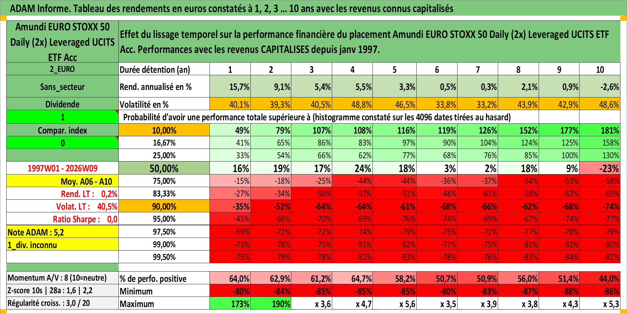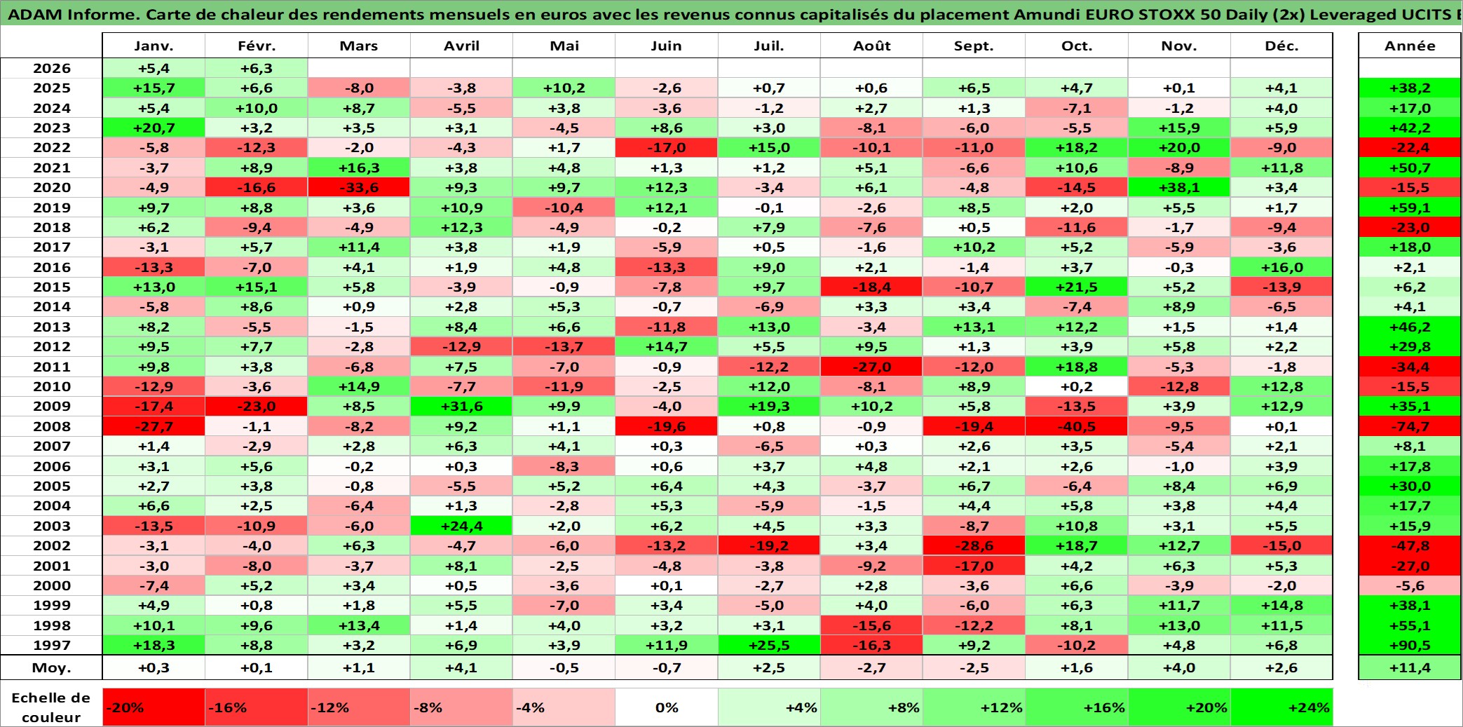 Site dédié aux investisseursPage dédiée sur site financeAnalyse des valorisations hebdomadaires du fonds Amundi EURO STOXX 50 Daily (2x) Leveraged UCITS ETF Acc. Cet actif est cote en EUR. Les valorisations couvrent les semaines 1997W01 a 2026W09. Les revenus de cet actif financier sont pris en compte depuis la semaine 1997W01. La note ESG de cet actif n'est pas connue.