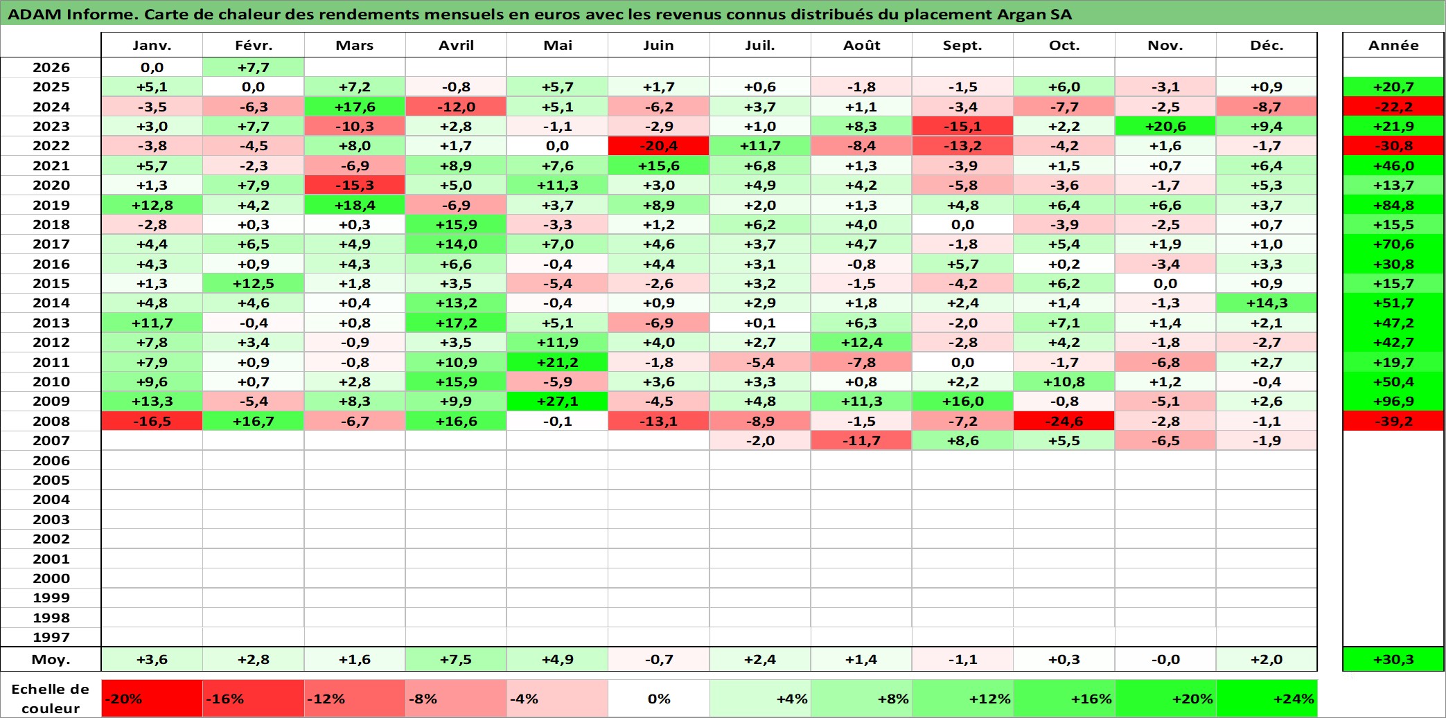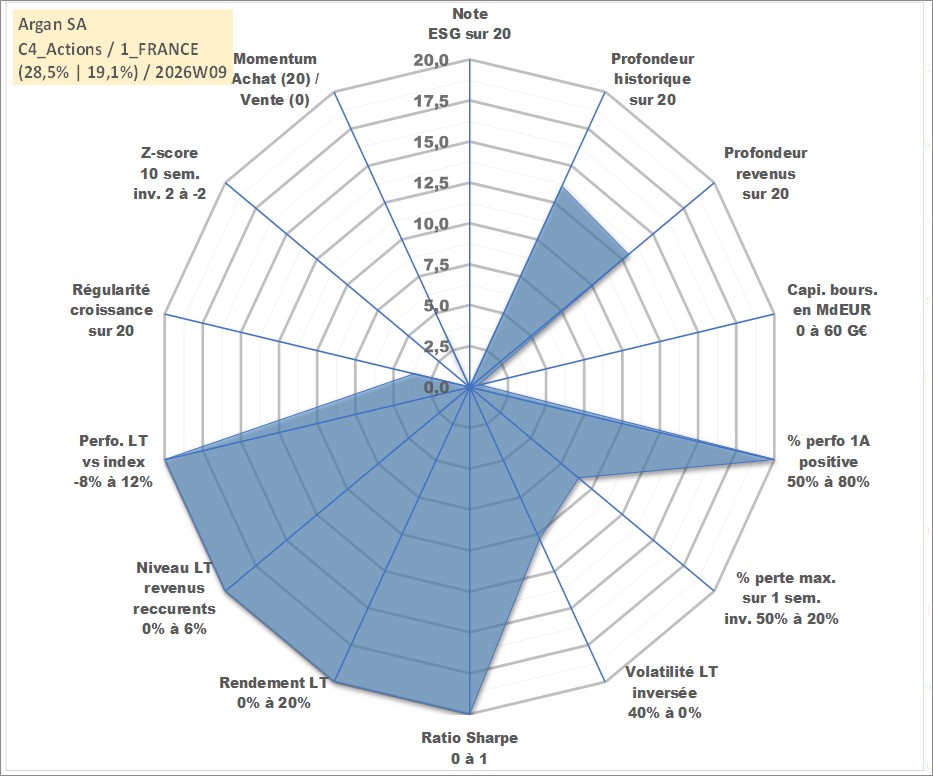 Site dédié aux investisseursPage dédiée sur site financeAnalyse des valorisations hebdomadaires de l'action Argan SA. Cet actif est cote en EUR. Les valorisations couvrent les semaines 2007W26 a 2026W09. Les revenus de cet actif financier sont pris en compte depuis la semaine 2008W16. La note ESG de cet actif n'est pas connue.