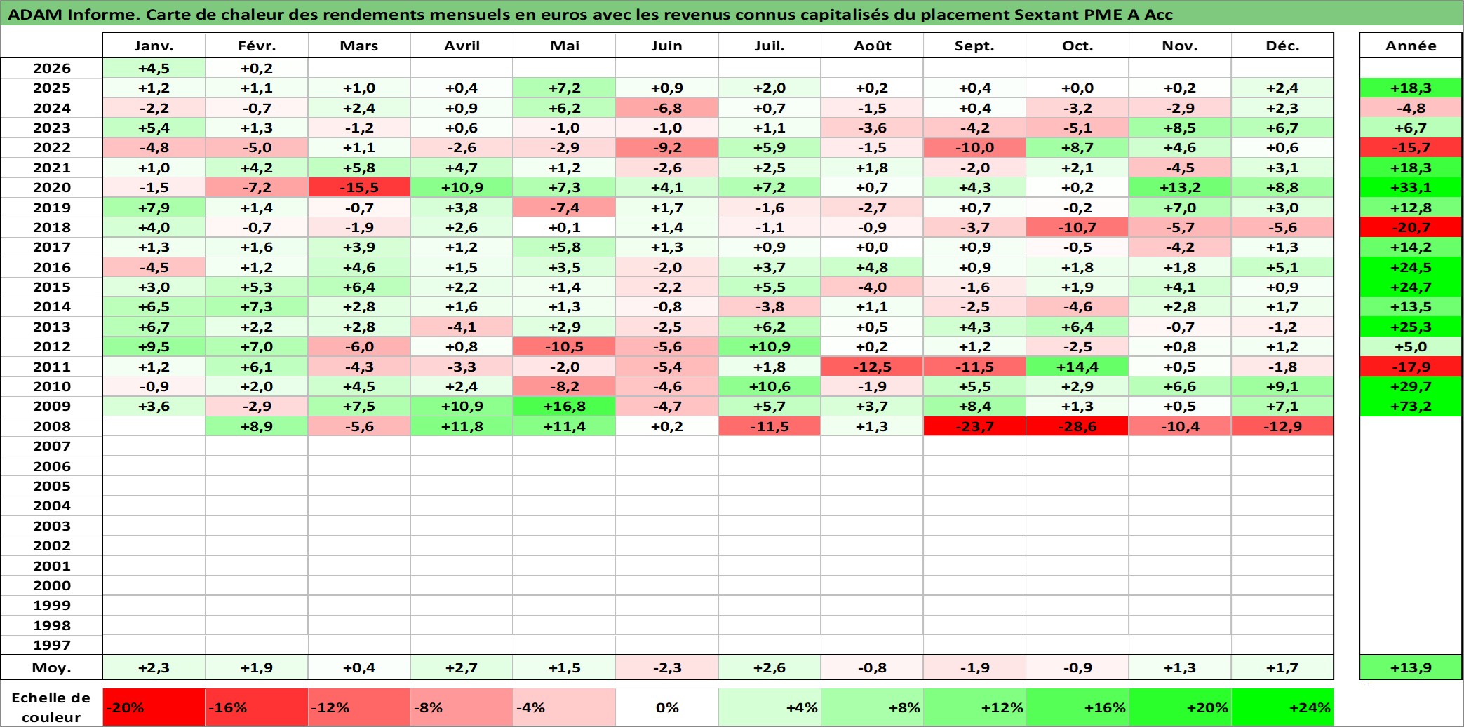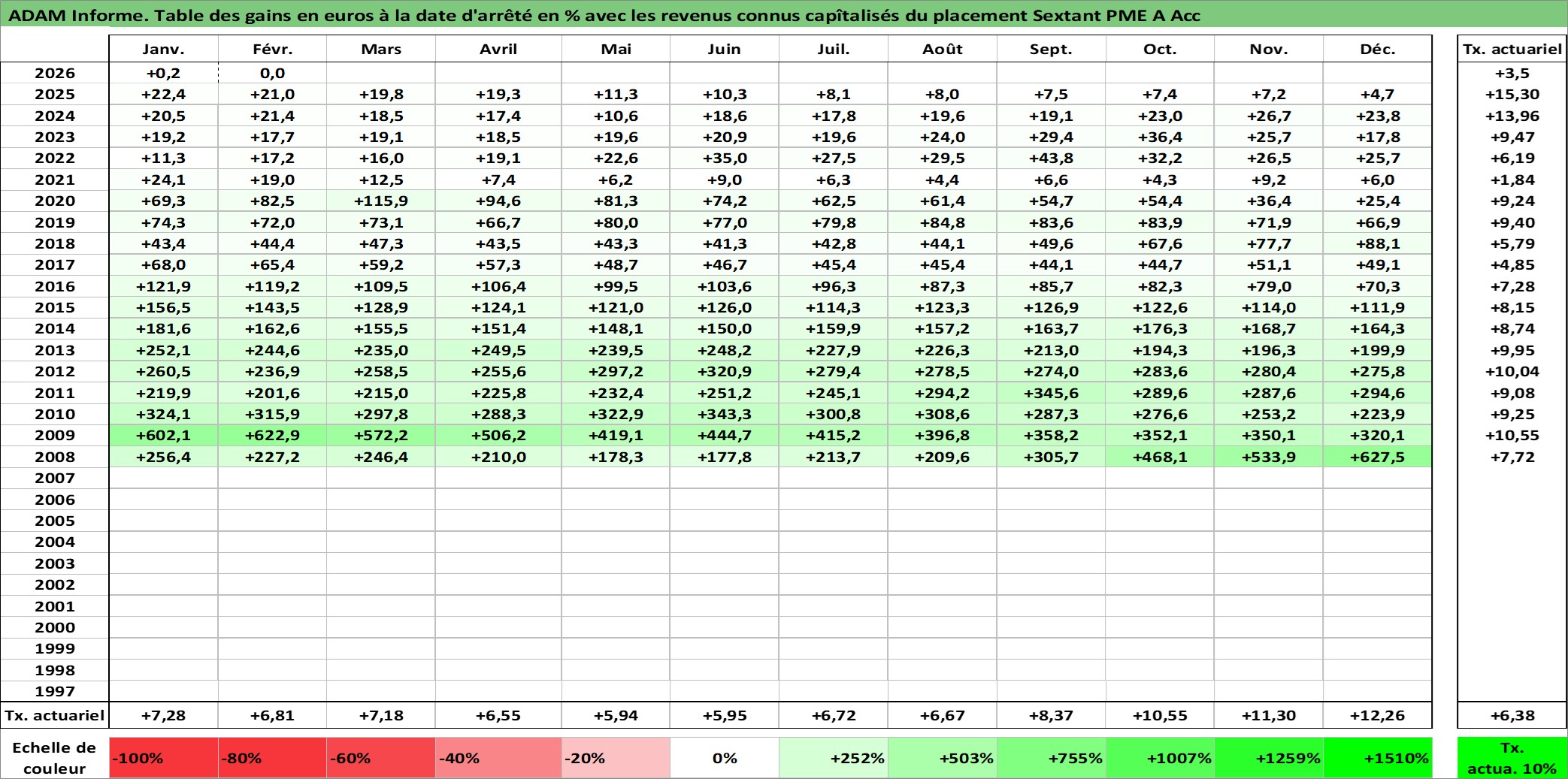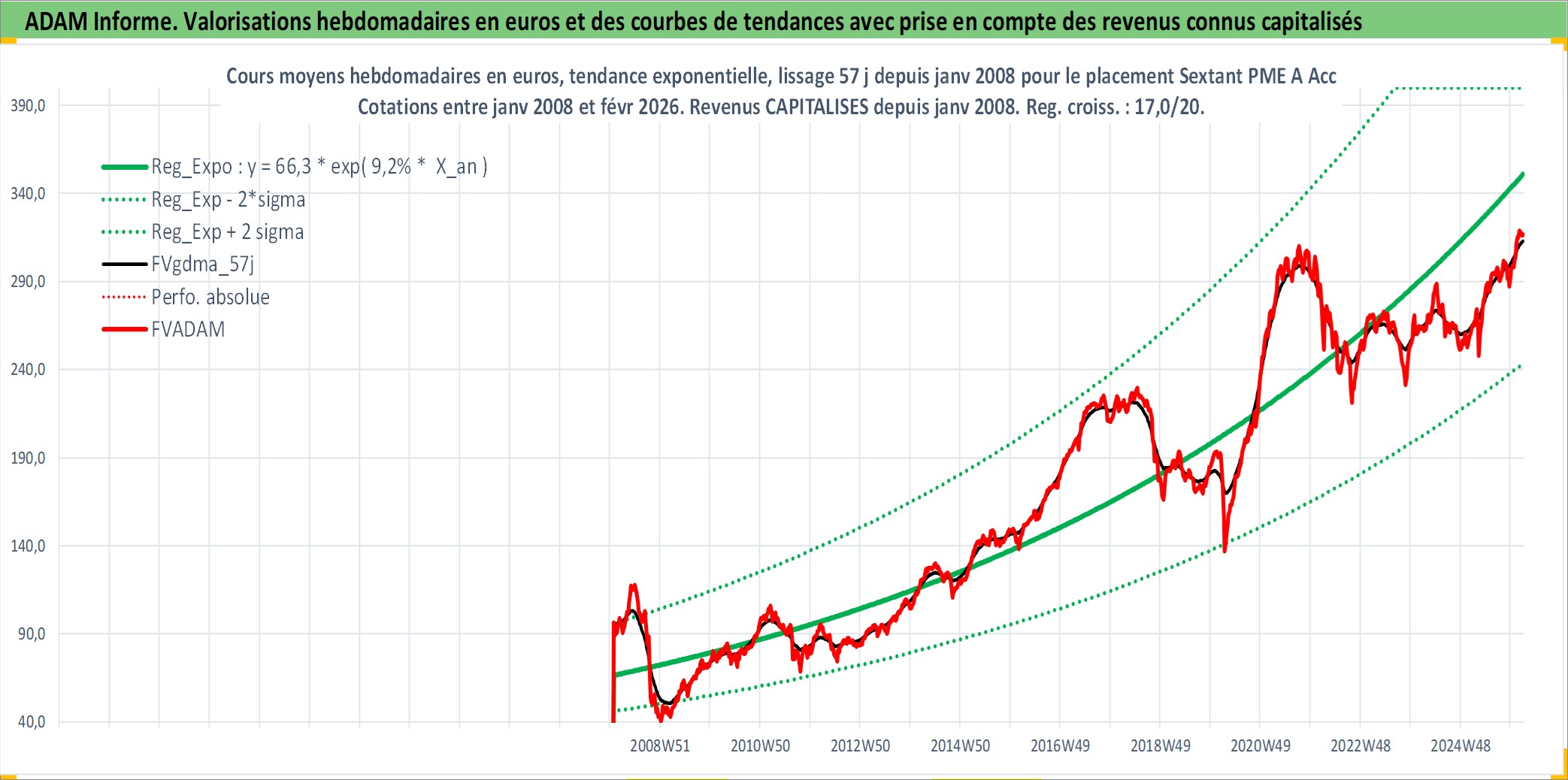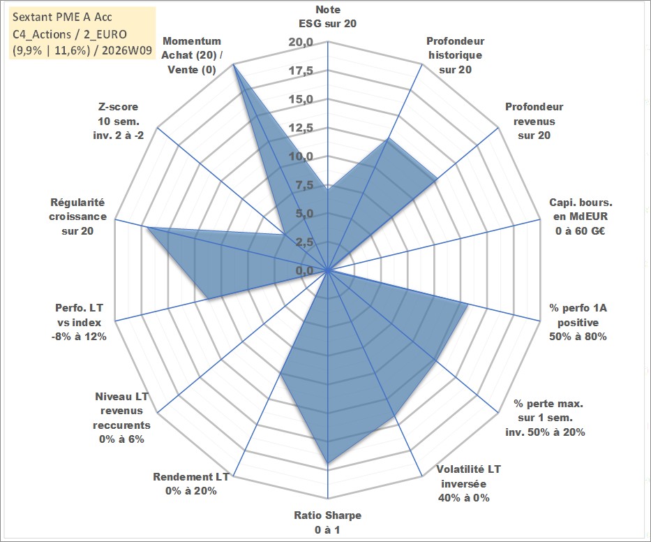Site dédié aux investisseursPage dédiée sur site financeAnalyse des valorisations hebdomadaires du fonds Sextant PME A Acc. Cet actif est cote en EUR. Les valorisations couvrent les semaines 2008W03 a 2026W09. Les revenus de cet actif financier sont pris en compte depuis la semaine 2008W03. La note globale ESG de cet actif est estimee a 7.0 (apres rebasage entre 0 et 20).