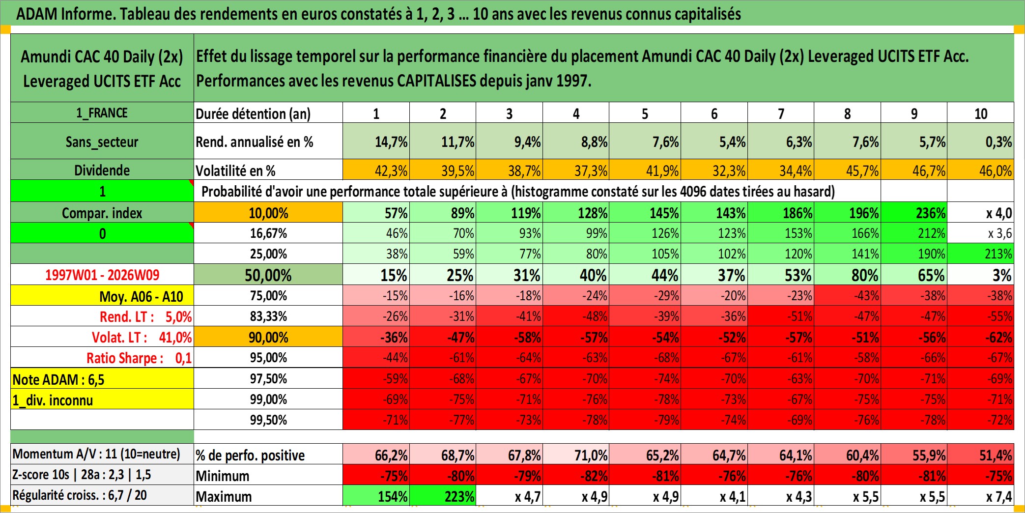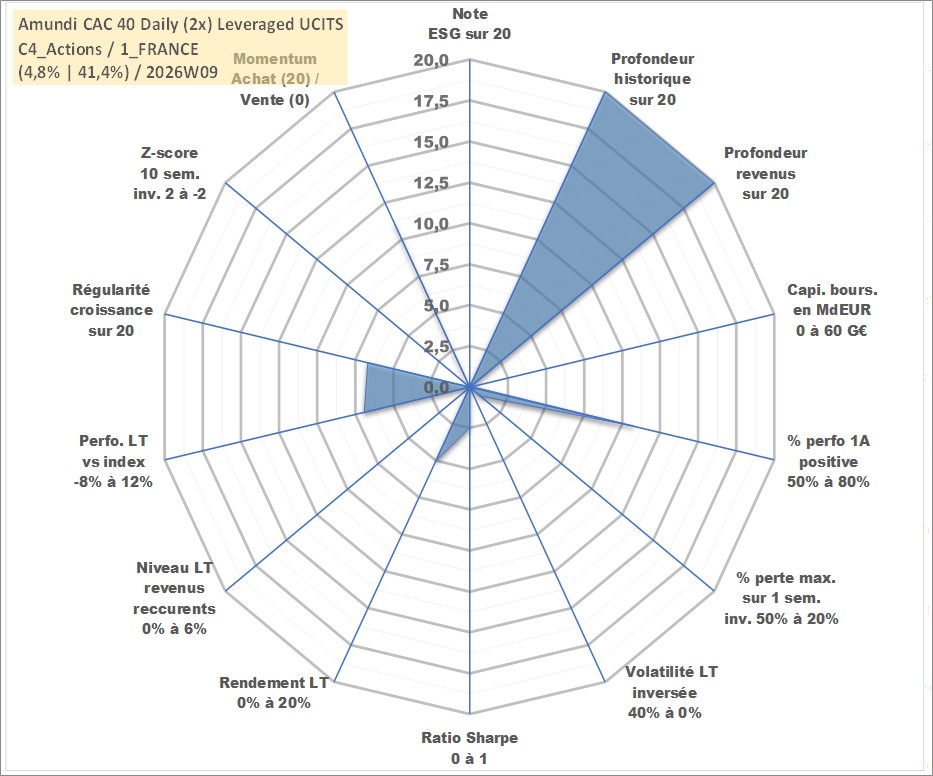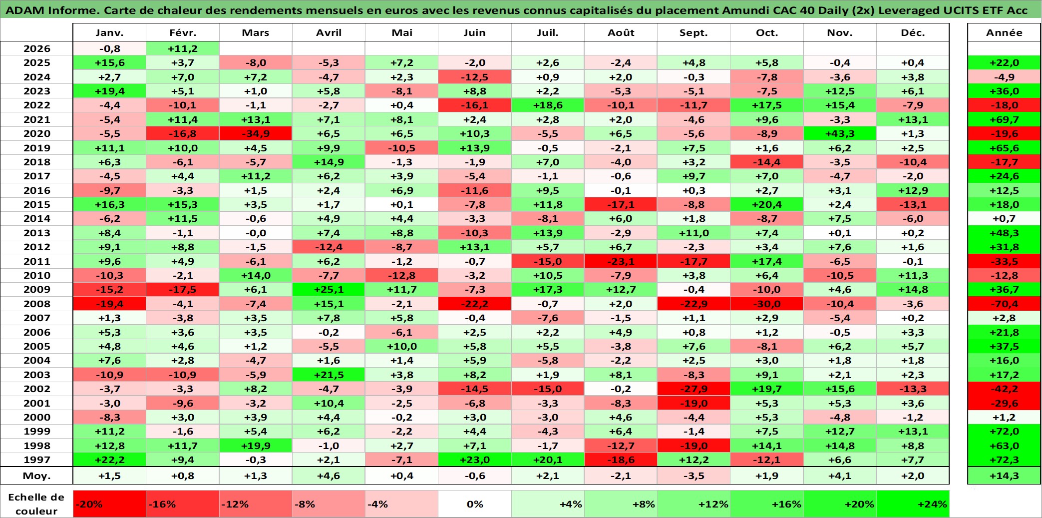 Site dédié aux investisseursPage dédiée sur site financeAnalyse des valorisations hebdomadaires du fonds Amundi CAC 40 Daily (2x) Leveraged UCITS ETF Acc. Cet actif est cote en EUR. Les valorisations couvrent les semaines 1997W01 a 2026W09. Les revenus de cet actif financier sont pris en compte depuis la semaine 1997W01. La note ESG de cet actif n'est pas connue.