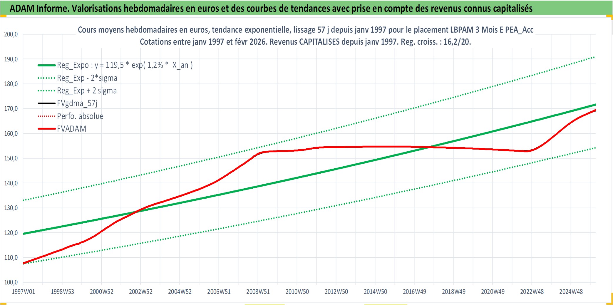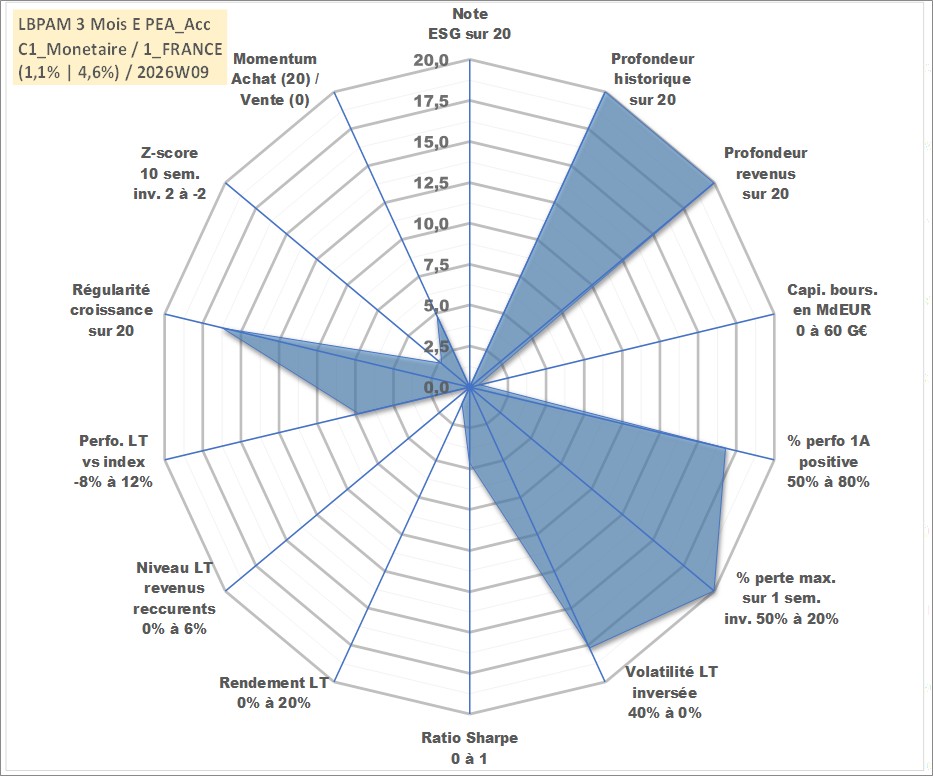 Site dédié aux investisseursPage dédiée sur site financeAnalyse des valorisations hebdomadaires du fonds LBPAM 3 Mois E PEA_Acc. Cet actif est cote en EUR. Les valorisations couvrent les semaines 1997W01 a 2026W09. Les revenus de cet actif financier sont pris en compte depuis la semaine 1997W01. La note ESG de cet actif n'est pas connue.