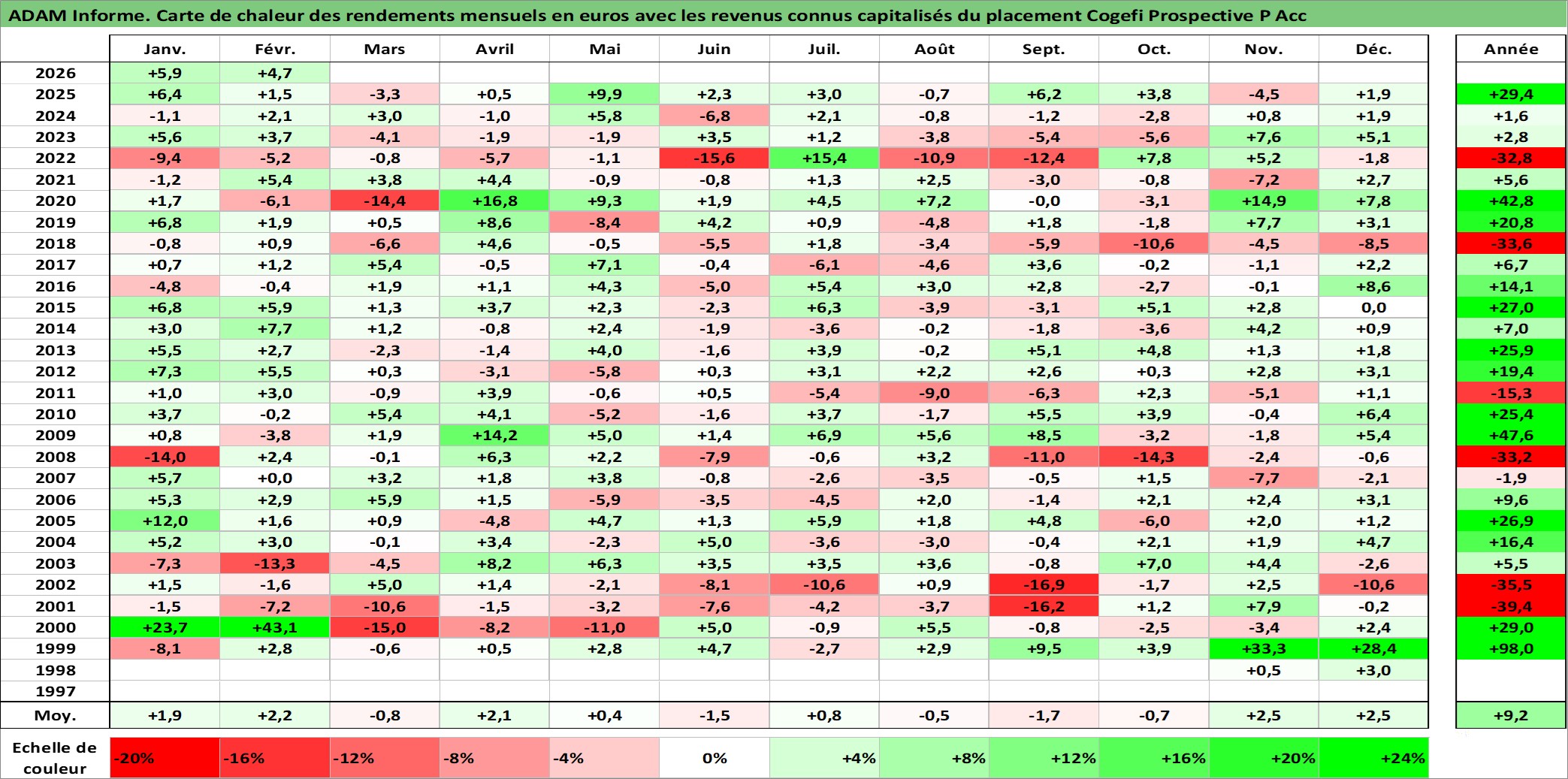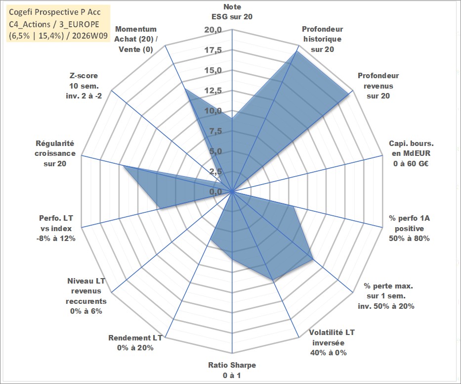 Site dédié aux investisseursPage dédiée sur site financeAnalyse des valorisations hebdomadaires du fonds Cogefi Prospective P Acc. Cet actif est cote en EUR. Les valorisations couvrent les semaines 1998W42 a 2026W09. Les revenus de cet actif financier sont pris en compte depuis la semaine 1998W42. La note globale ESG de cet actif est estimee a 9.0 (apres rebasage entre 0 et 20).