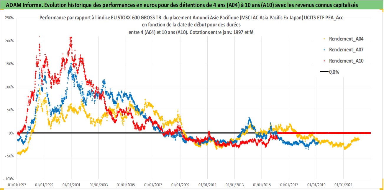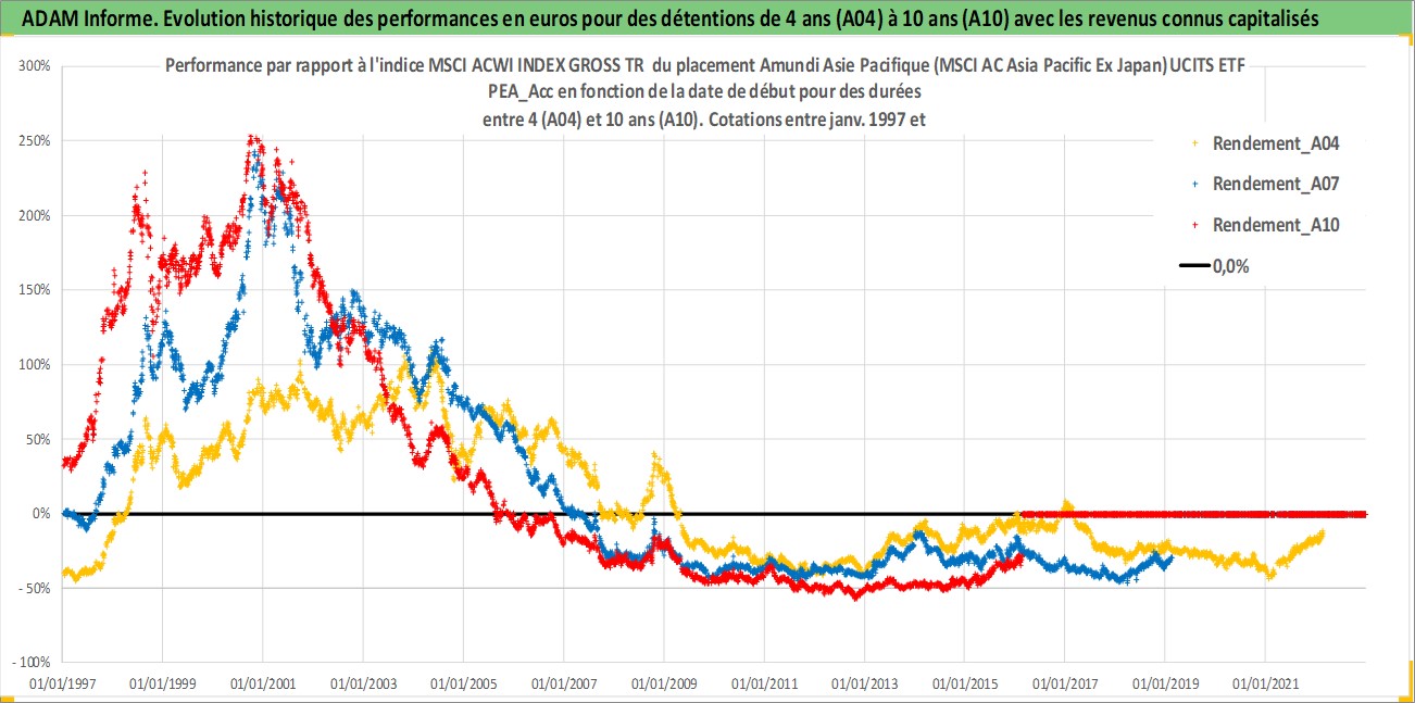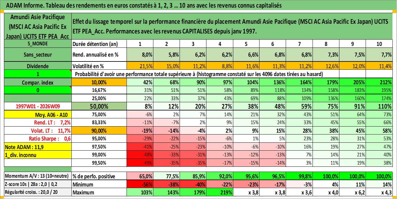Site dédié aux investisseursPage dédiée sur site financeAnalyse des valorisations hebdomadaires du fonds Amundi Asie Pacifique (MSCI AC Asia Pacific Ex Japan) UCITS ETF PEA_Acc. Cet actif est cote en EUR. Les valorisations couvrent les semaines 1997W01 a 2026W09. Les revenus de cet actif financier sont pris en compte depuis la semaine 1997W01. La note ESG de cet actif n'est pas connue.
