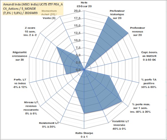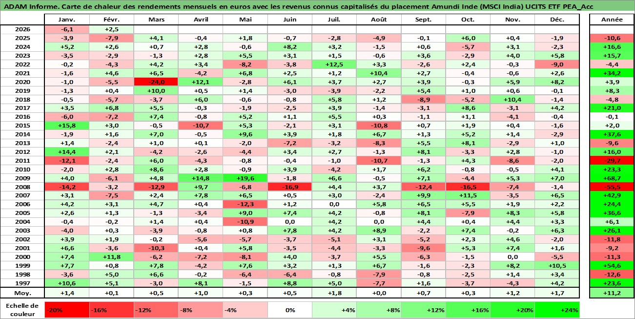 Site dédié aux investisseursPage dédiée sur site financeAnalyse des valorisations hebdomadaires du fonds Amundi Inde (MSCI India) UCITS ETF PEA_Acc. Cet actif est cote en EUR. Les valorisations couvrent les semaines 1997W01 a 2026W09. Les revenus de cet actif financier sont pris en compte depuis la semaine 1997W01. La note ESG de cet actif n'est pas connue.