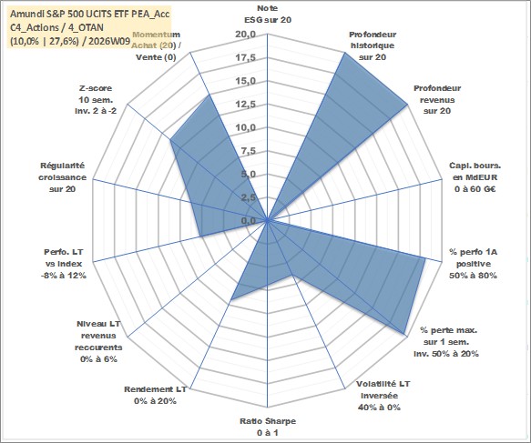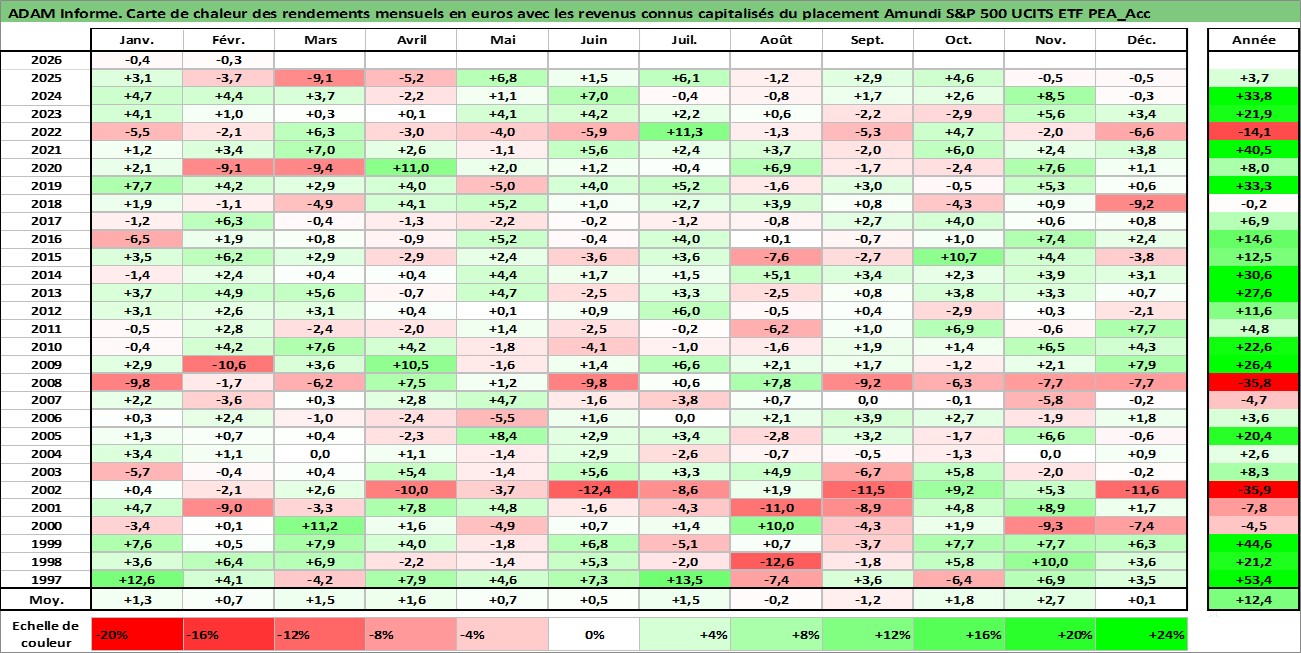 Site dédié aux investisseursPage dédiée sur site financeAnalyse des valorisations hebdomadaires du fonds Amundi S&P 500 UCITS ETF PEA_Acc. Cet actif est cote en EUR. Les valorisations couvrent les semaines 1997W01 a 2026W09. Les revenus de cet actif financier sont pris en compte depuis la semaine 1997W01. La note ESG de cet actif n'est pas connue.