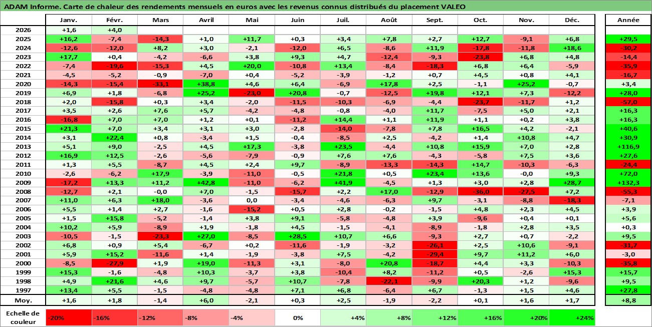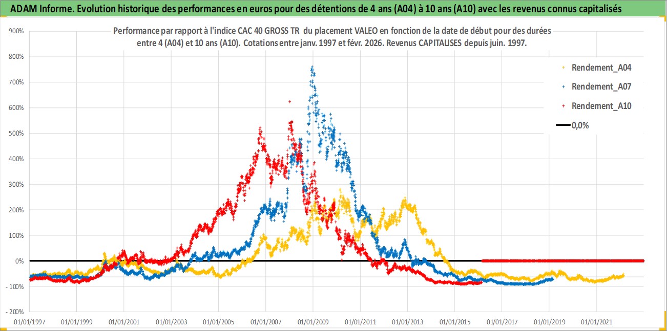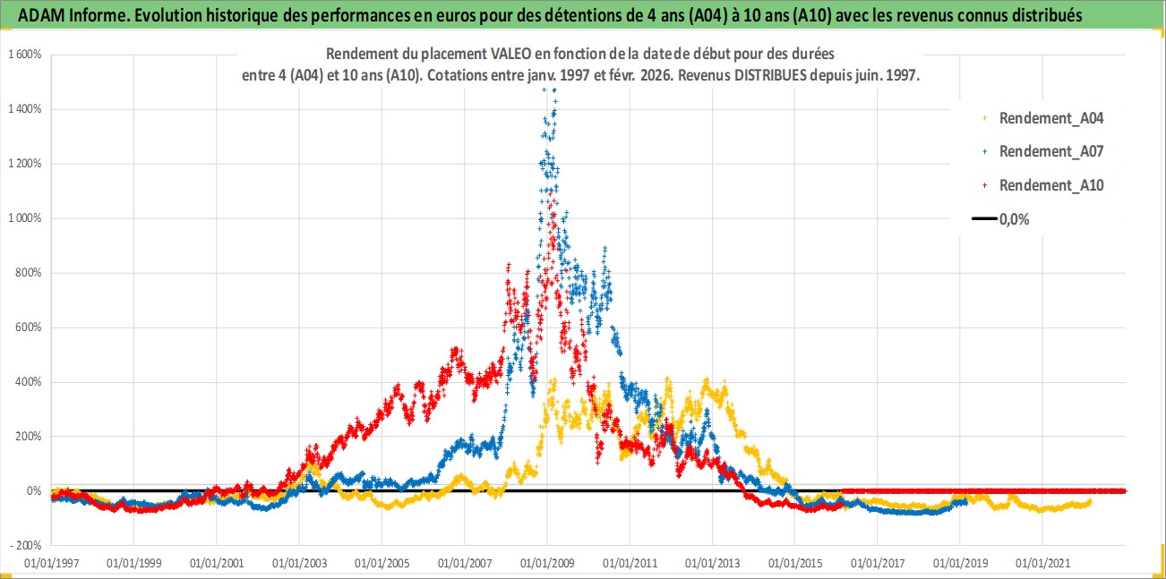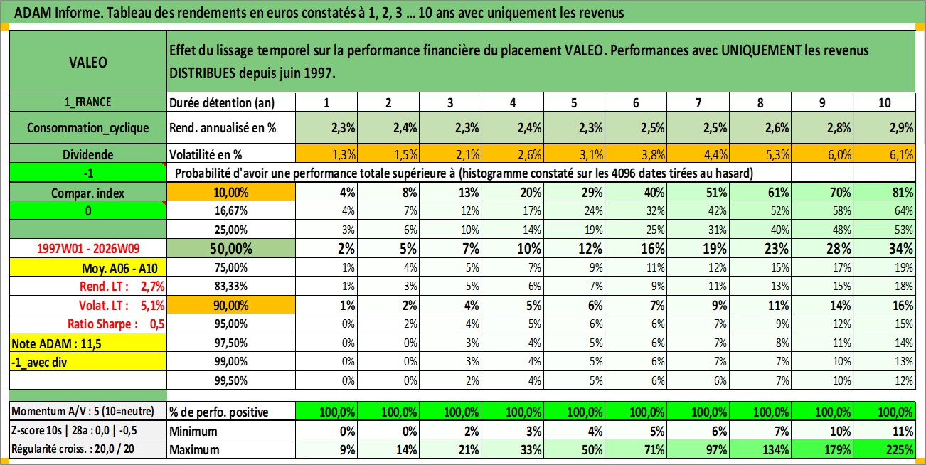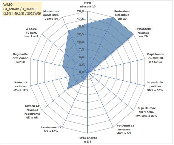 Site dédié aux investisseursPage dédiée sur site financeAnalyse des valorisations hebdomadaires de l'action VALEO. Cet actif est cote en EUR. Les valorisations couvrent les semaines 1997W01 a 2026W09. Les revenus de cet actif financier sont pris en compte depuis la semaine 1997W23. La note globale ESG de cet actif est estimee a 16.0 (apres rebasage entre 0 et 20).