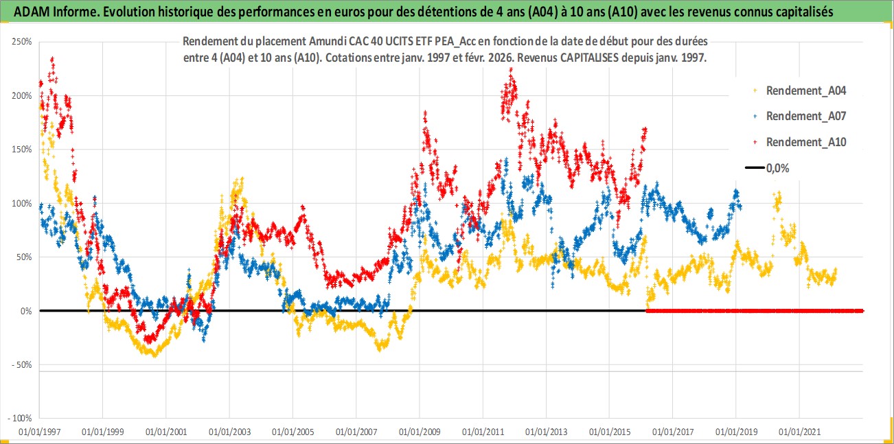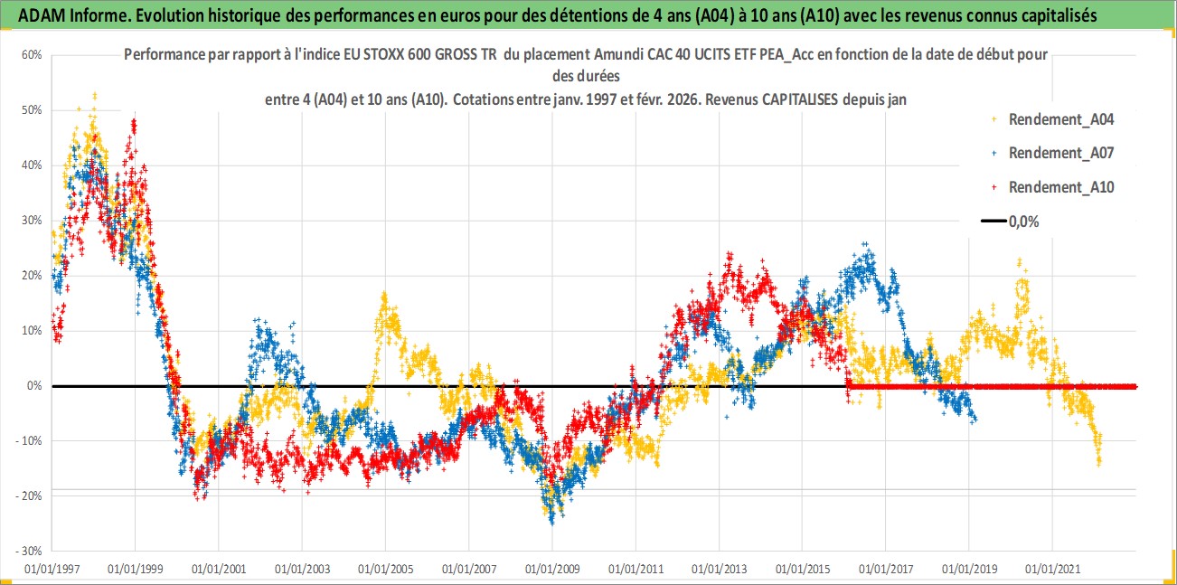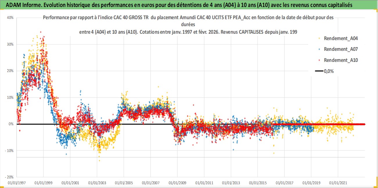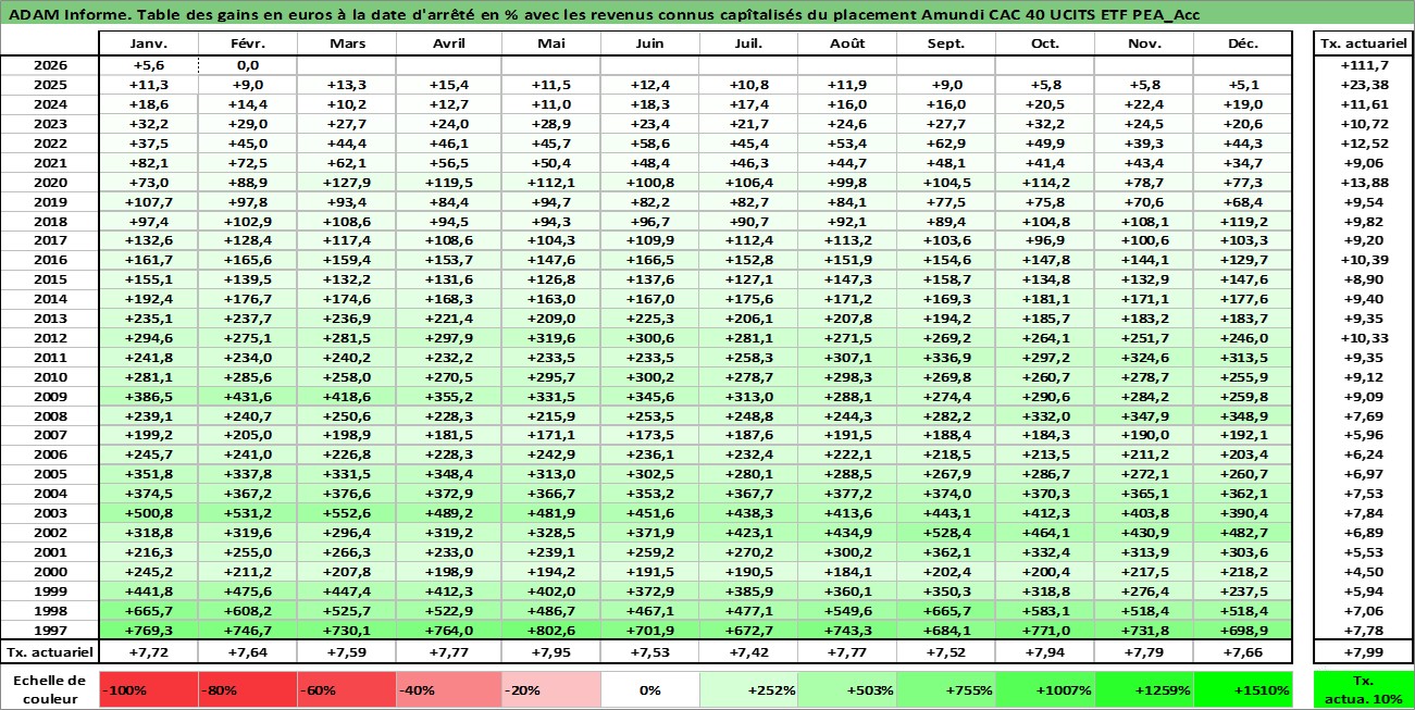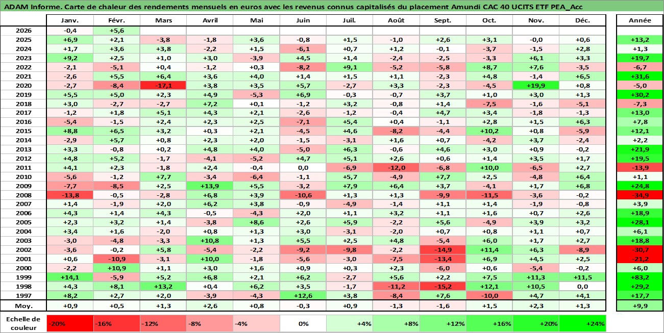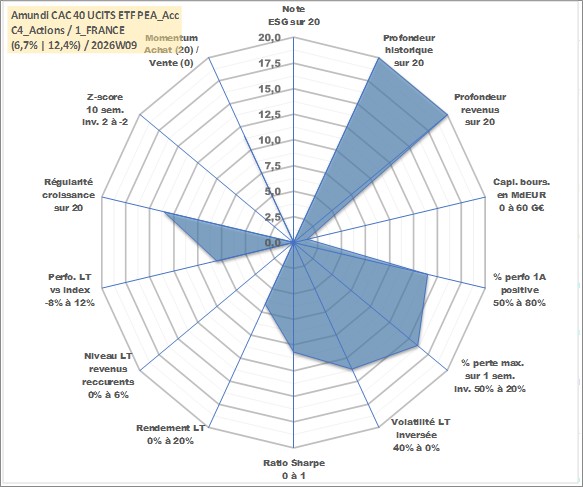 Site dédié aux investisseursPage dédiée sur site financeAnalyse des valorisations hebdomadaires du fonds Amundi CAC 40 UCITS ETF PEA_Acc. Cet actif est cote en EUR. Les valorisations couvrent les semaines 1997W01 a 2026W09. Les revenus de cet actif financier sont pris en compte depuis la semaine 1997W01. La note ESG de cet actif n'est pas connue.