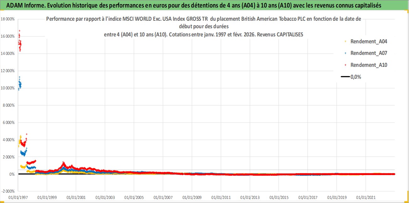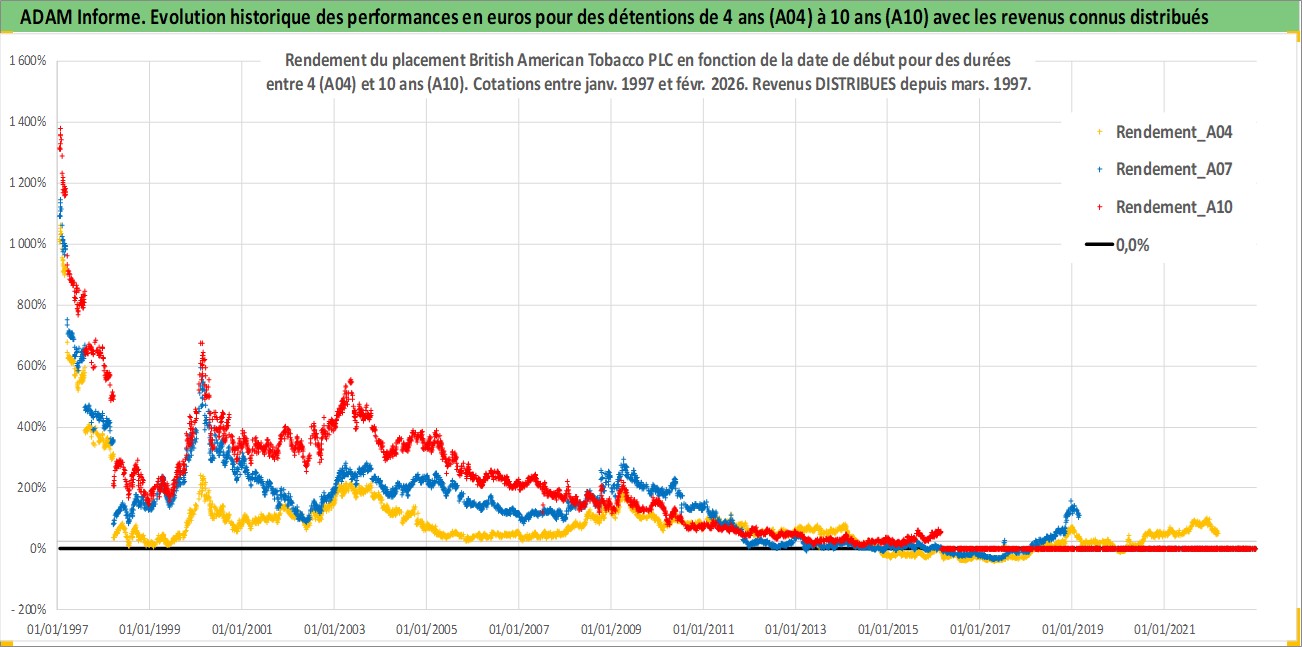 Site dédié aux investisseursPage dédiée sur site financeAnalyse des valorisations hebdomadaires de l'action British American Tobacco PLC. Cet actif est cote en GBX. Les valorisations sont en contrevaleur EURO et couvrent les semaines 1997W01 a 2026W09. Les revenus de cet actif financier sont pris en compte depuis la semaine 1997W12. La note globale ESG de cet actif est estimee a 7.0 (apres rebasage entre 0 et 20).