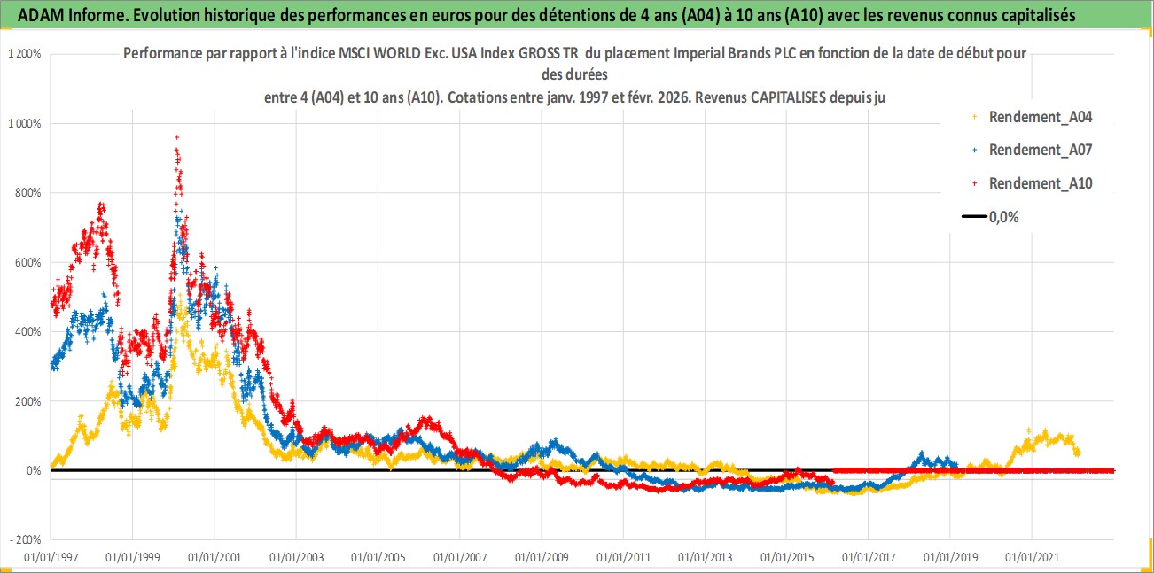 Site dédié aux investisseursPage dédiée sur site financeAnalyse des valorisations hebdomadaires de l'action Imperial Brands PLC. Cet actif est cote en GBX. Les valorisations sont en contrevaleur EURO et couvrent les semaines 1997W01 a 2026W09. Les revenus de cet actif financier sont pris en compte depuis la semaine 1997W23. La note globale ESG de cet actif est estimee a 6.0 (apres rebasage entre 0 et 20).