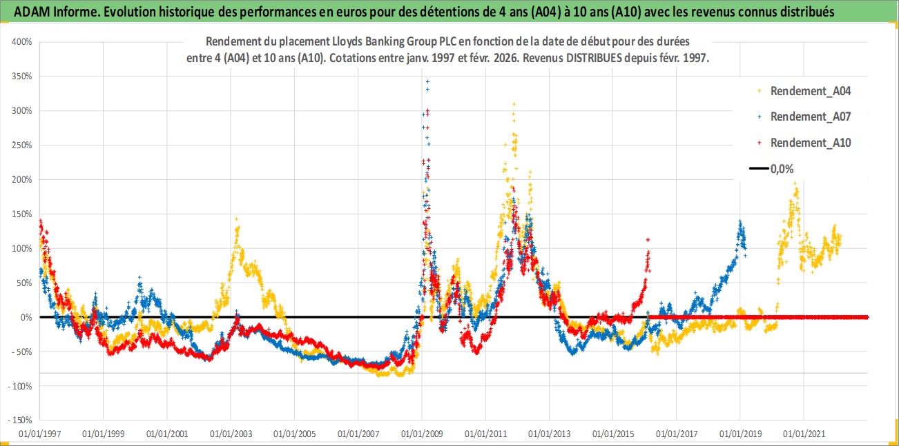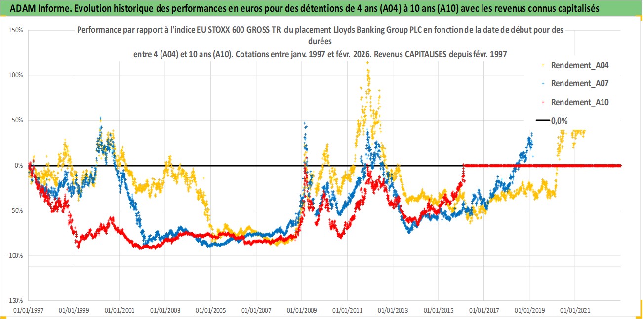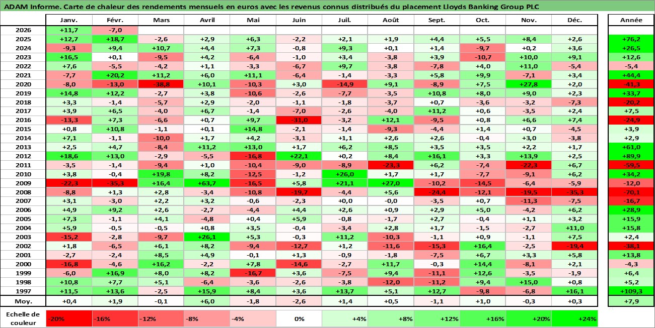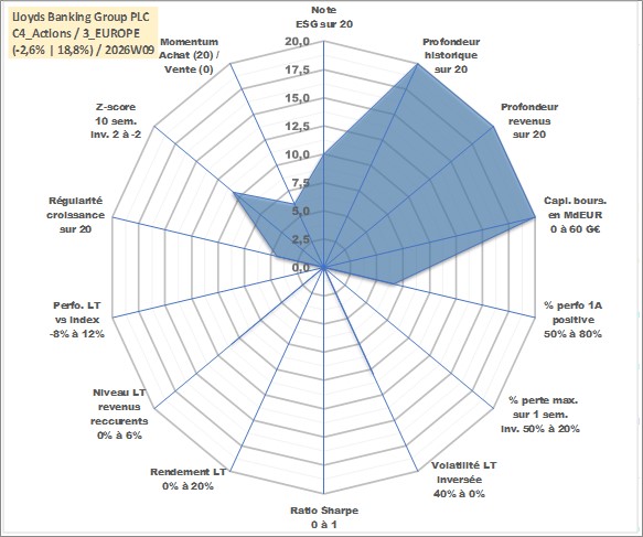 Site dédié aux investisseursPage dédiée sur site financeAnalyse des valorisations hebdomadaires de l'action Lloyds Banking Group PLC. Cet actif est cote en GBX. Les valorisations sont en contrevaleur EURO et couvrent les semaines 1997W01 a 2026W09. Les revenus de cet actif financier sont pris en compte depuis la semaine 1997W09. La note globale ESG de cet actif est estimee a 10.0 (apres rebasage entre 0 et 20).